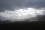 Oben auf dem ersten Kamm ist es eisig kalt, der Regen kommt für ein paar Minuten sogar als Schnee herunter und der Wind weht so stark, dass ich mich mit aller Kraft dagegenstemmen muss, um nicht umgeweht zu werden. Ich habe die Regenhose über der Wanderhose an und die Regenjacke über dem Merinoshirt. Das reicht erstmal, notfalls hätte ich aber noch die Daunenjacke zum Wärmen.