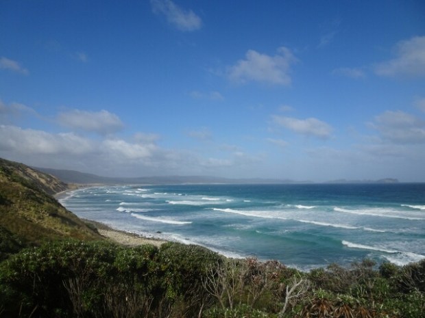 Am Strand von Mason Bay ragt ein Felsvorsprung in Richtung Meer hinaus, so weit, dass man bei Ebbe gut daran vorbeilaufen kann, bei Flut allerdings nicht, weil dann der Felsen direkt im Wasser steht. Es gibt eine High-Tide-Route, die ich aber nicht für notwendig hielt. Es war, als ich dort langgekommen bin irgendwas zwischen High- und Low-Tide. Ein schmaler Standstreifen vor dem Felsen war meistens zu sehen, nur ab und zu kamen größere Wellen, die dann bis an den Felsvorsprung heranreichten. Also dachte ich mir, ich passe die Phase ab, wo die Wellen nicht an die Felsen reichen und laufe schnell um den Vorsprug herum.