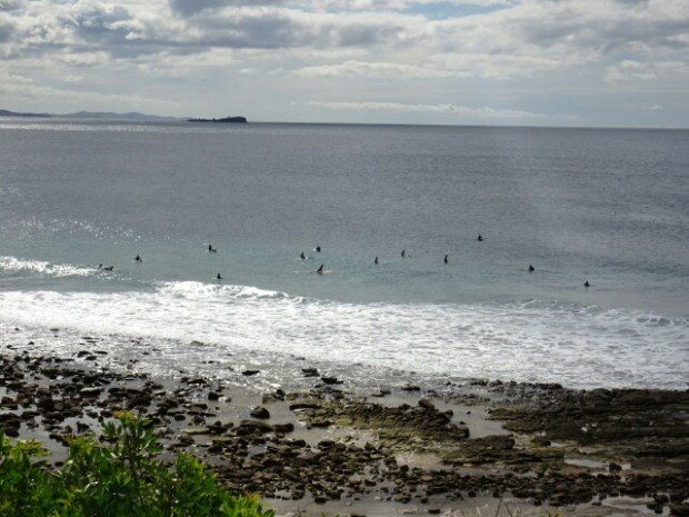 Und dann ist es endlich soweit. Ich leihe mir ein langes Surfbrett und einen Wetsuit und schleppe alles ganz stolz zum Strand, wo sich schon viele andere Surfer im Wasser tummeln. Ich hatte in Brisbane einige Trockenübungen gemacht und festgestellt, dass ich meine Hände nur ein wenig weiter unten aufsetzen muss, damit die Länge meiner Arme zu der Länge der Beine passt und ich gut aufstehen kann. Also stürze ich mich optimistisch in die Wellen und paddle hinaus. Sehr schnell stelle ich allerdings fest, dass die Oberfläche des Bretts zu rutschig ist und ich sowohl mit den Füßen als auch den Händen keinen Halt finde. Ich versuche es einige Zeit tapfer, kann aber nicht aufstehen, wobei es auch schwierig ist, überhaupt das richtige Timing für die Welle zu entwickeln – surfen ist irgendwie gar nicht so einfach, wenn einen niemand anschiebt…