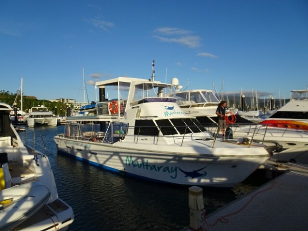 Morgens stehe ich pünktlich um zehn nach sieben vor einem Hostel und werde dort mit einem Minibus abgeholt. Wir fahren noch eine andere Unterkunft an und dann zum Hafen, wo das Boot von „Mantaray“ schon auf uns wartet.