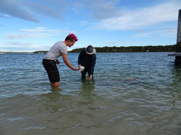 Auf dem Weg in den Norden mache ich in Tin Can Bay halt, weil mein Reiseführer von der Möglichkeit berichtet, dort wilde Delphine füttern zu können. Und tatsächlich gibt es jeden Morgen um acht Uhr diese Gelegenheit – wenn die Delphine vorbeikommen.