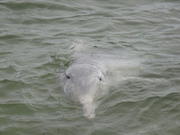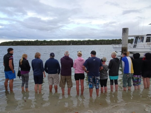 Da es erst pünktlich ab acht Uhr Frühstück gibt, haben wir vorher die Gelegenheit, allerlei interessante Dinge von den freiwilligen Helfern zu erfahren, während wir mit den Füßen im Wasser stehen und die Delphine beobachten.
