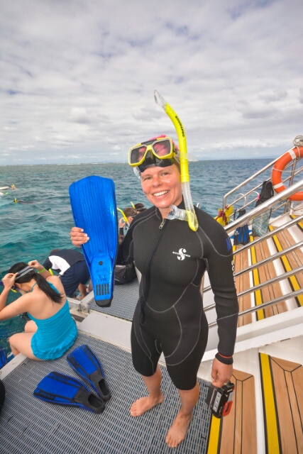 Trotz des langen Neoprenanzugs ist es überraschend kalt im Wasser und ich friere von Anfang an, aber das kann mich nicht abhalten, unablässig über dem Riff entlangzutreiben und begeistert die Unterwasserwelt zu beobachten. Zwischendurch schwimme ich immer mal wieder ein paar Züge, um mich aufzuwärmen und dann werde ich als letztes vom Kapitän eingesammelt. Das war echt fantastisch – und ich freue mich jetzt noch mehr auf den Ausflug zum Great Barrier Reef!