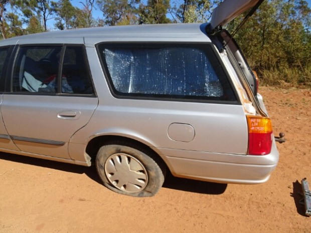 Der Reifen hinten links war platt…aus Respekt vor den Road Trains fuhr ich auf den breiteren Seitenstreifen auf der rechten Straßenseite und suchte das Werkzeug heraus. Der Ersatzreifen war unter dem Auto angebracht und wurde mithilfe einer raffinierten Kurbellösung nach unten transportiert.