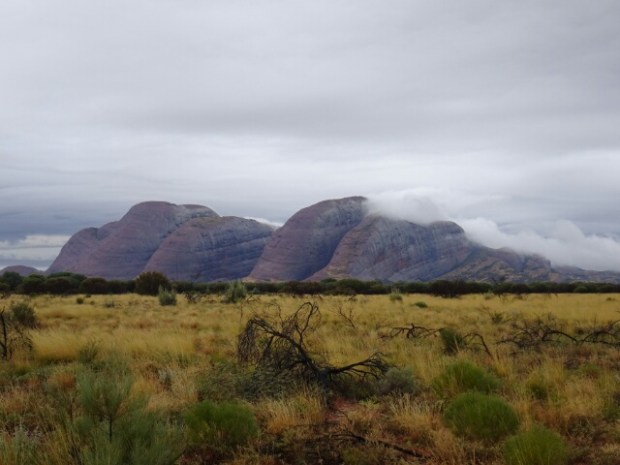 Ich habe auch Kata Tjuta besucht, die nochmal 50km vom Uluru entfernt sind und mir die großen, abgerundeten Felsen auf einem kurzen Spaziergang (natürlich bei Regen) angesehen.
