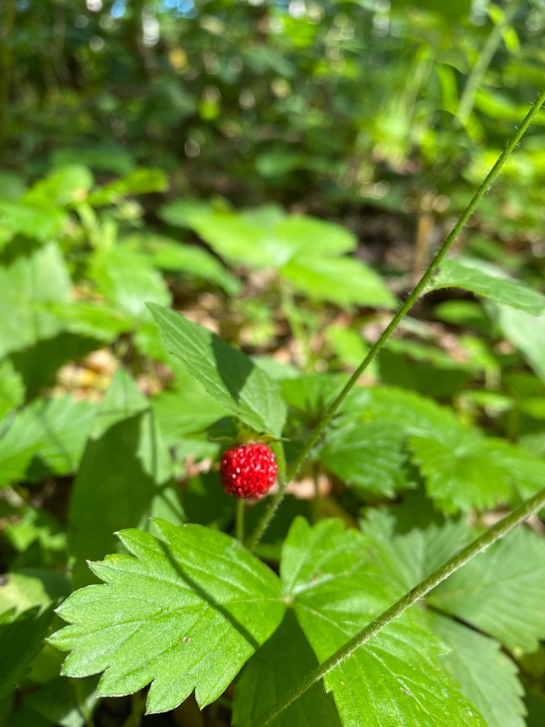 Und in einem der kurzen Waldstücke stehen am Wegesrand auch noch Walderdbeeren – mjam, sie sind sehr lecker und ich nasche ein paar, lasse aber die Meisten für nachfolgende Wanderer übrig, hauptsächlich weil ich keine Lust auf das ständige Bücken habe. 😉