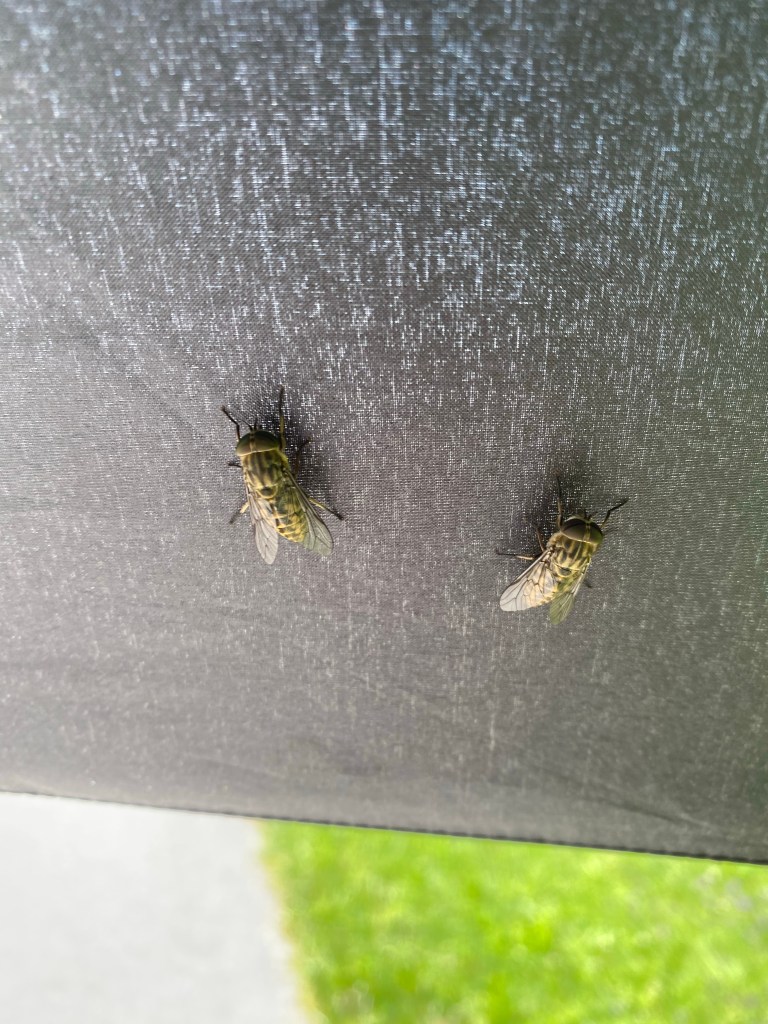 Viel angenehmer war hingegen – mal wieder – mein Schirm, der mir ausreichenden und bequemen Schutz vor der prallen Sonne bot, die heute von einem fast wolkenfreien Himmel strahlte. Und ich war nicht die Einzige, die die Vorzüge des mobilen Schattens zu schätzen wusste. Sofort wenn ich den Schirm aufspanne, schwirren dicke, fette Fliegen um mich herum und lassen sich auf der Innenseite des Schirms nieder. Stört mich im Grunde nicht und ich gebe gerne etwas Schatten ab, aber einige der Brummer könnten noch etwas an ihren Flugkünsten feilen und mir nicht direkt vorm oder im Gesicht herumfliegen…
