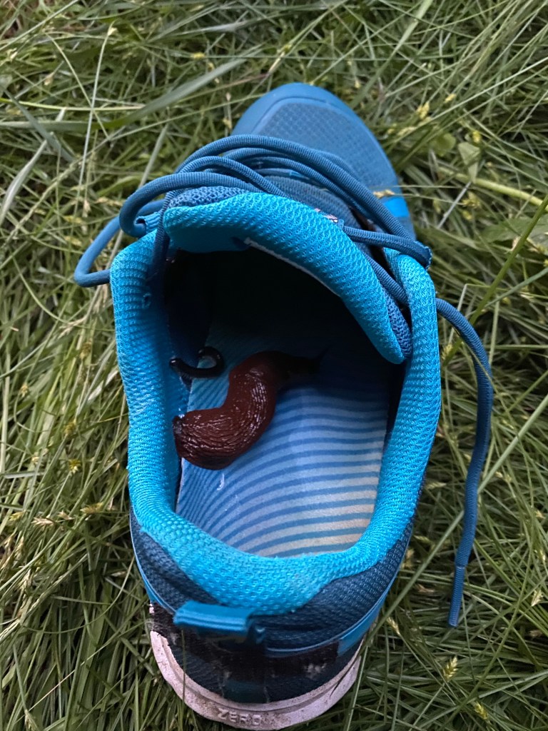 Das war jede Nacht mein Horrorszenario – dass ich barfüßig in meine Schuhe schlüpfe um Pinkeln zu gehen und dann irgendwas in den Schuh gekrabbelt ist! Deswegen schüttel ich meine Schuhe auch jedes einzelne Mal aus, bevor ich sie anziehe – aber hier hätte auch Schütteln nicht geholfen. Zum Glück war es schon hell und ich konnte die dicke, fette Nacktschnecke und den kleinen, schlanken, schwarzen Bruder rechtzeitig erkennen.