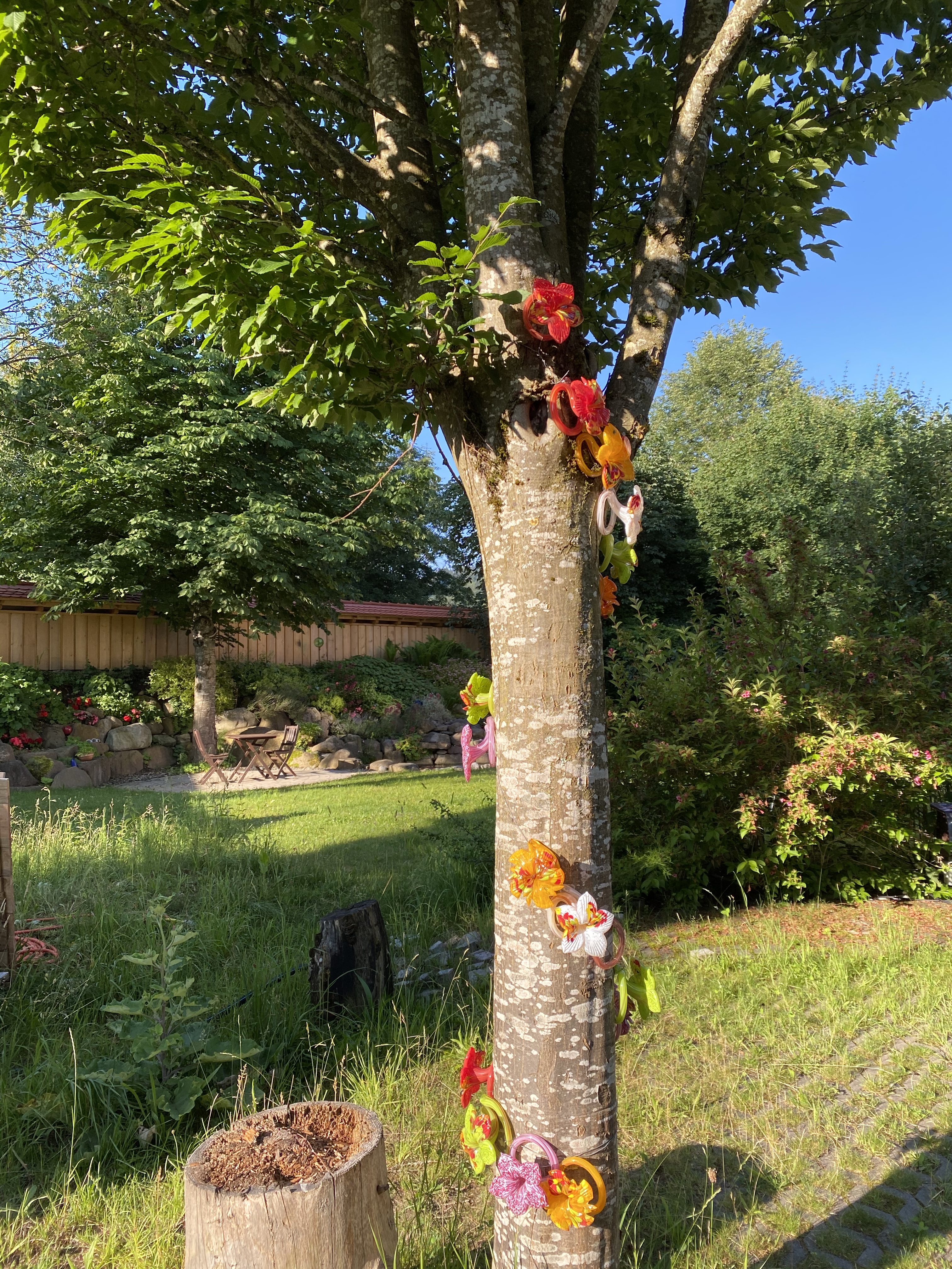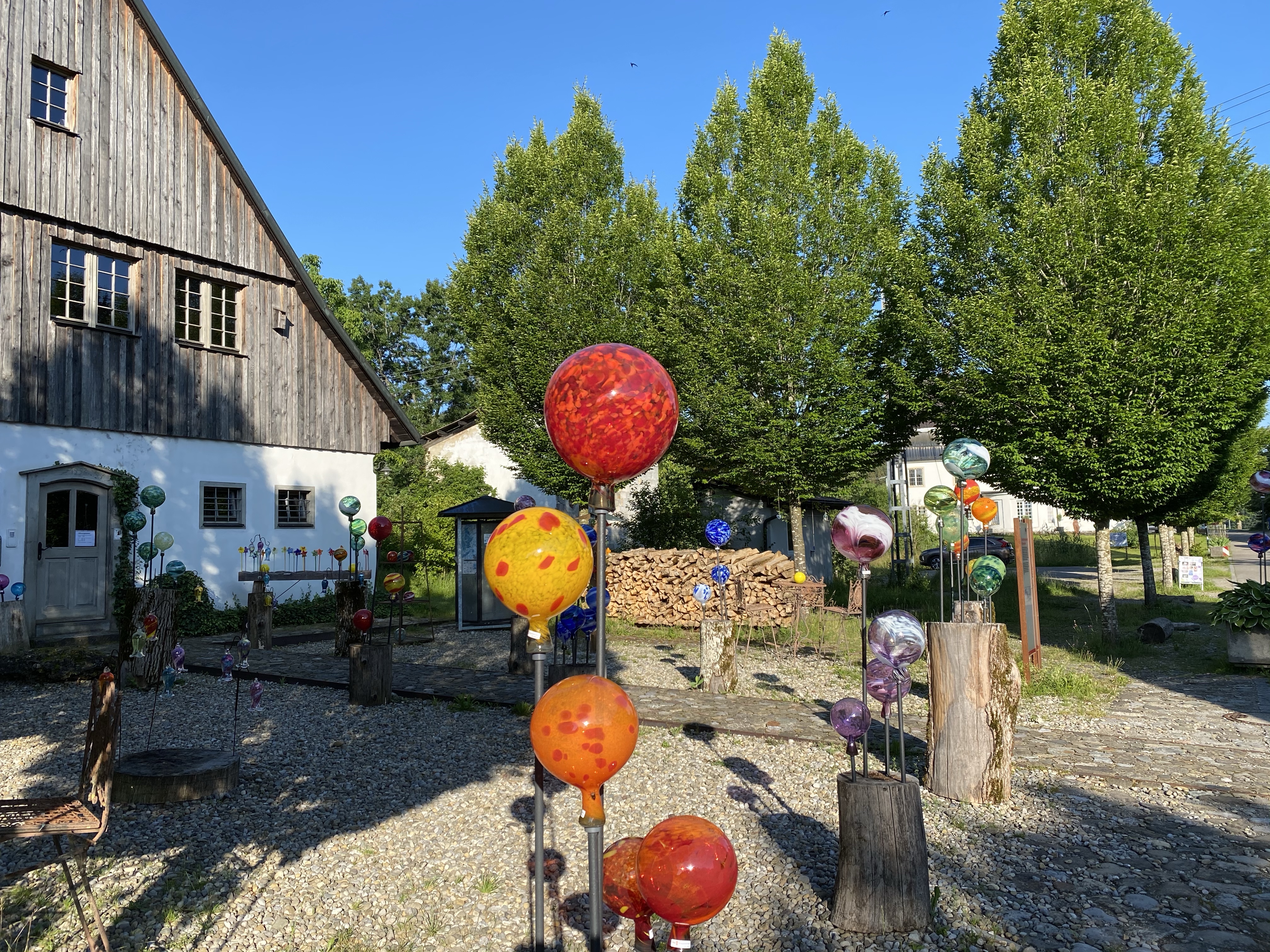 Der Vormittag war dann aber ganz normal und sehr schön. Der Weg führte zunächst den Berg hinunter in das Glasmacherdorf Schmidsfelden, wo es bunt glitzerte und glänzte, als die Sonne auf die Kunstwerke traf.