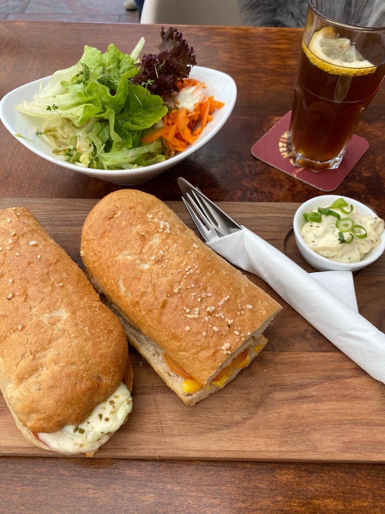 Ich gönne mir eine Seele mit Mais, Tomaten und Gurke, die mit Käse überbacken werden und dazu einen Salat. Die Seele ist aus Dinkelmehl – wie so ziemlich alles hier in der Gegend. Bei jedem Bäcker und Café stehen überwiegend Dinkel-Waren und -Kuchen ausgeschrieben, Weizen scheint hier nicht so üblich zu sein…