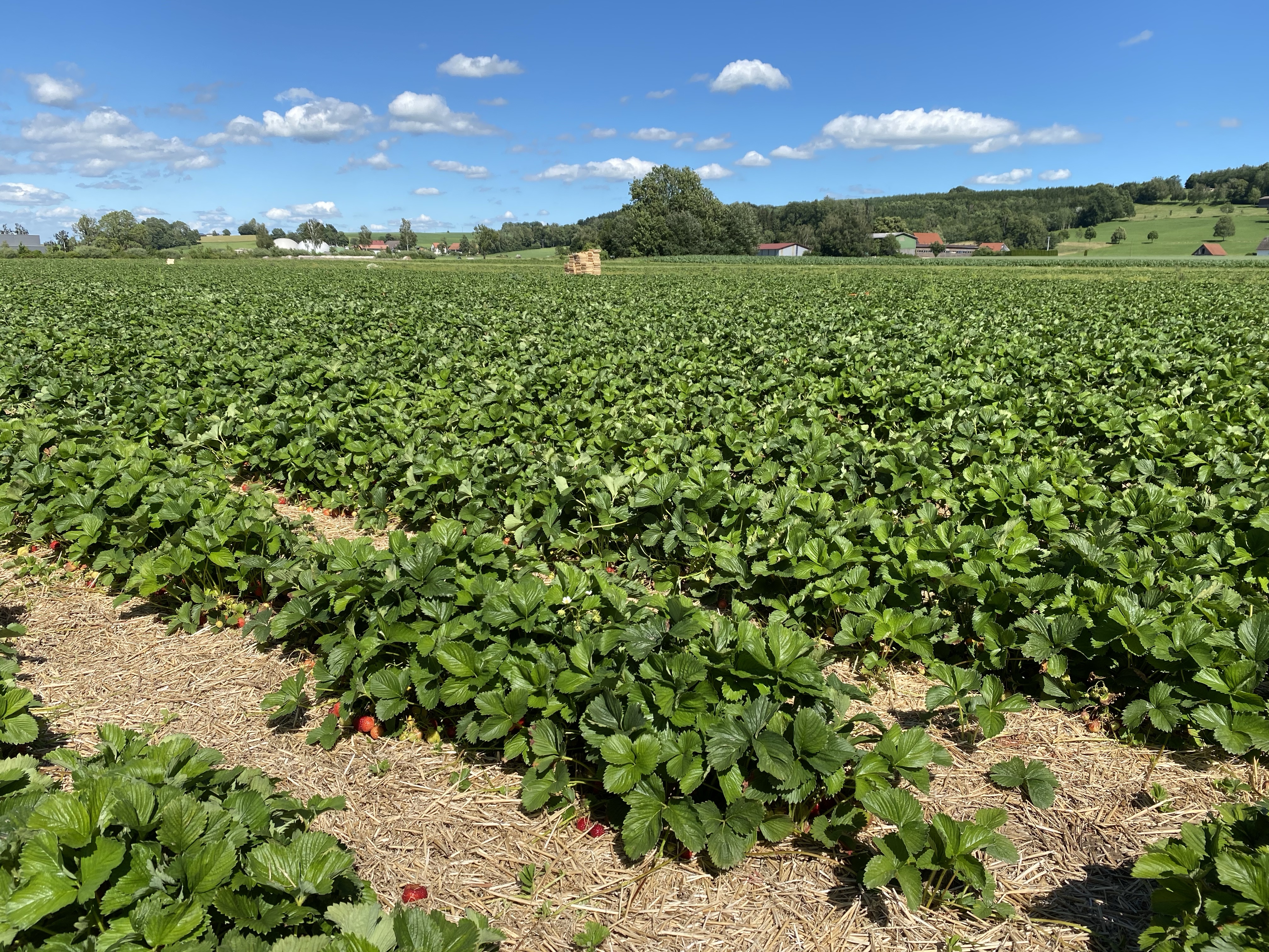 Ich muss also noch mindestens neun Kilometer laufen, um wieder zu einem richtigen und relativ einsamen Wald zu kommen – aber das ist heute überhaupt kein Problem für mich. Ich komme sehr gut voran und kurz vor Ziegelbach ziehe ich auch noch das große Los – vor (bzw. neben) mir liegt ein Erdbeerfeld…die Früchte leuchten mir blutrot entgegen. Auf dem Feld sind leere Holzstiegen aufgetürmt und die Wagen, mit denen die Pflücker durch die Reihen rollen, stehen auch im Feld, aber es ist niemand da.
