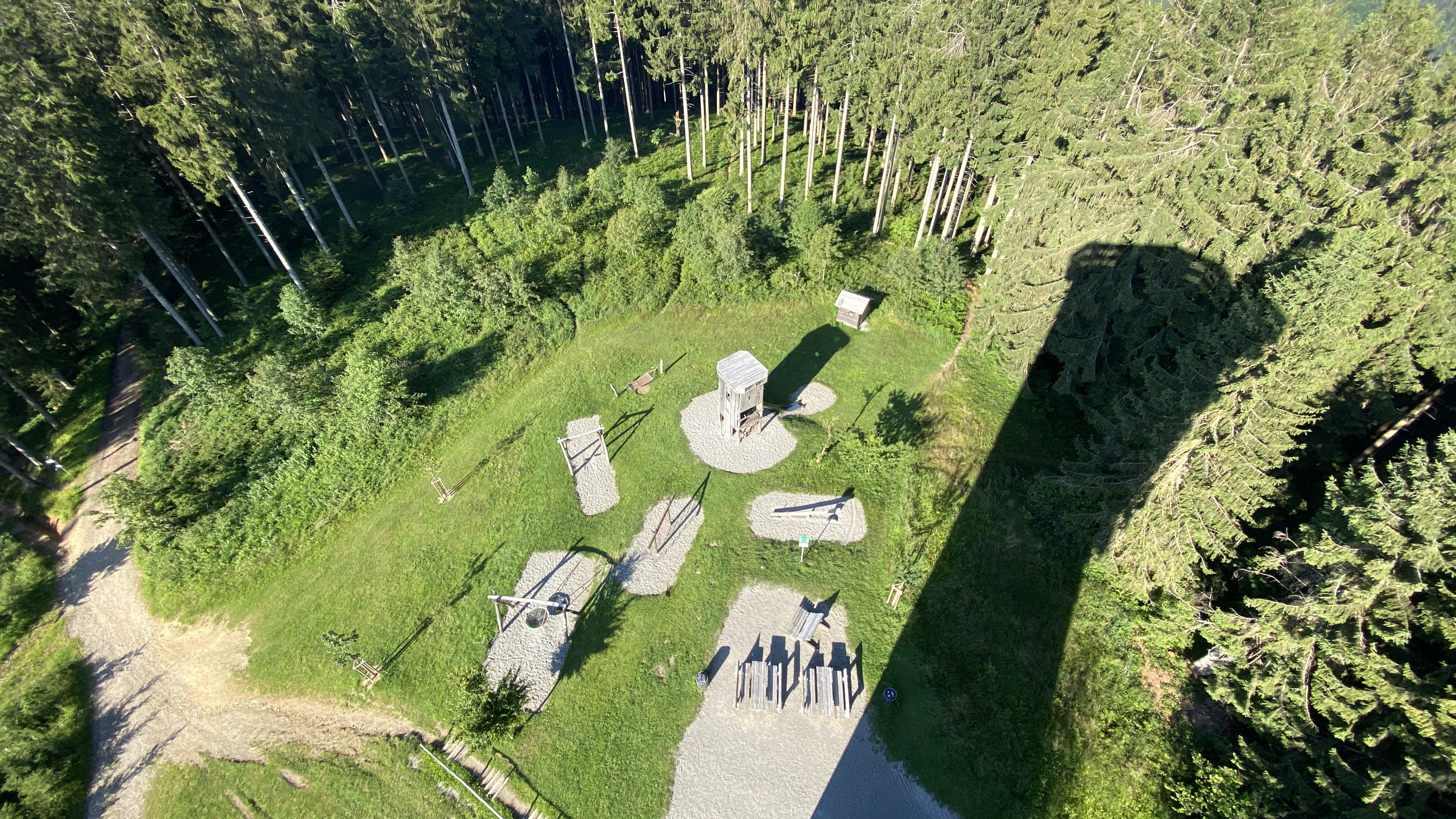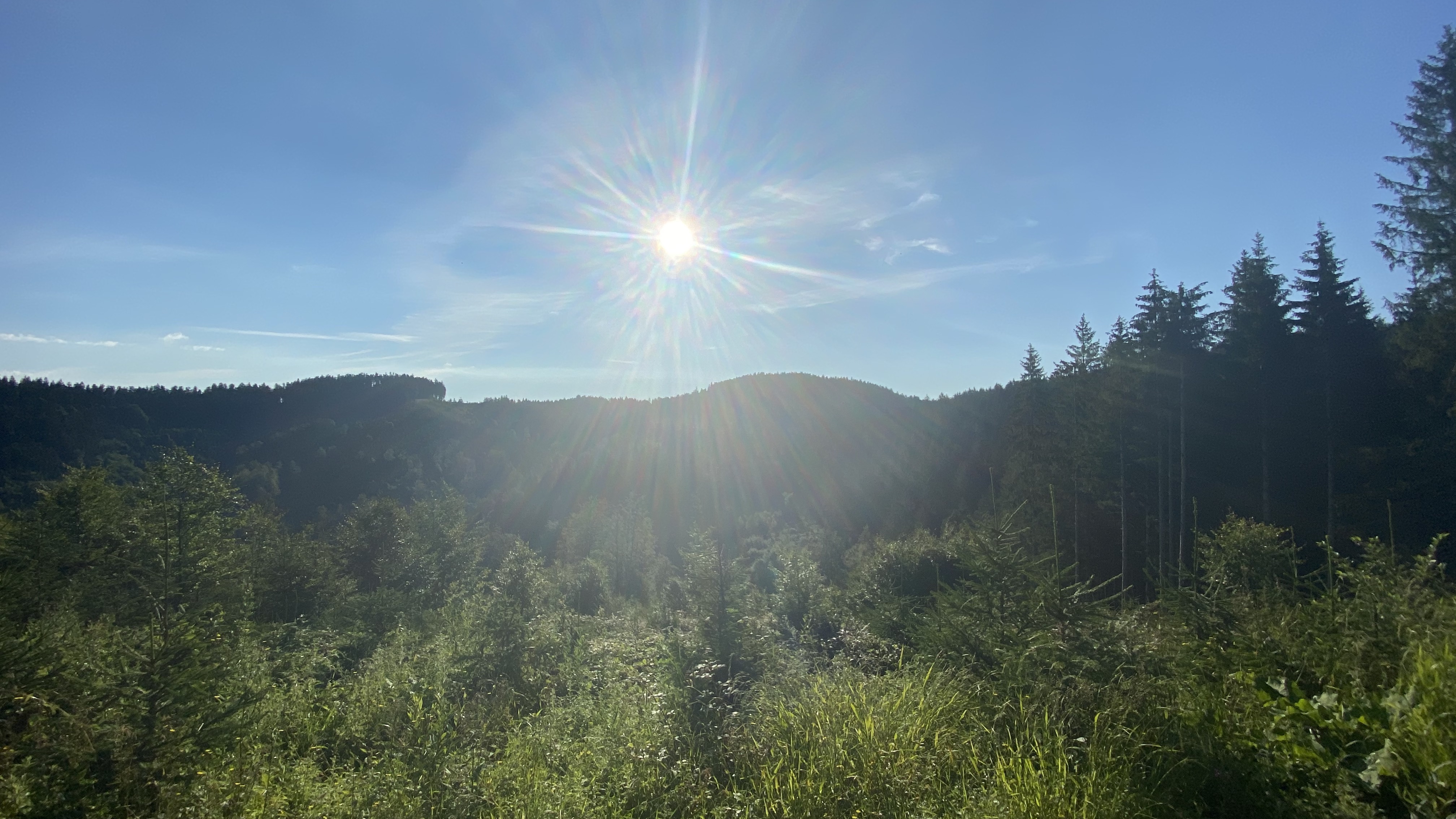 Der erste Abschnitt bis nach Bolsternang verlief auch gut, ich genoss die Morgensonne und die saftigen Himbeeren. Der Anstieg zum schwarzen Grat auf 1150 Metern war dank Schotterwegen auch kein Problem. Oben erwartete mich eine Überraschung…ein großer Spielplatz, WC und ein hoher Aussichtsturm…das hätte ich jetzt nicht alles erwartet.