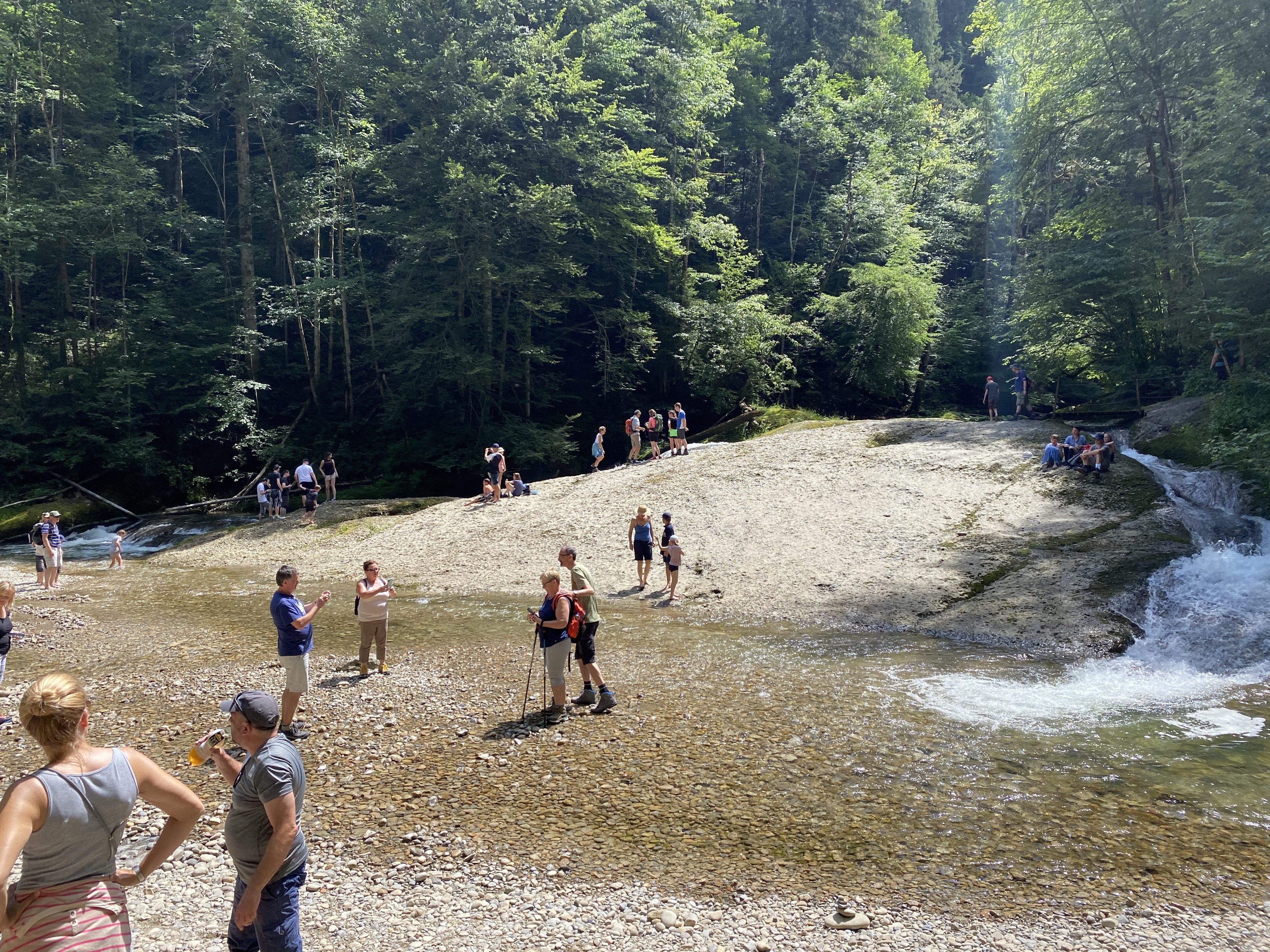Es ist wie erwartet relativ voll, im und am Wasser planschen Kinder und Familien picknicken. Die Stege und Wege sind voll und ständig muss man warten, bis der Gegenverkehr durch ist.