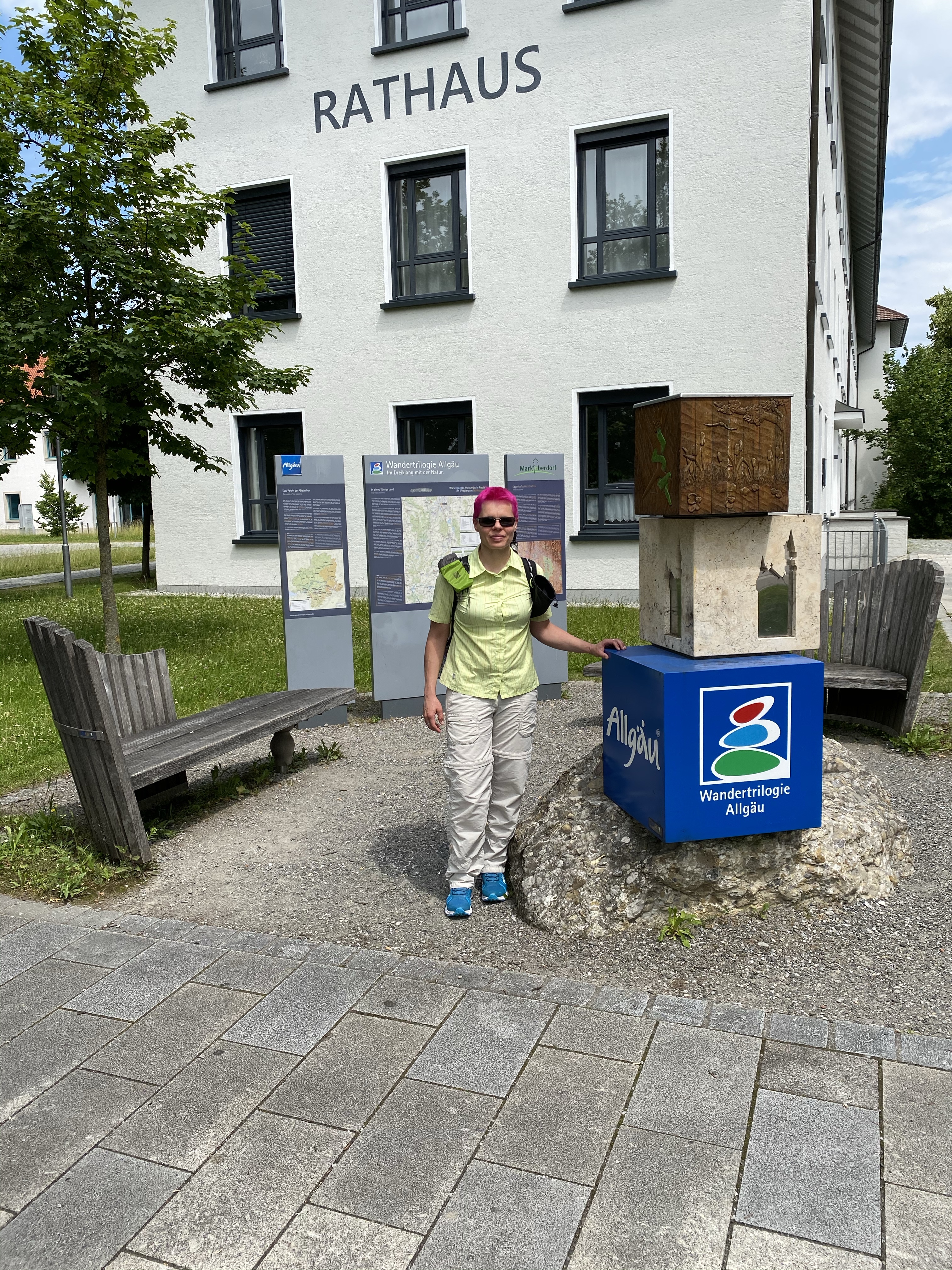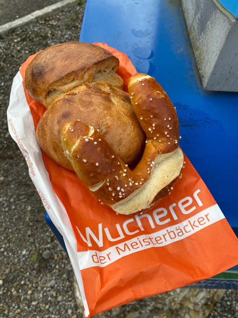 In Weiler im Allgäu statte ich dem Steinmännle meinen Pflichtbesuch ab und kann an dem Bäcker, der schon um sechs Uhr aufmacht nicht vorbeigehen. Die Doppelsemmel entpuppt sich als kleines Doppelbrot…ich esse nur eine Hälfte, die suuuuuper lecker ist und spare mir die andere für die Zugfahrt auf.