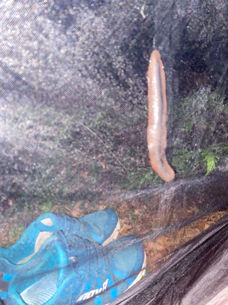 Die letzte Nacht auf dem Trail war gut. Ein gerader, weicher, ruhiger Platz, warm (ein wenig zu warm tatsächlich) und trocken – zumindest unter meinem Tarp. Draußen hat es einmal geregnet, aber auch nicht stark und viel. Morgens kann ich deshalb eine fast trockene Plane einpacken. Ich muss nur aufpassen, dass ich keine blinden Passagiere mit nach Berlin bringe, die im letzten Moment eine günstige Gelegenheit wittern.