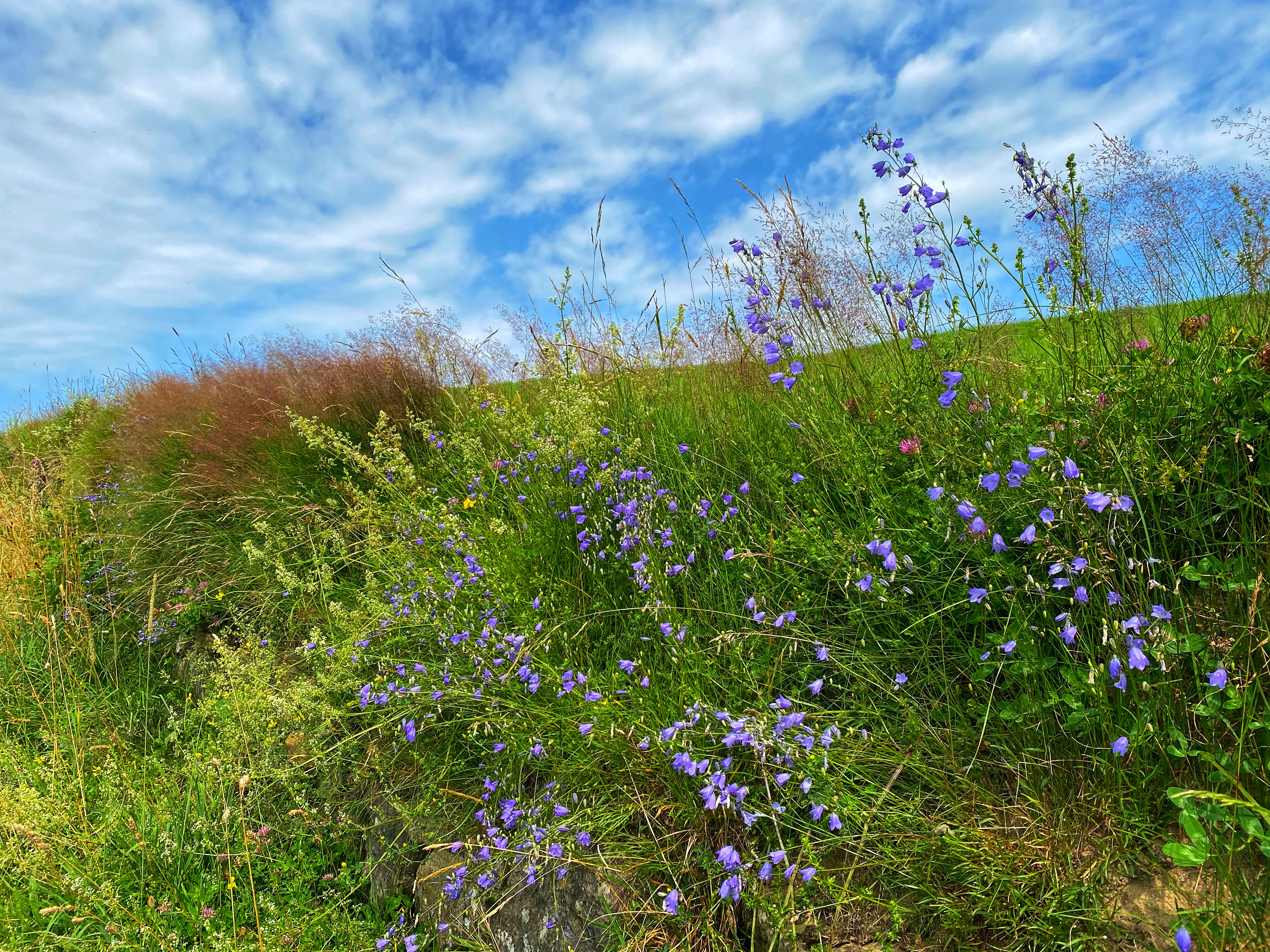Ein Großteil der Strecke führt wieder über freies Feld und die Sonne scheint entgegen der Vorhersagen von einem nur sehr spärlich mit Wolken bedeckten Himmel. Außerdem ist es total schwül – das Gewitter heute Abend ist vorprogrammiert, hilft mir jetzt aber nicht, wenn ich im Schweiße meines Angesichts die Wege hochstapfe.