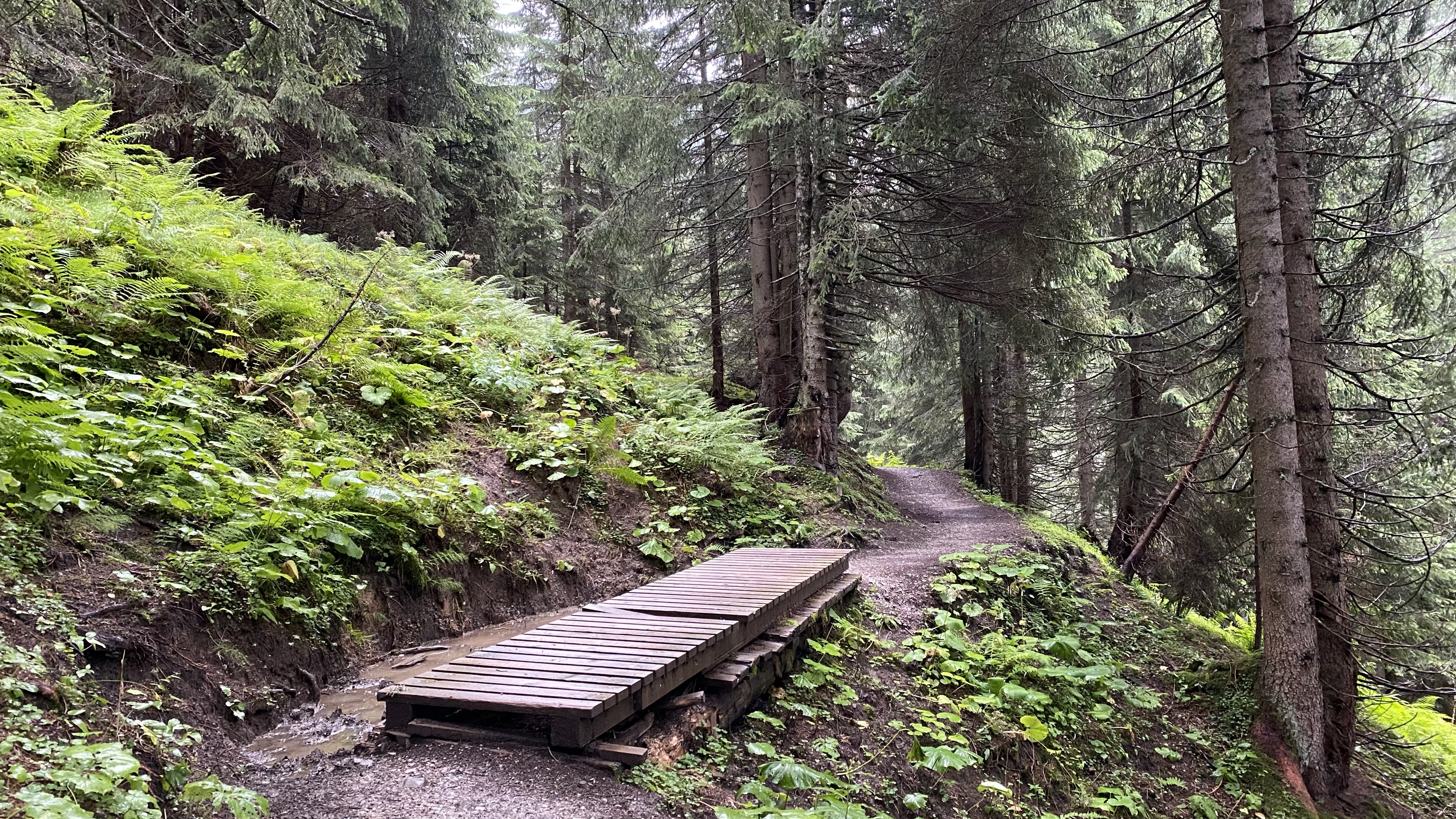 Und danach muss ich 900 Höhenmeter nach unten…ich brauche zwei Stunden und es nervt ganz schön. Auch wenn etwas Abwechslung enthalten ist, weil es erst Serpentinen über Wiesen, dann Serpentinen durch Wald auf Wurzeln und dann Serpentinen durch Wald auf Steinen sind, aber bergab wandern wird mir wohl nie Spaß machen. Als Rentnerin werde ich sicherlich nur noch bergauf laufen und dann ganz gediegen die Seilbahn runter ins Tal nehmen. 🙂
