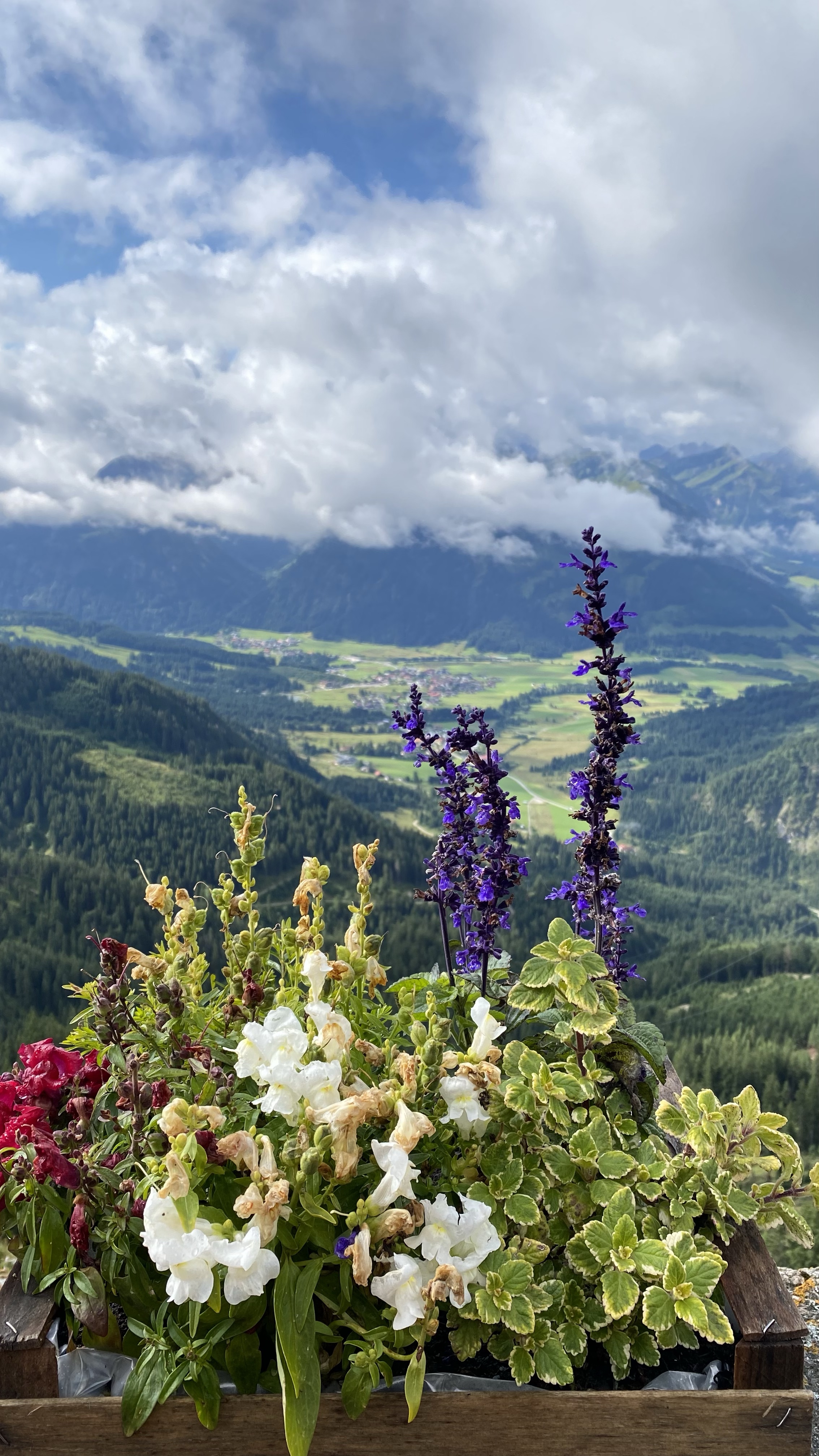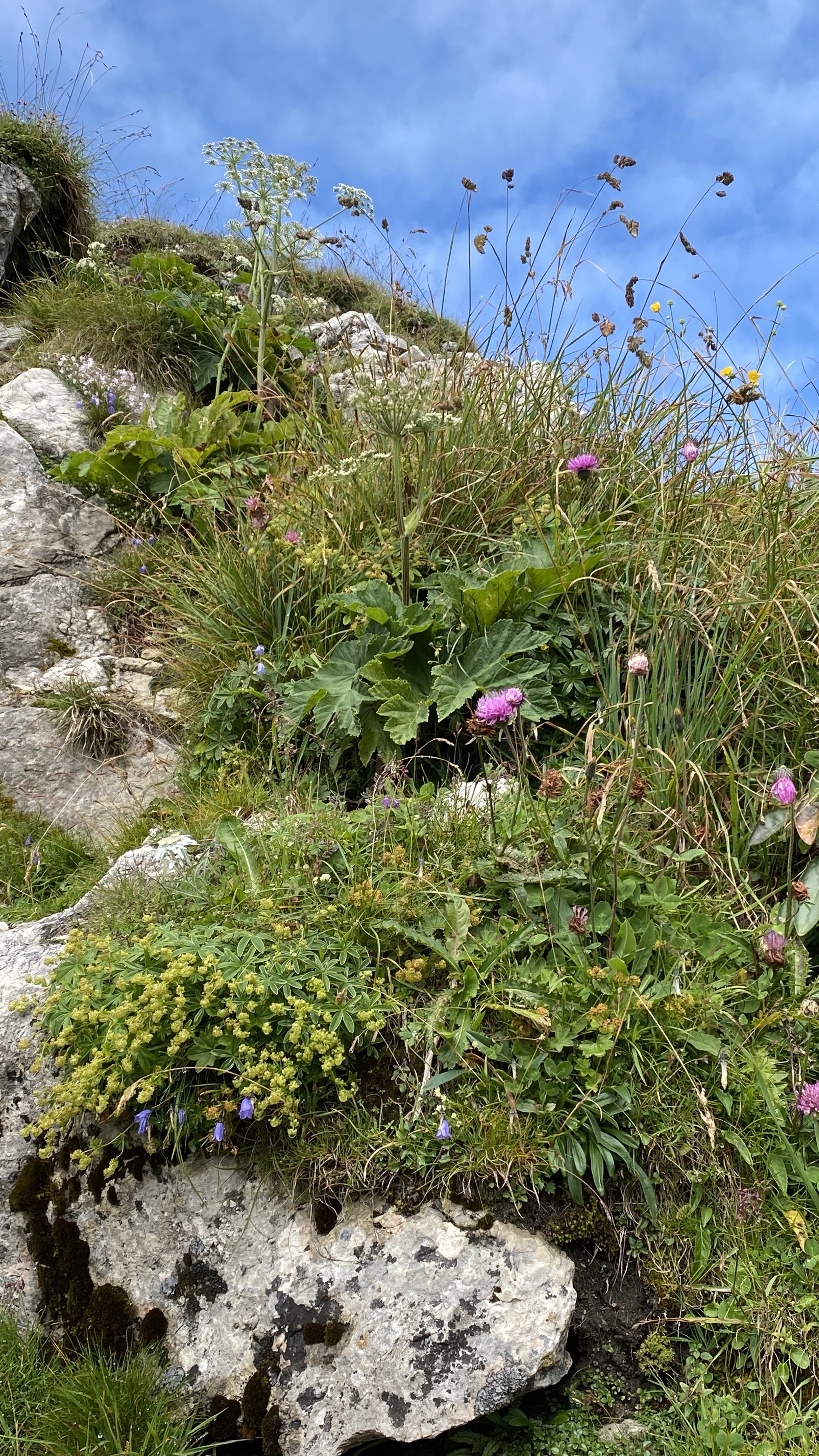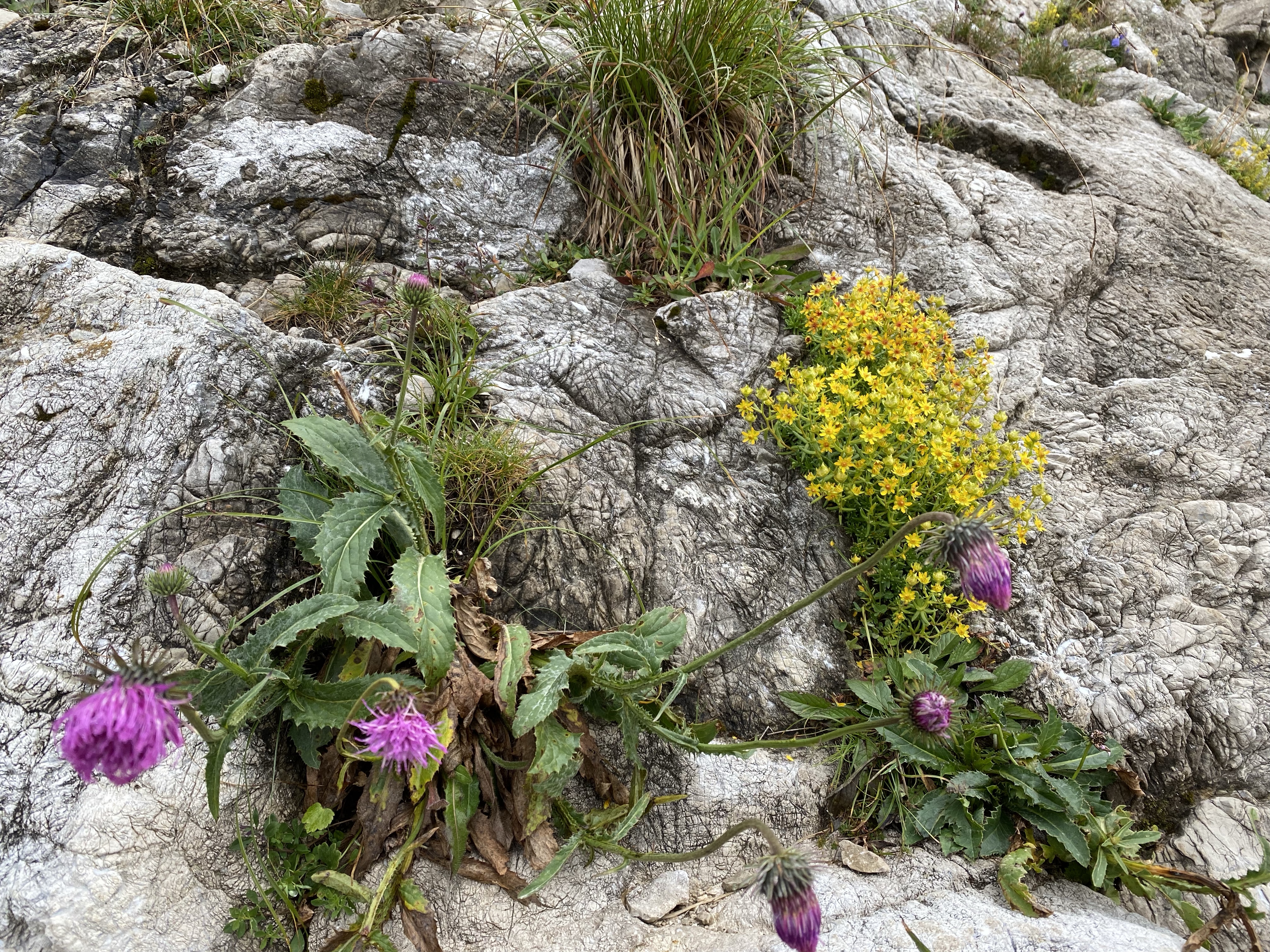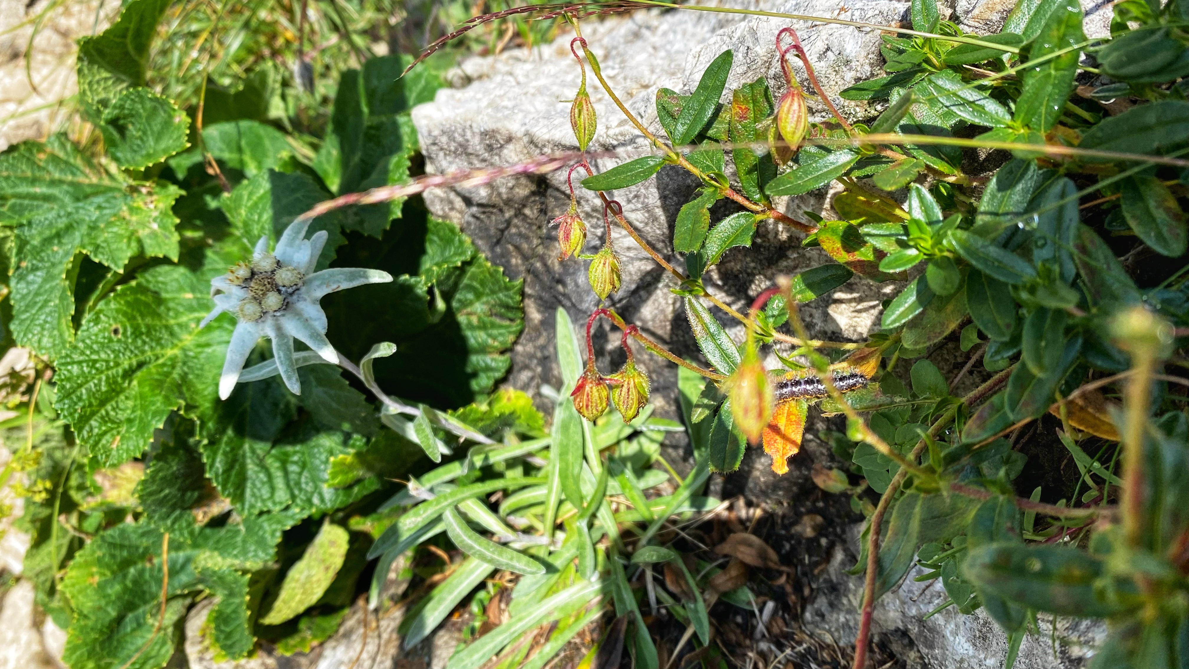 Edelweiß! Ich bin sofort Feuer und Flamme und möchte ihn mit eigenen Augen sehen. Schon die ganzen letzten Tage frage ich mich, ob es hier in den Alpen diese seltene Pflanze gibt und wenn ich sie jetzt endlich sehen könnte, wäre das das Sahnehäubchen auf dieser schönen Schlussetappe.
