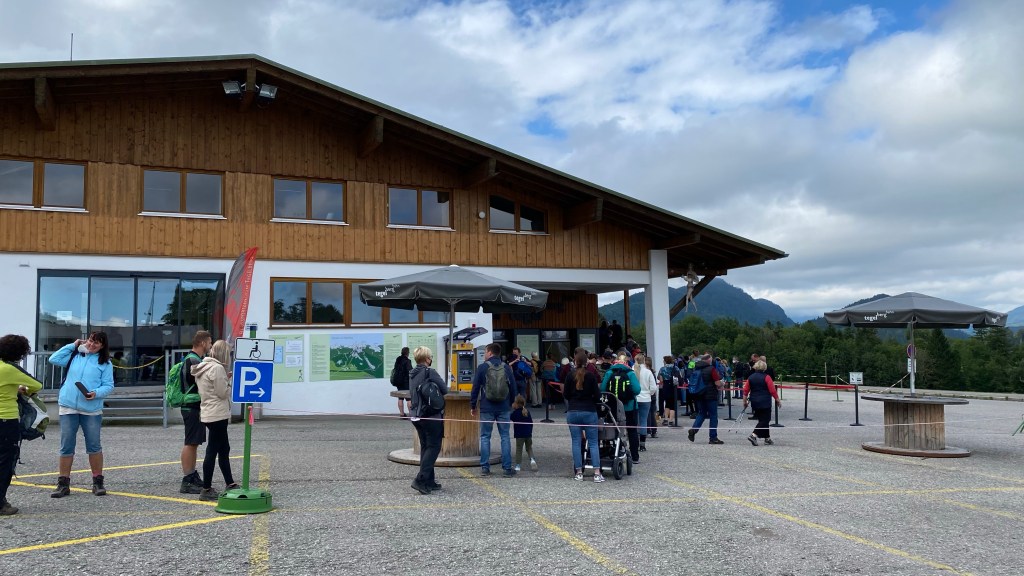An der Kasse geht es zwar schnell, aber die Tegelbergbahn hat nur zwei Gondeln im Einsatz, so dass es immer ewig dauert, bis der nächste Schwung von 30 Personen einsteigen und hochfahren kann.