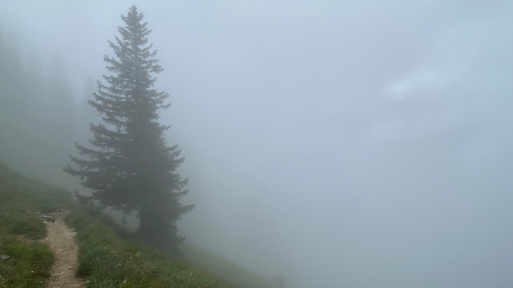 Als ich dann an der entscheidenden Kreuzung bin, kann ich aber immerhin gut 50 Meter weit sehen und die Hochplatte ist nur auf einer Seite in Wolken getaucht.