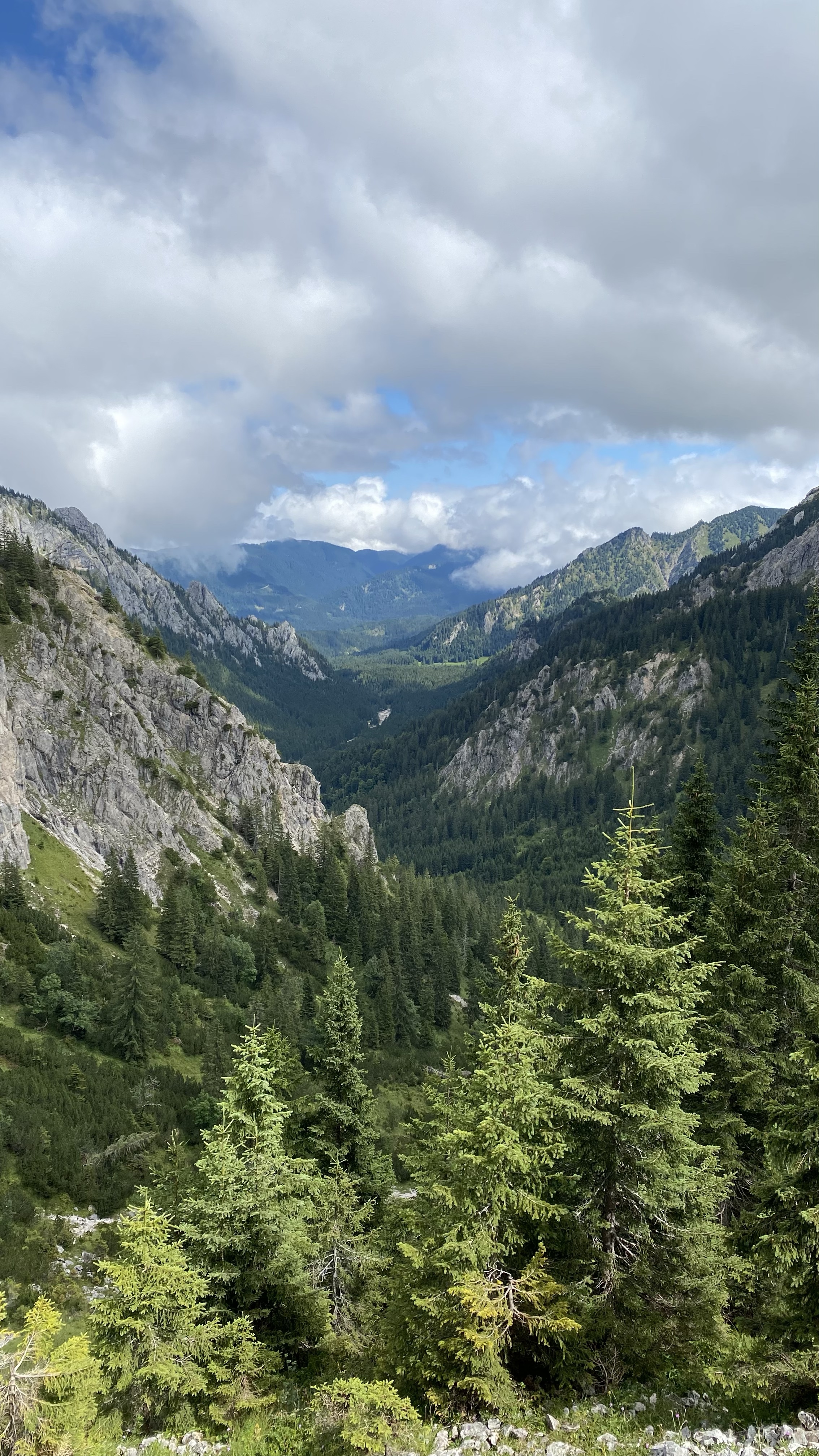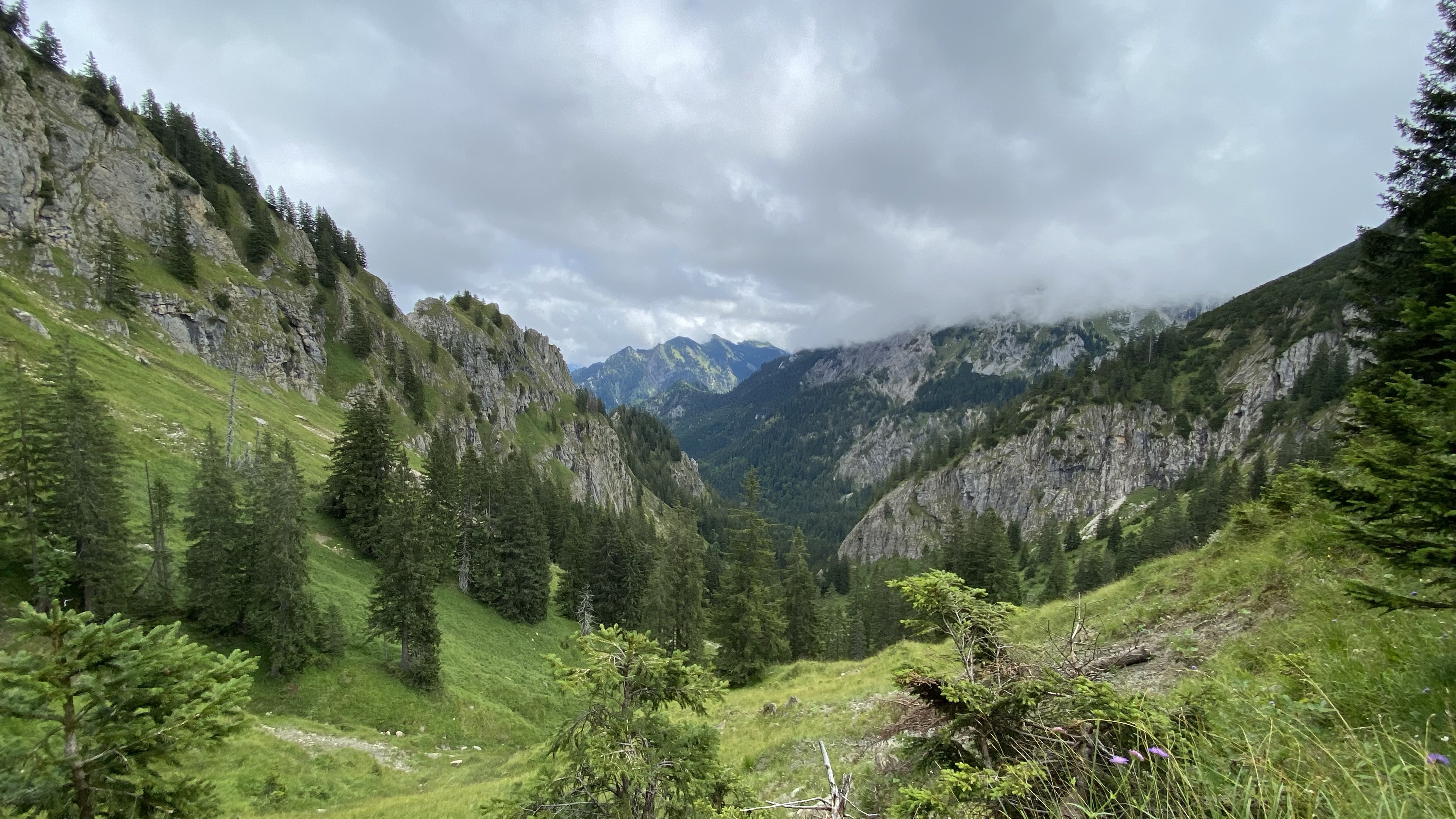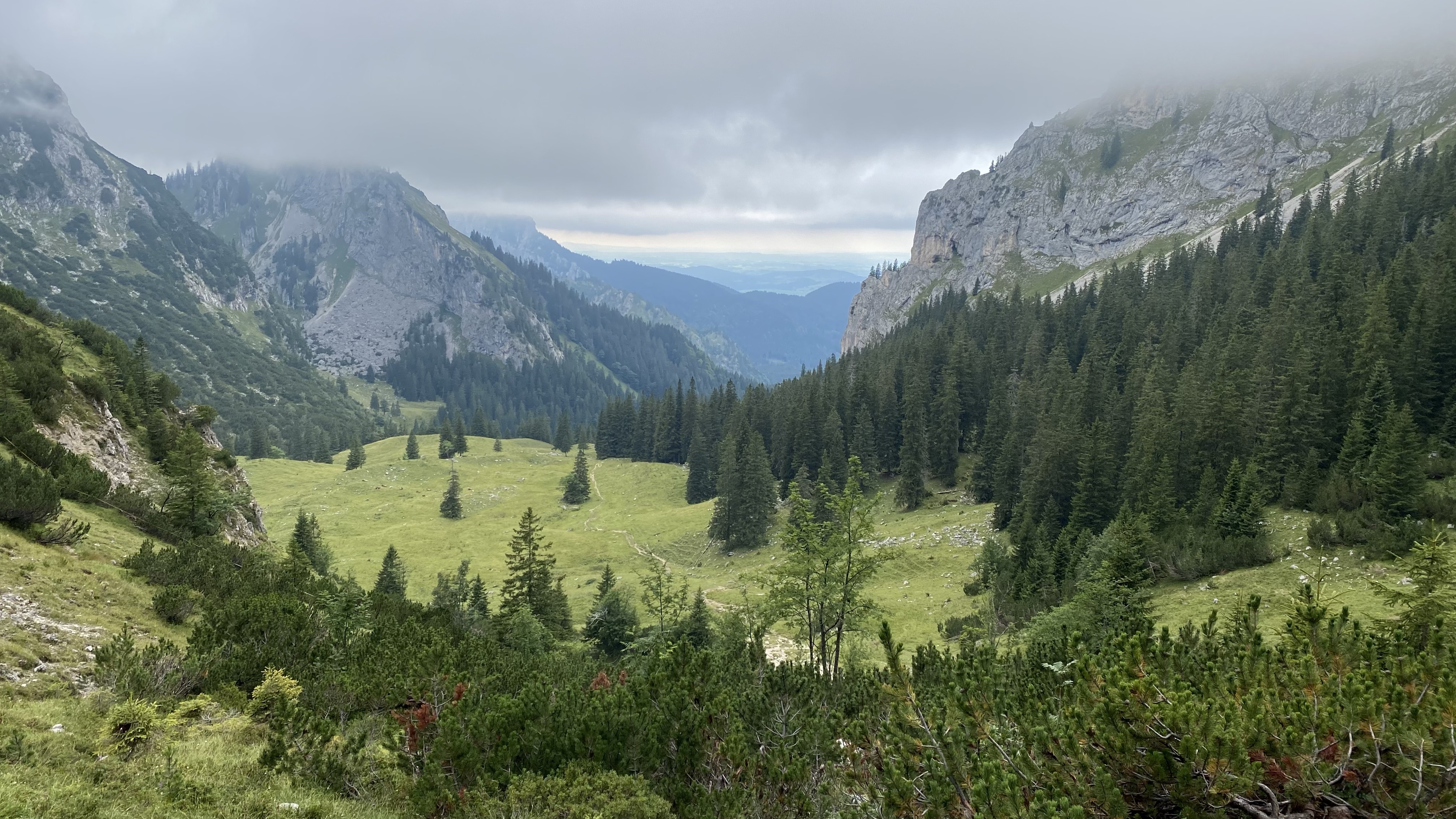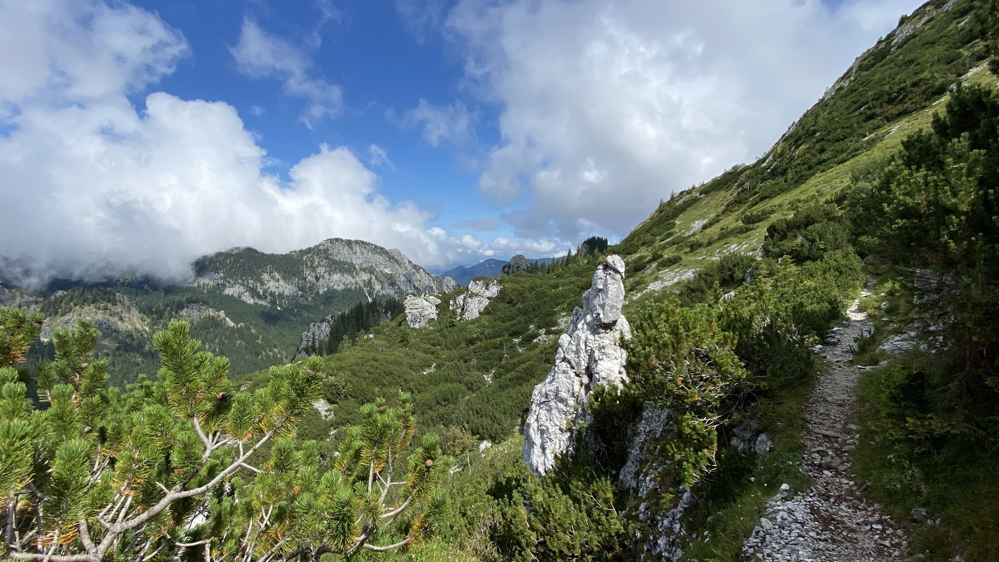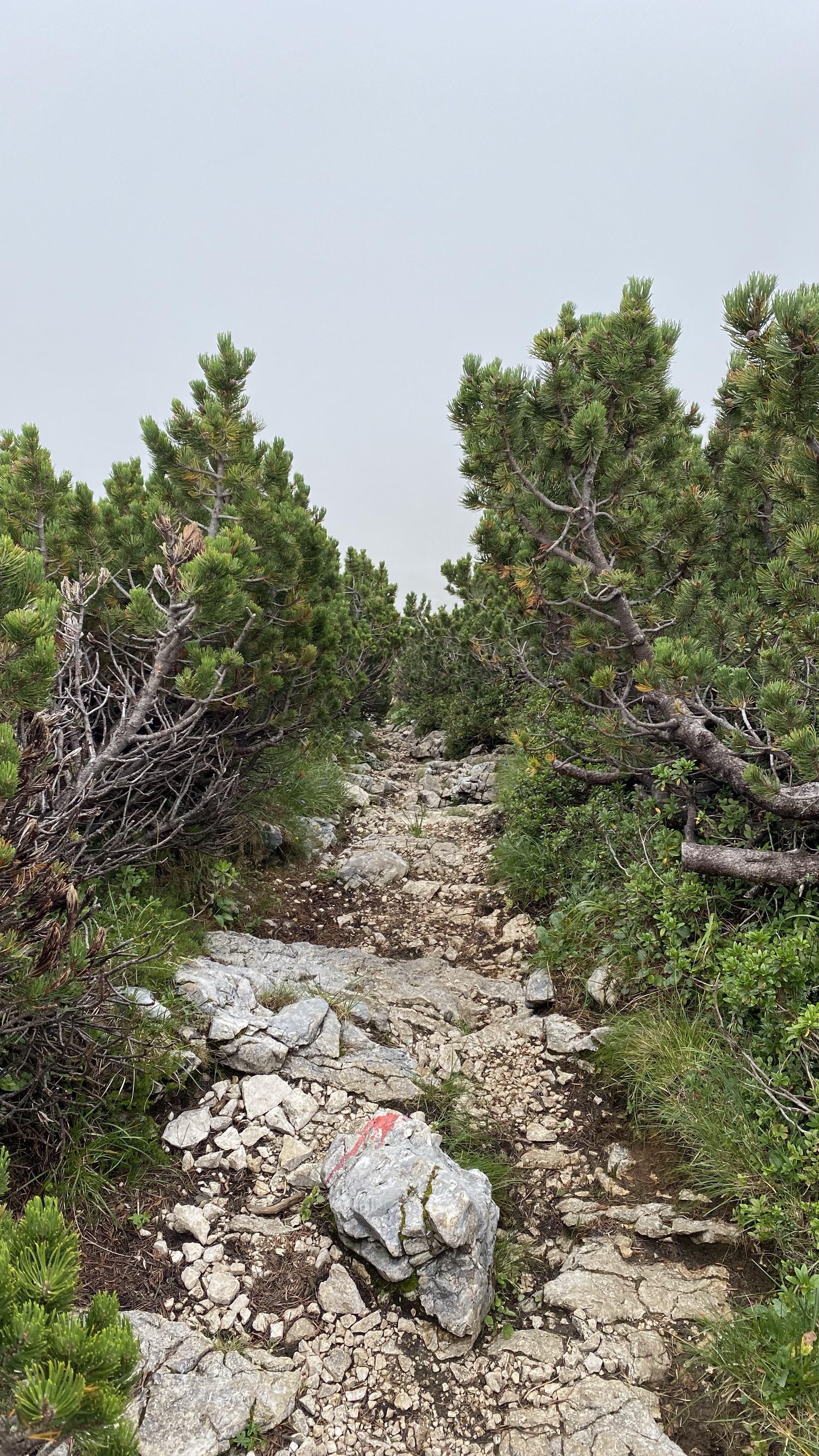Zunächst geht es über Geröll nach unten, dann durch Zwergkiefernbestände auf großen Steinen, dann wieder Geröll…da ich aber schon wusste, was auf mich zukommt, war es nicht ganz so nervig wie letztes Mal und nach 50 Minuten erreiche ich das Tal, in welchem es auf stark ausgewaschenen Pfaden in Richtung Kenzenhütte geht.