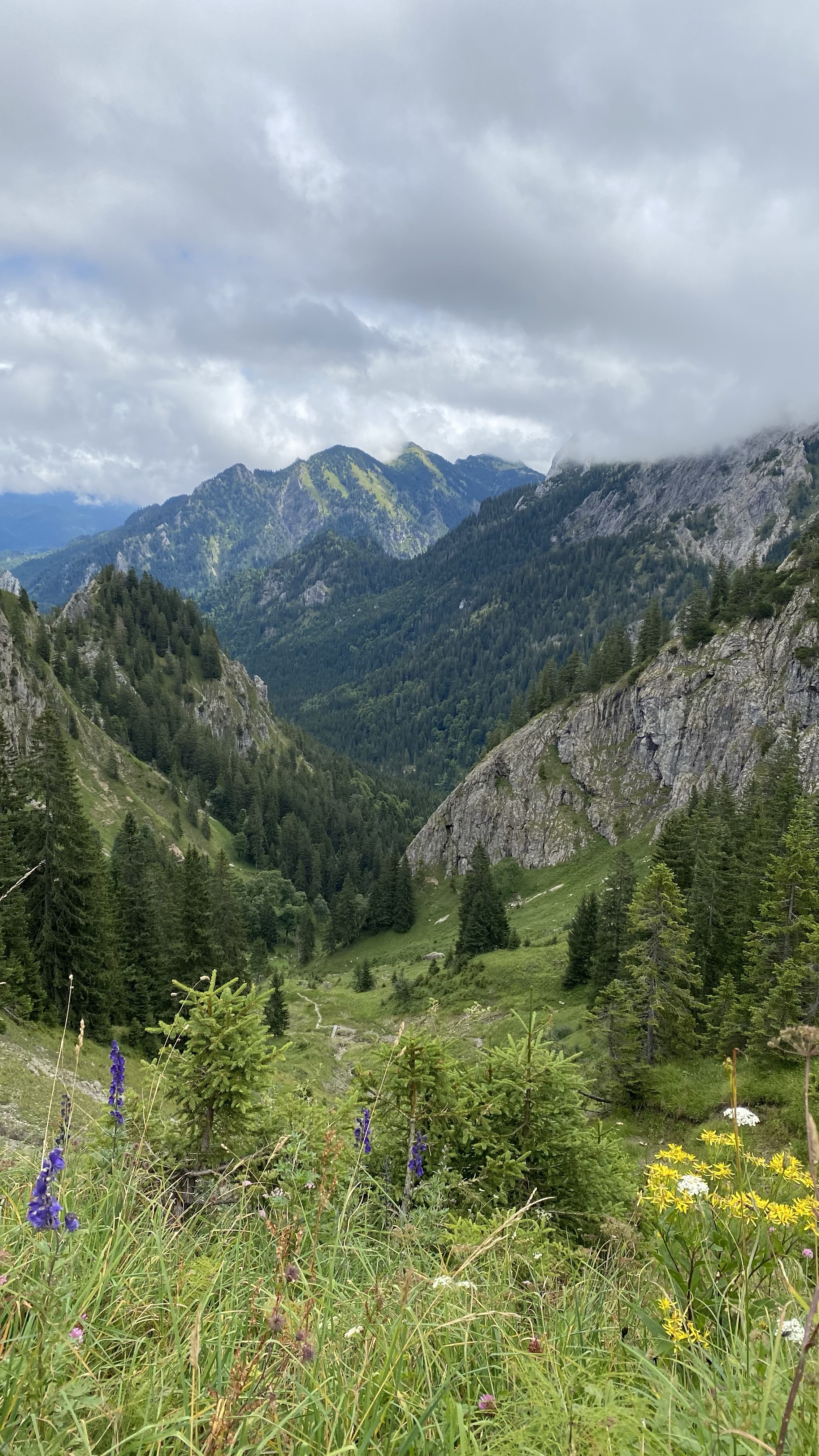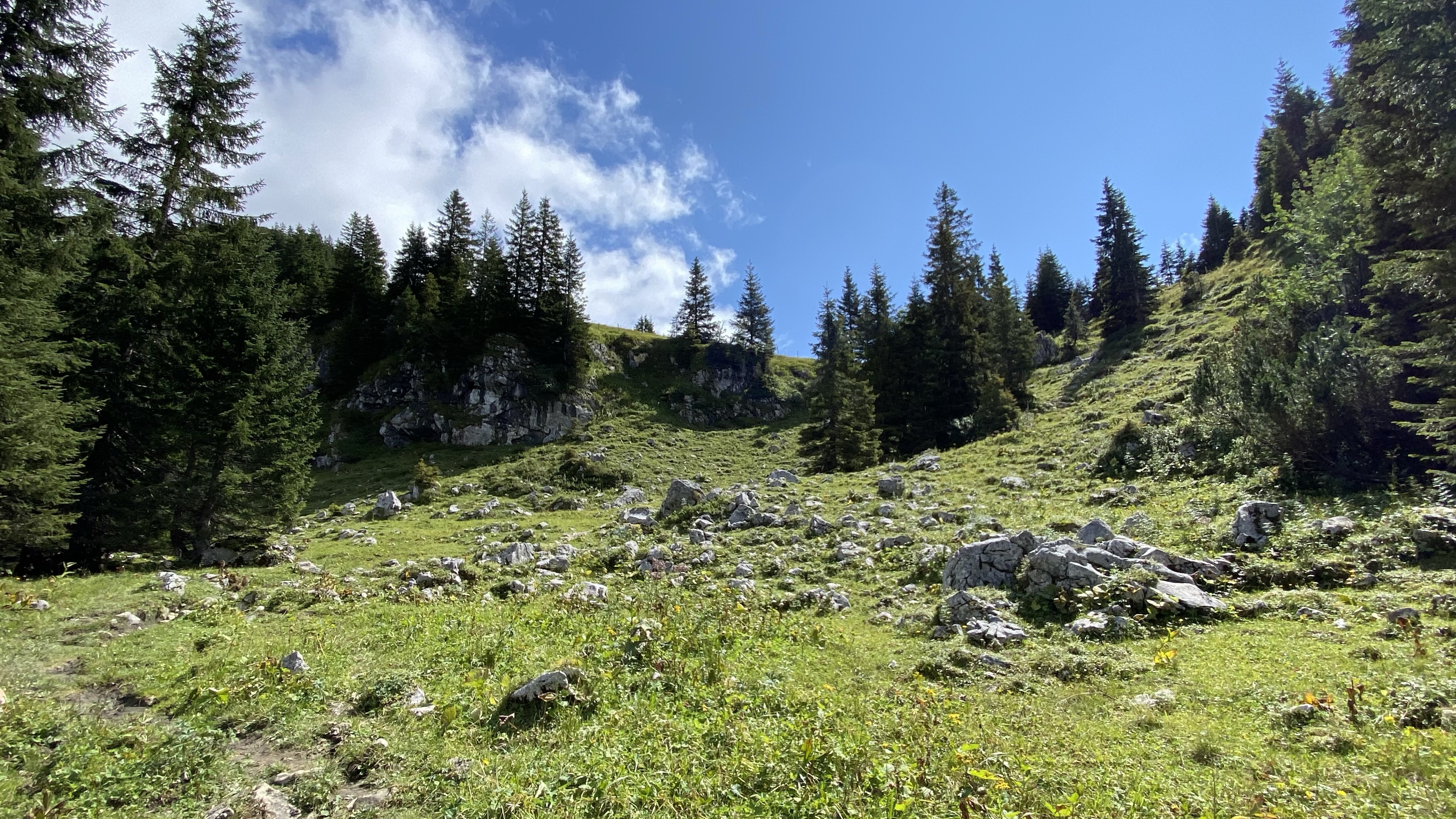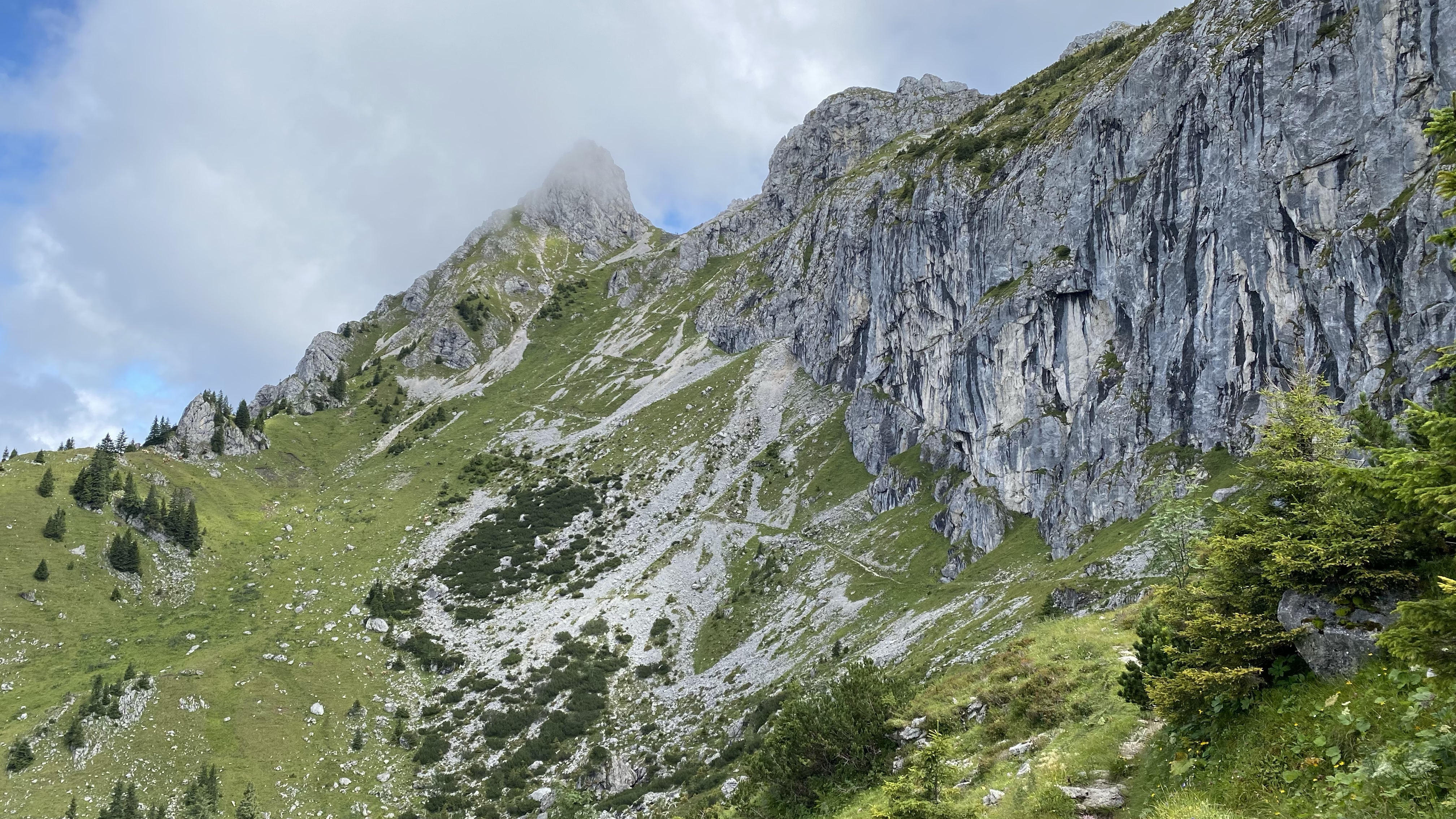 Nach einer angenehmen leichten Wanderung immer an den Hängen entlang und mit Blick in die grünen, saftigen Täler zwischen den Berggipfeln, beginnt der Anstieg auf den Gabelschrofensattel. In großen Serpentinen schraubt sich der Weg stetig höher. Kurz vorm Ziel haben es sich Kühe bequem gemacht. So muss ich über die Wiesen stapfen, da es mir nicht gelingt, die Rindviecher zum zur Seite treten zu überreden.