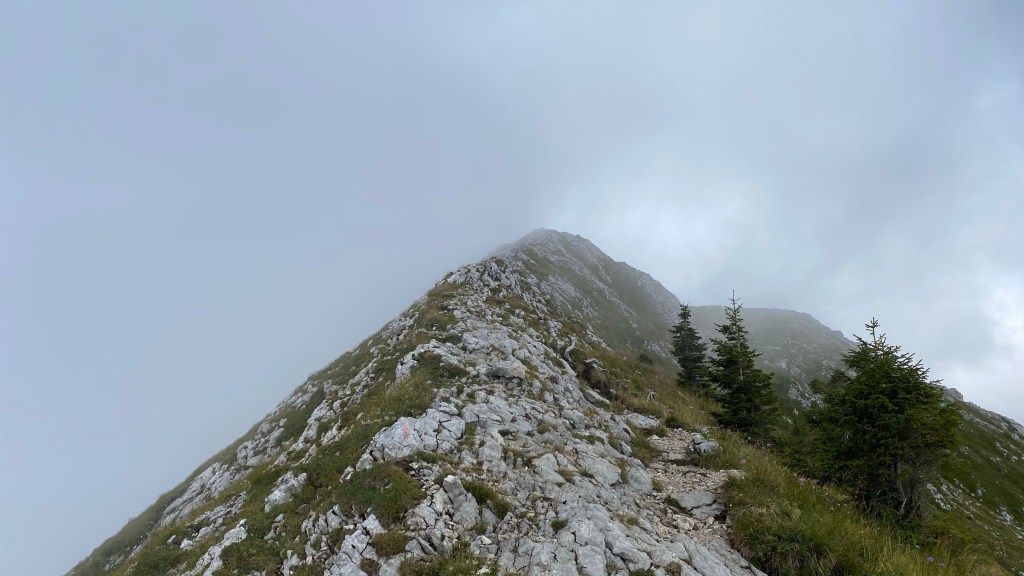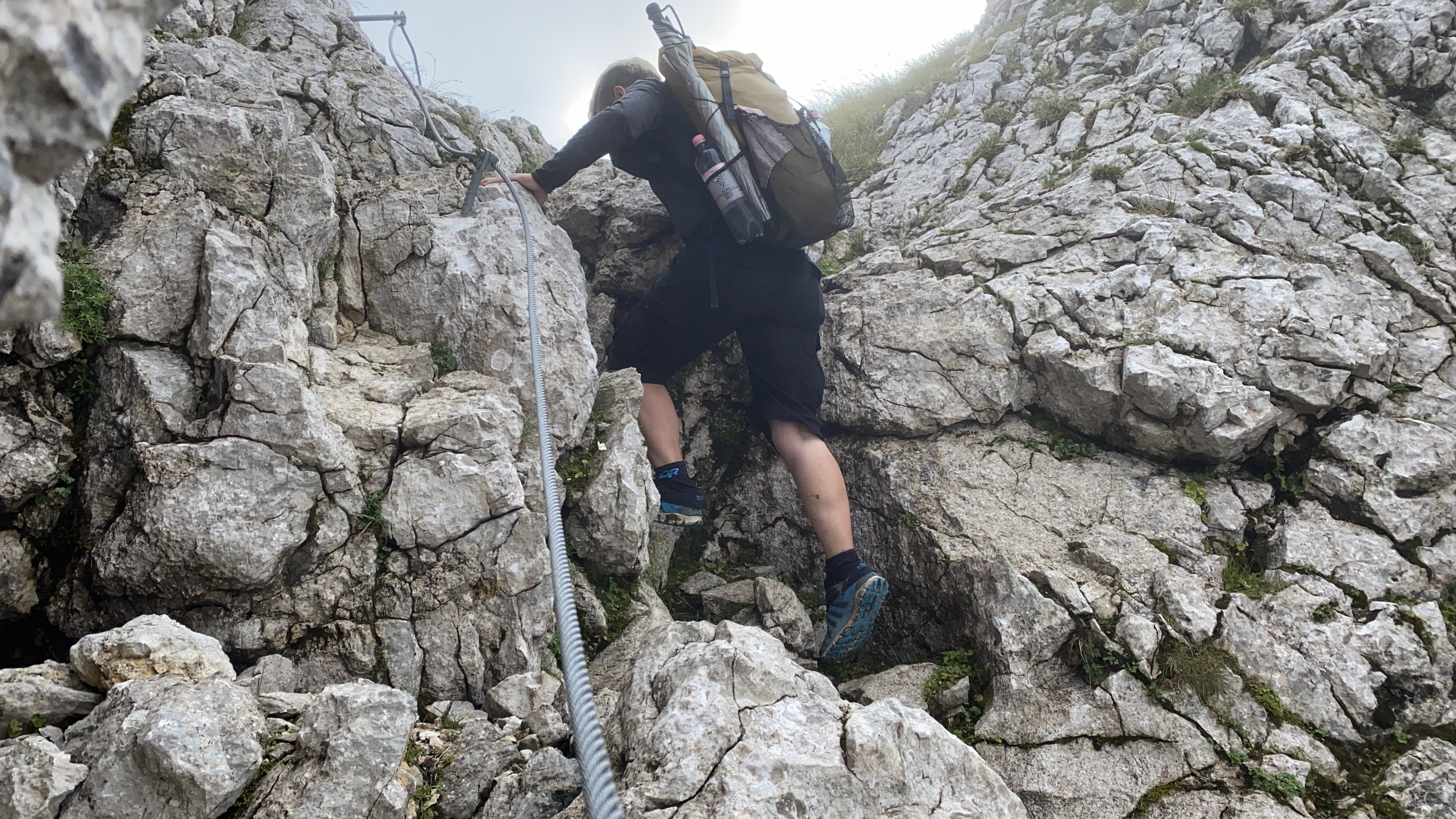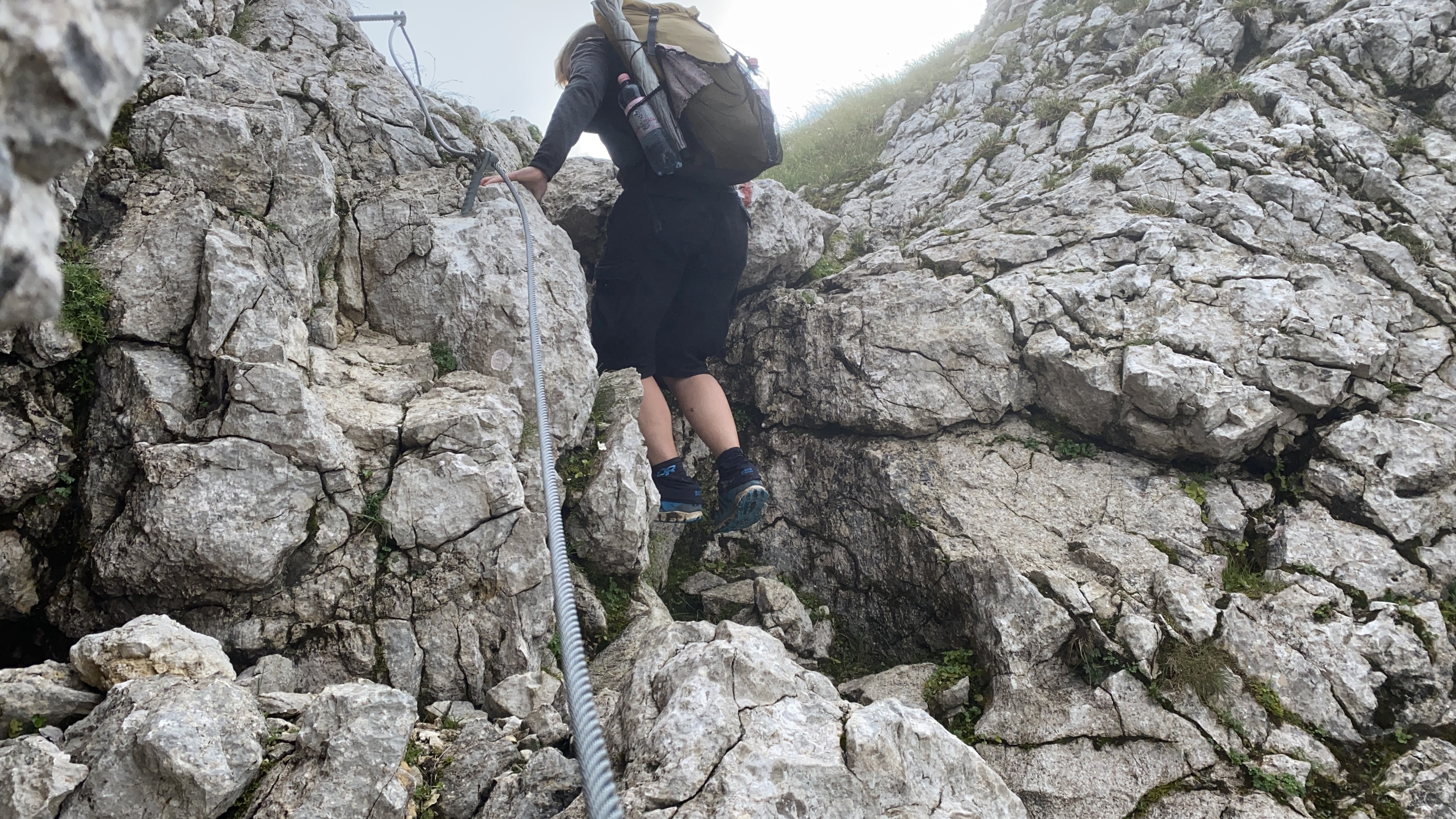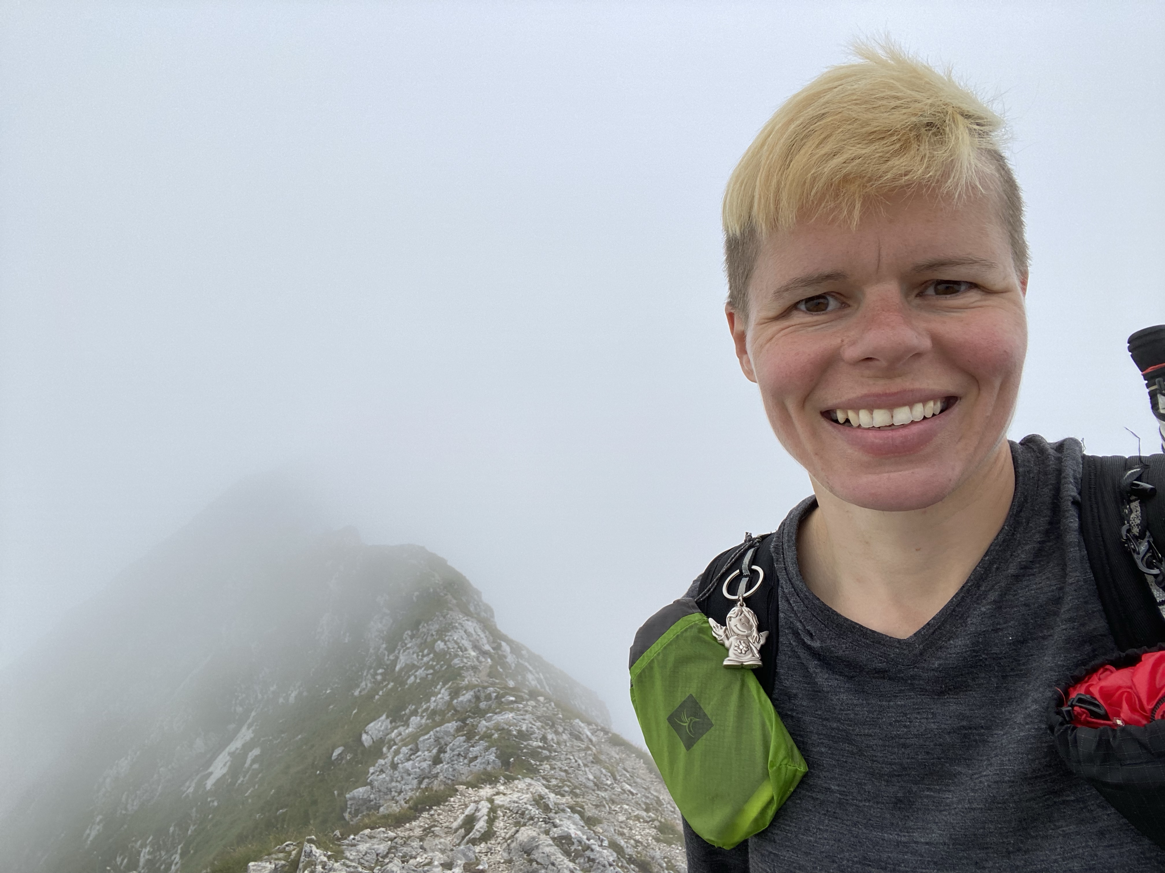 Und das war keine schlechte Entscheidung. Denn trotz der nur eingeschränkten Fernsicht macht es wieder großen Spaß auf dem schmalen Grat nach oben zu klettern. Die Seilpassage ist jetzt beim zweiten Mal auch nicht mehr ganz so furchteinflößend und dann stehe ich ganz alleine auf dem Gipfel. Und schon dafür hat es sich gelohnt. Alles ist still, nur aus der Ferne höre ich manchmal ein Flugzeug. Wunderbar. Ich habe richtig gute Laune und die brauche ich auch für den Abstieg. Den habe ich nämlich als nicht so angenehm in Erinnerung.