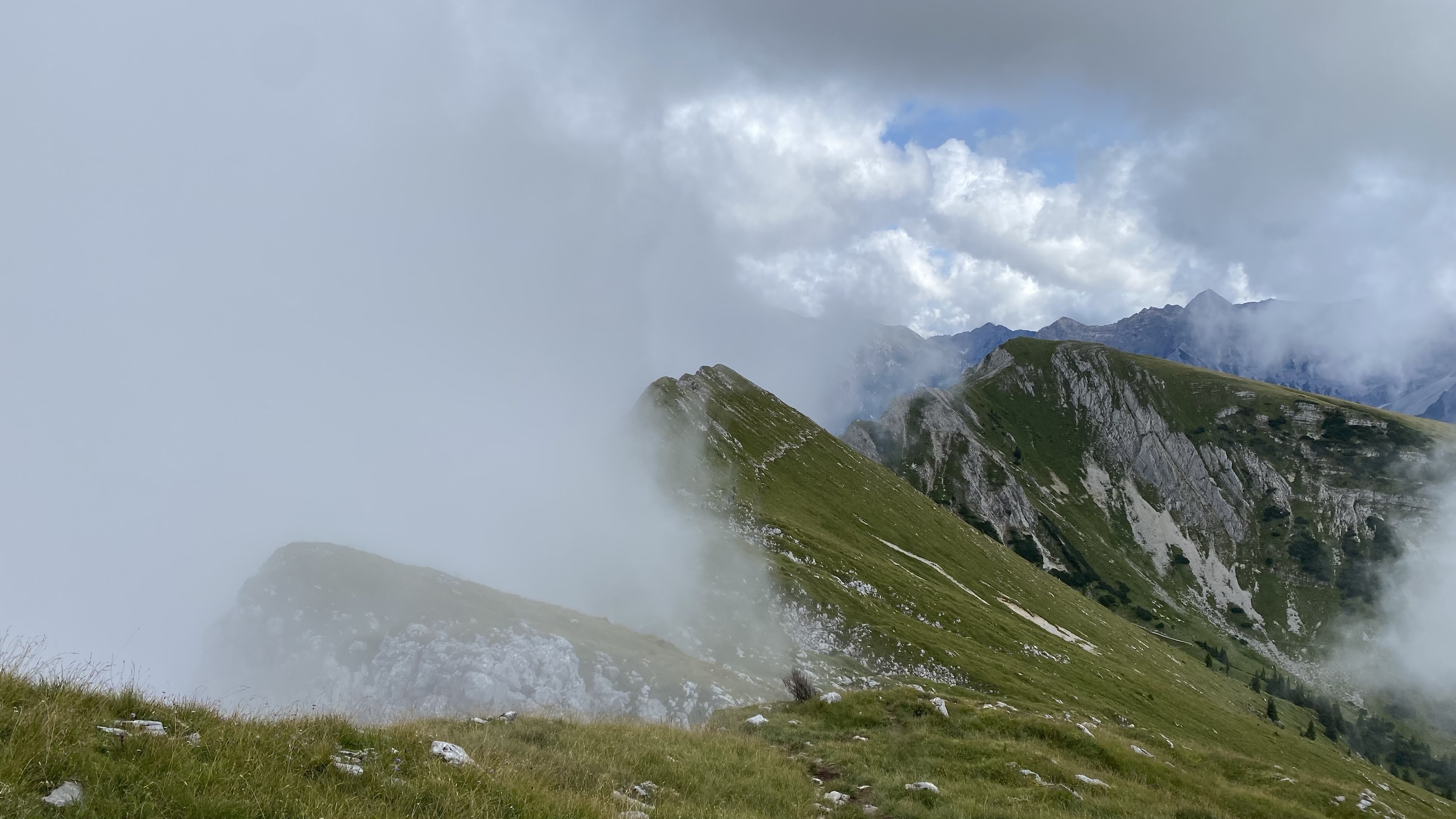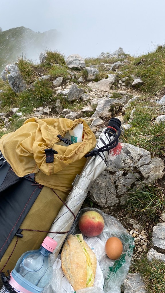 Frustriert esse ich mein Brötchen und Ei, welche ich mir beim Frühstück mitgenommen hatte. Dann gehe ich weiter und überlege, die Alternativroute über den Ostallgäuer Höhenweg zu nehmen, da die Hochplatte einfach nicht aus den Wolken rauskommt.
