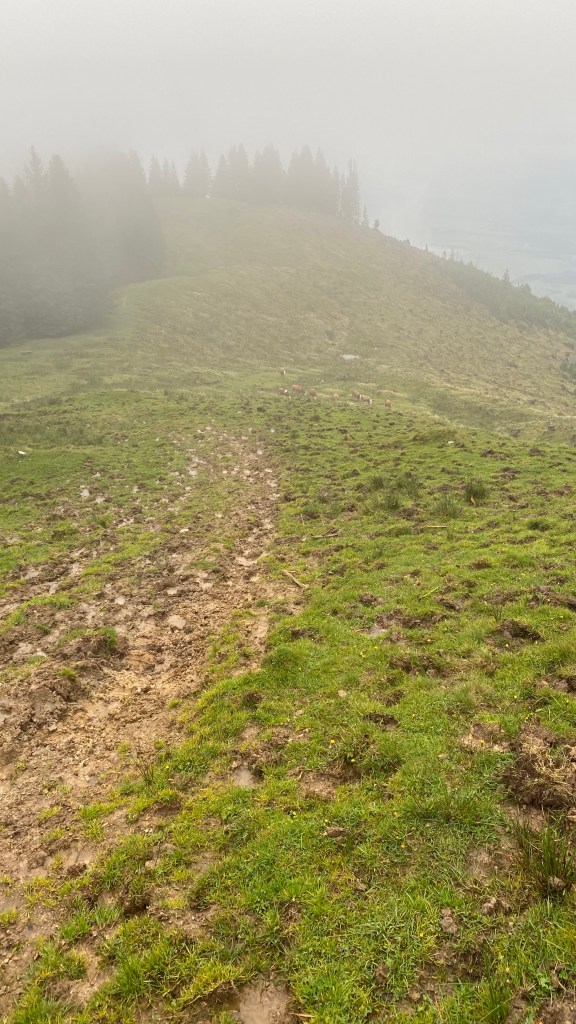 Es geht am vorderen, mittleren und hinteren Hörndl vorbei – alle liegen unsichtbar am Wegesrand in dichte Wolken verpackt da. Selbst die Kühe, die ich passiere, haben zu dieser frühen, tristen Stunde noch keine Lust, Gras zu kauen und liegen faul auf dem Boden.