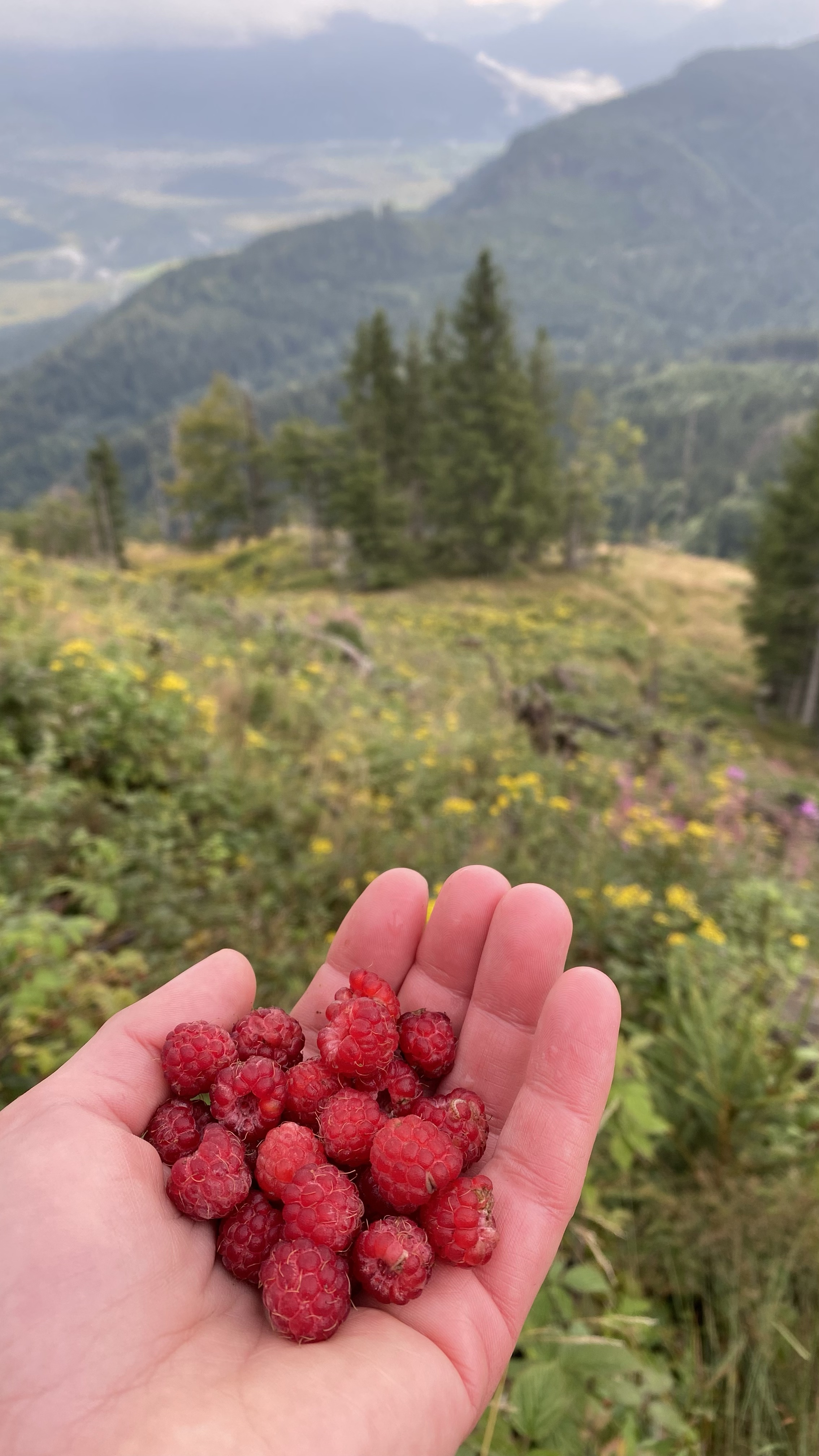 Danach geht es dann durch einen Abschnitt, der nur noch mit Unterholz und Büschen bewachsen ist. Außerdem stehen überall die Baumstümpfe der gerodeten Bäume. Das war dann wohl mal Wald und wird auch bald Weideland sein? Schade drum…Immerhin stehen hier jede Menge Himbeersträucher und die Beeren sind auf den Punkt reif und wollen gepflückt werden.