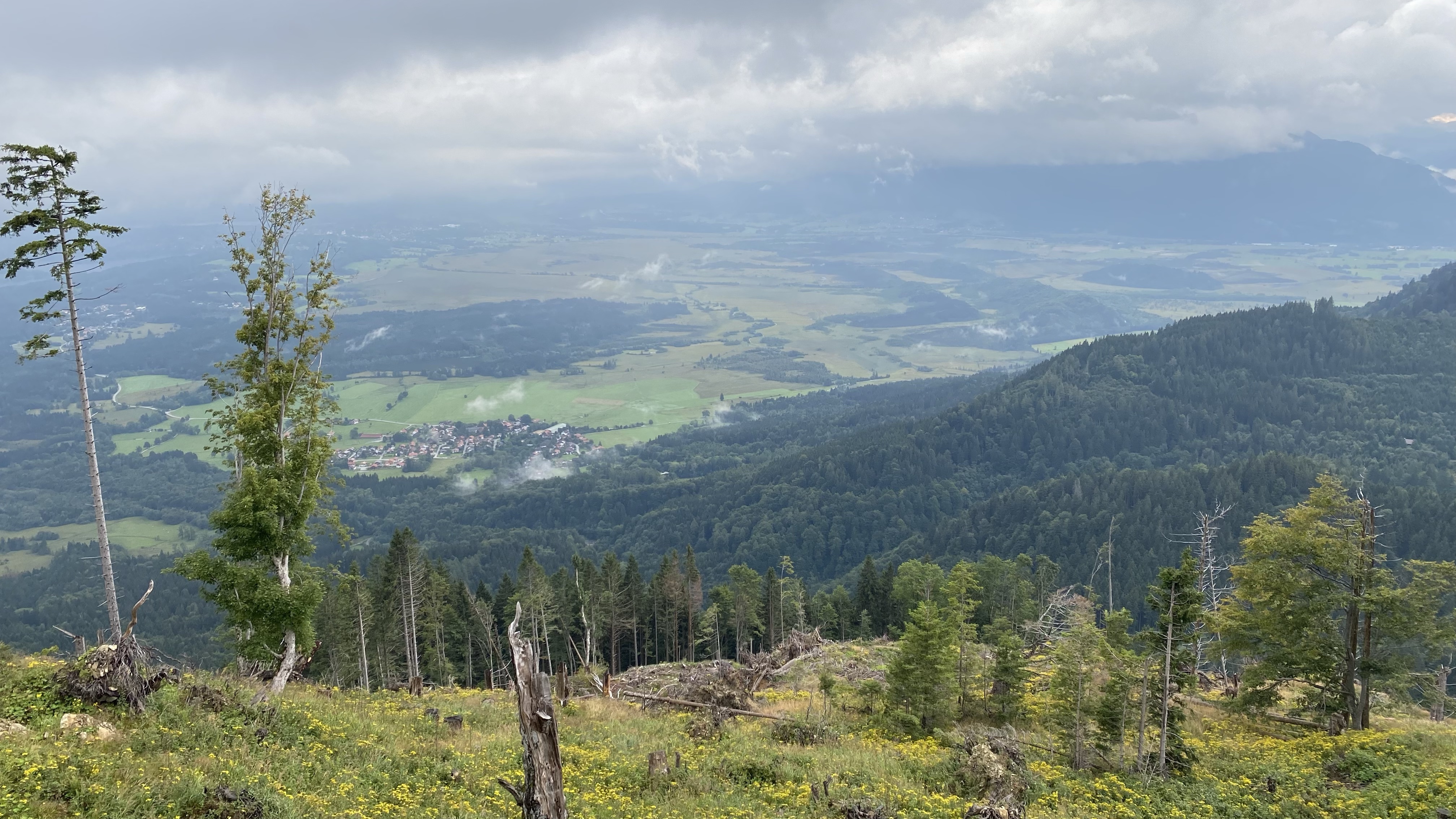 Entsprechend steil und vor allen Dingen lang ist der Abstieg. Und er beginnt damit, dass ich über eine pitschnasse, schlammige Weide muss. Der bis dato gut ausgebaute Schotterweg endet einfach und man soll über die Weide rutschen…ich bin genervt, weil es unmöglich ist, trockene Schuhe zu behalten und ich mehrmals knöcheltief in der aufgelösten Kuhscheiße versinke.