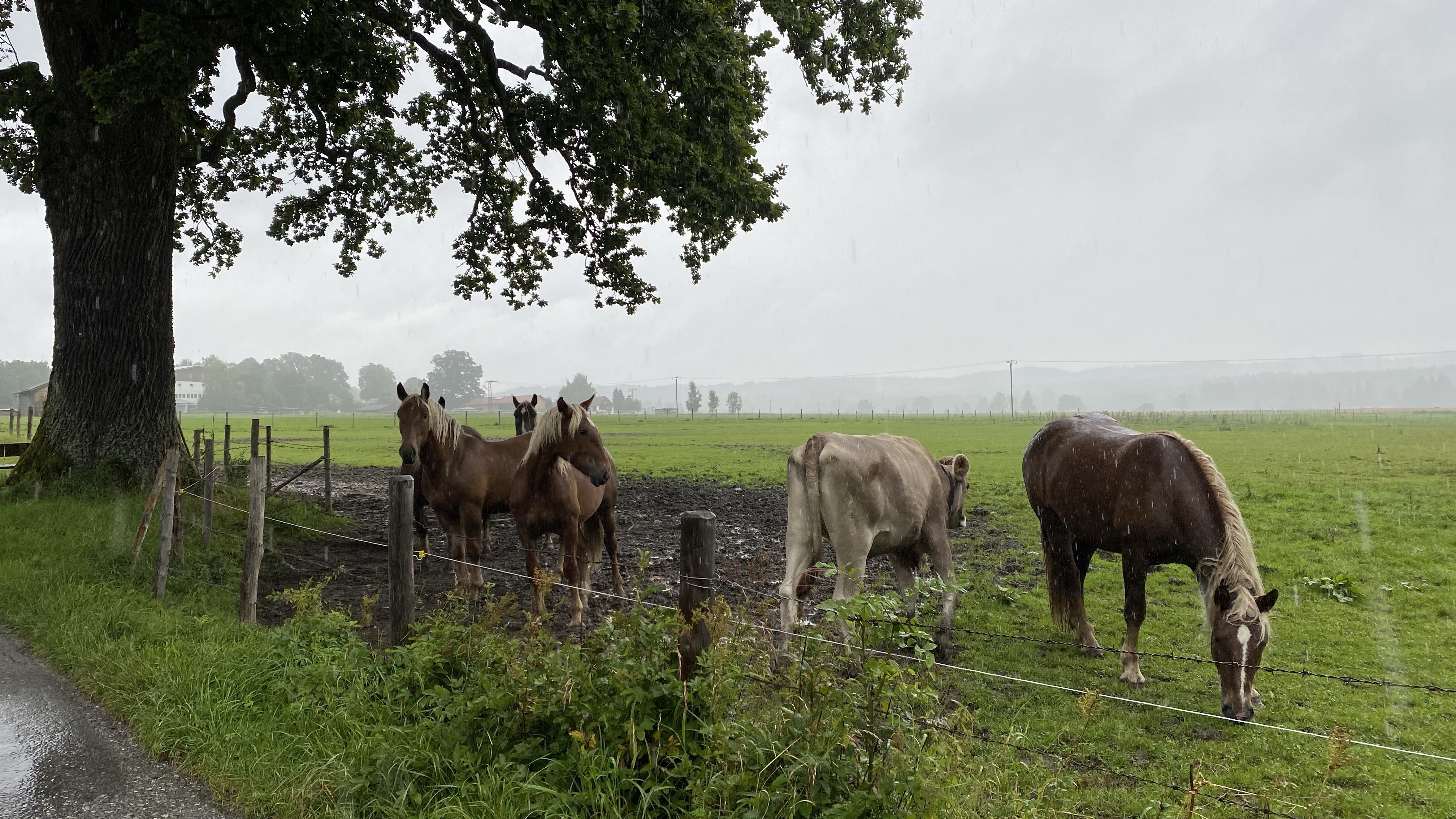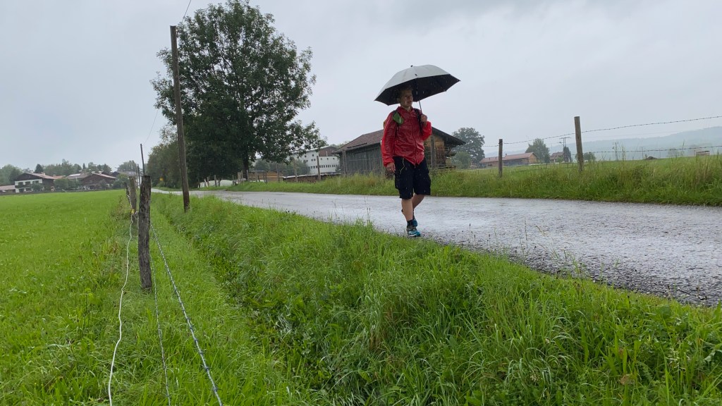 Ich stöpsel mir die Kopfhörer ein und höre Podcasts. Wenn ein stärkerer Schauer kommt, versuche ich mich unterzustellen, aber bei normalem Regen bin ich durch meinen Schirm ausreichend geschützt.