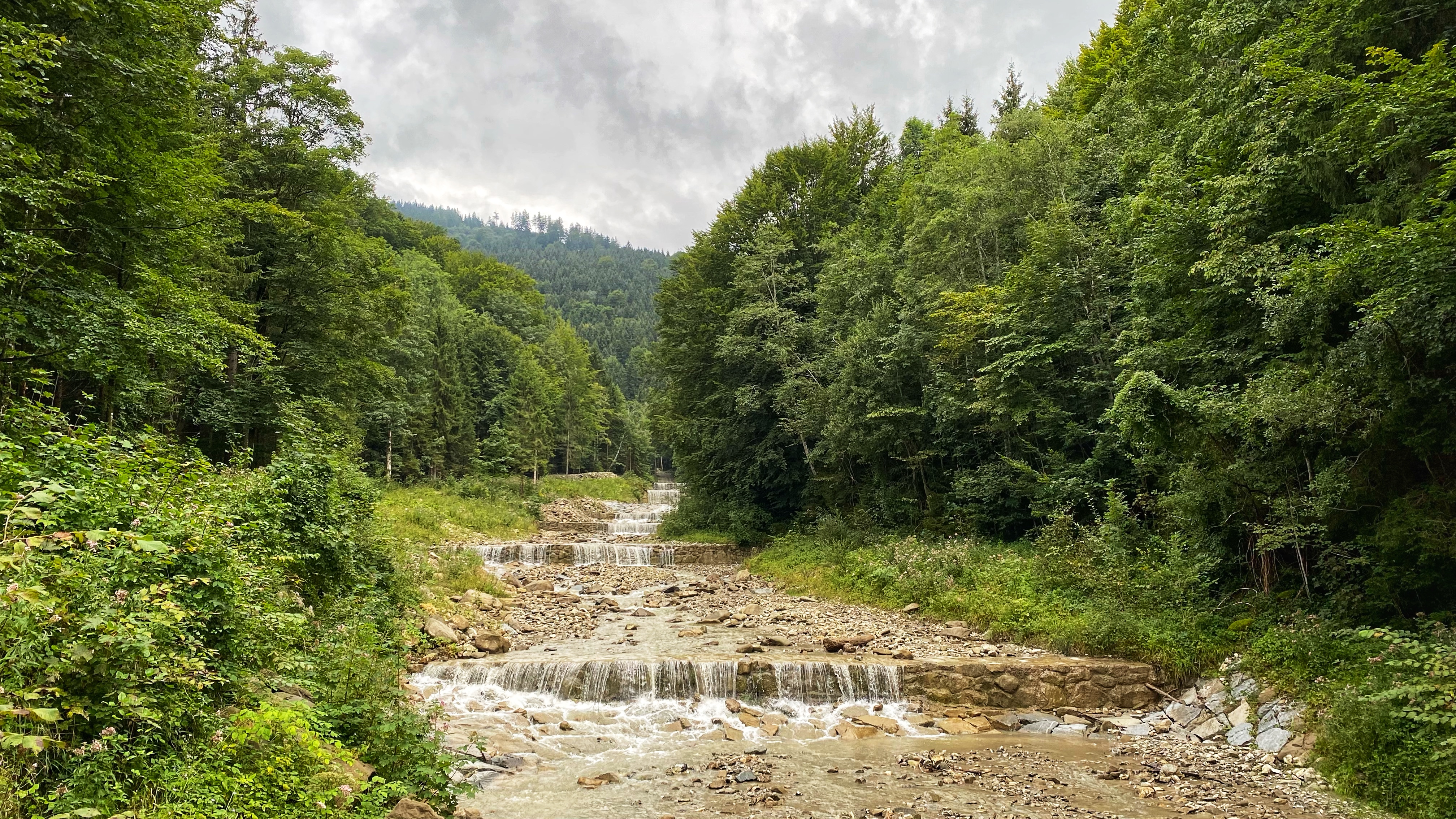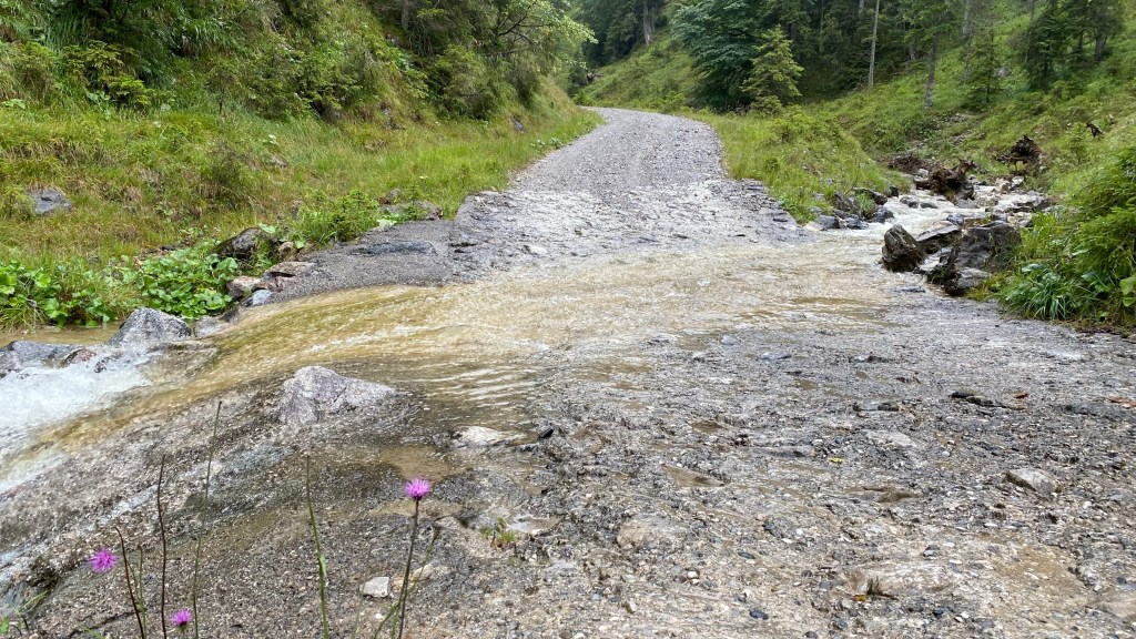 Dann kreuzt der Bach die Straße und durch den anhaltenden Regen führt er so viel Wasser, dass es unmöglich ist, trockenen Fußes hinüber zu gelangen. Ich muss beim queren sogar aufpassen, nicht den Halt zu verlieren, weil die Strömung so stark ist.