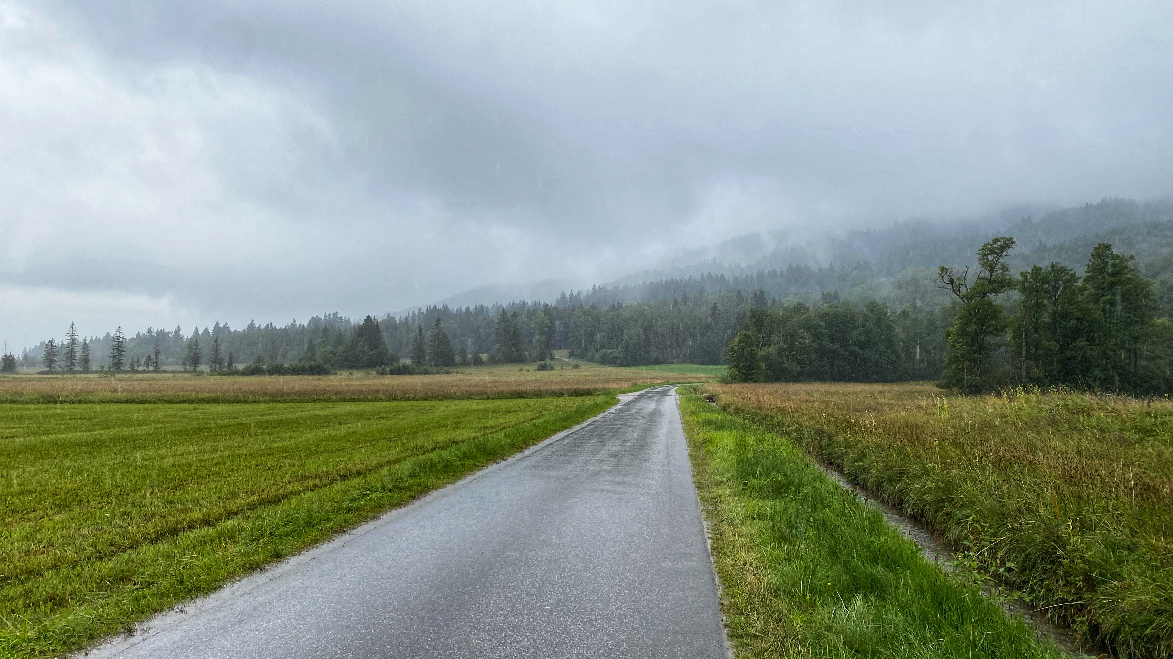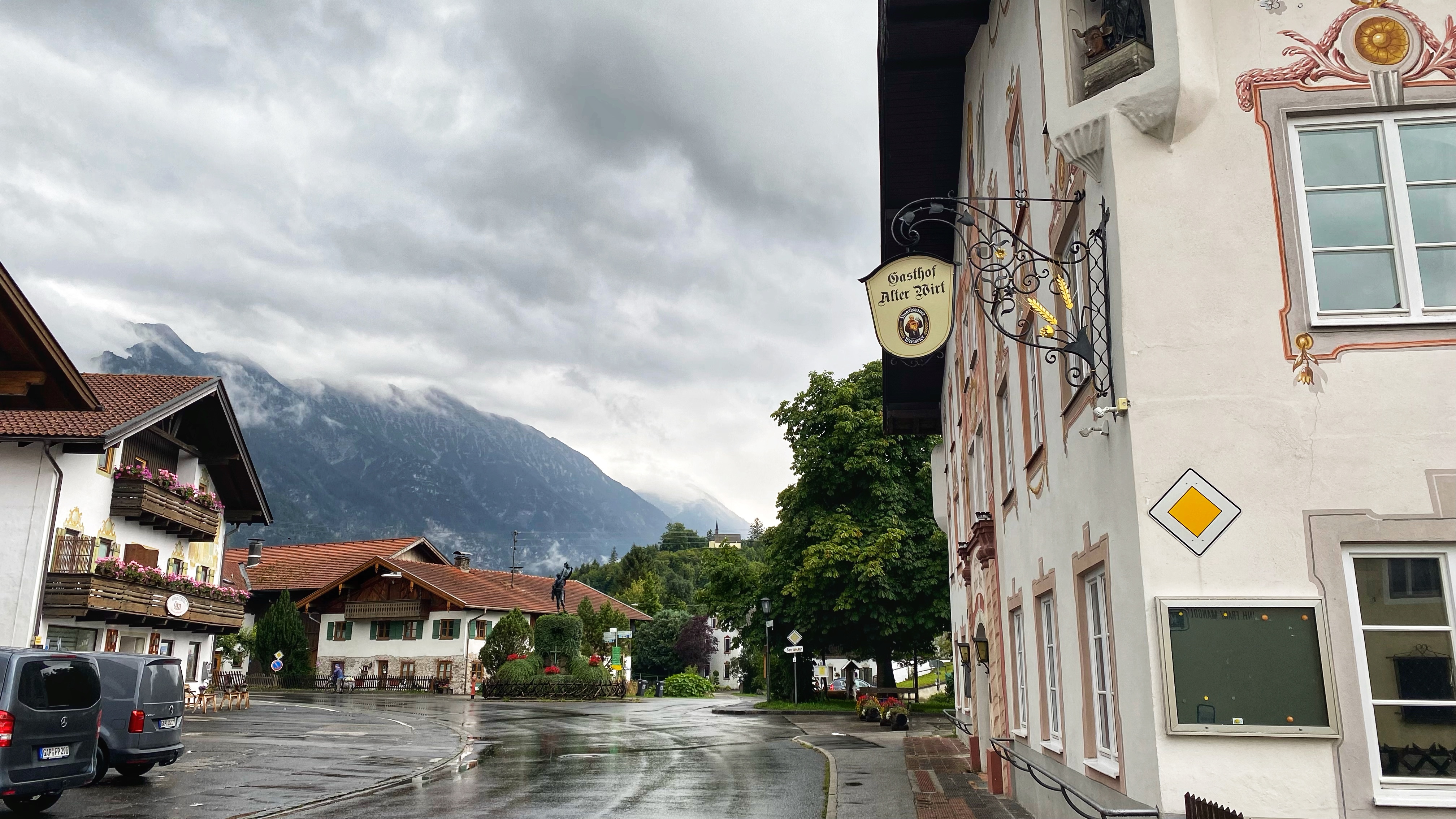 Gegen 10:00 Uhr bin ich unten in Grafenaschau angekommen und dann fängt es auch an zu regnen. Vorhergesagt war es ja schon die ganze Zeit, so dass ich nicht überrascht bin. Und da es jetzt mehr als acht Kilometer bis nach Eschenlohe ernsthaft auf der Straße weitergeht, stört mich der Regen noch weniger.