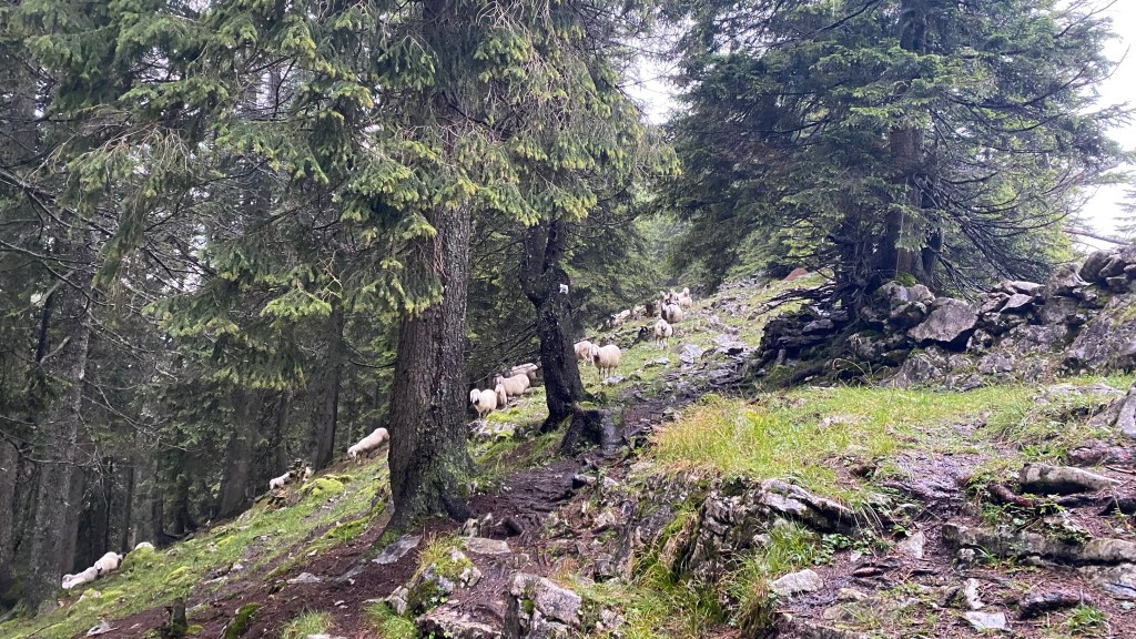 Der Wegverlauf ist eigentlich ganz schön, immer wieder Pfade an Berghängen und durch kleine Wälder hindurch oder auch mal über eine Weide, wobei diese noch nicht ganz so unter Wasser steht wie die von gestern.