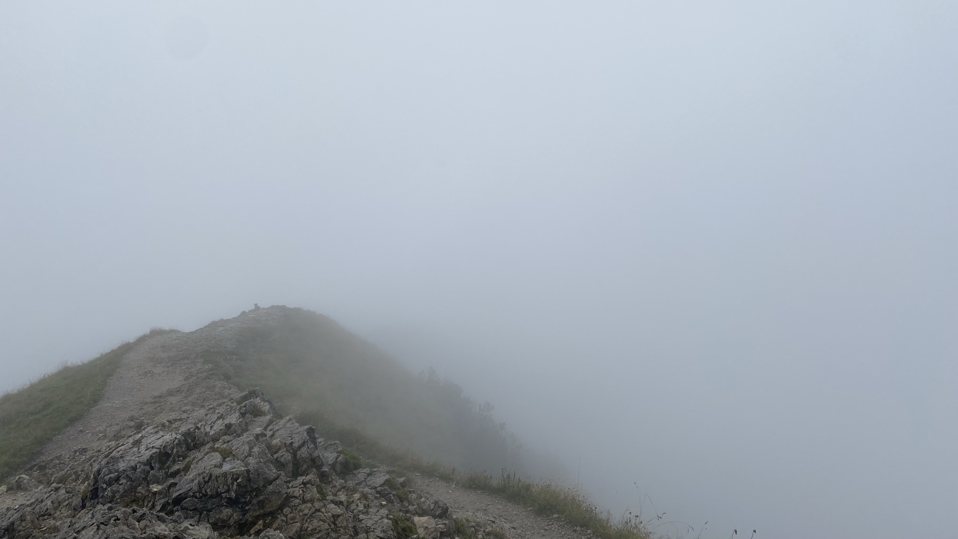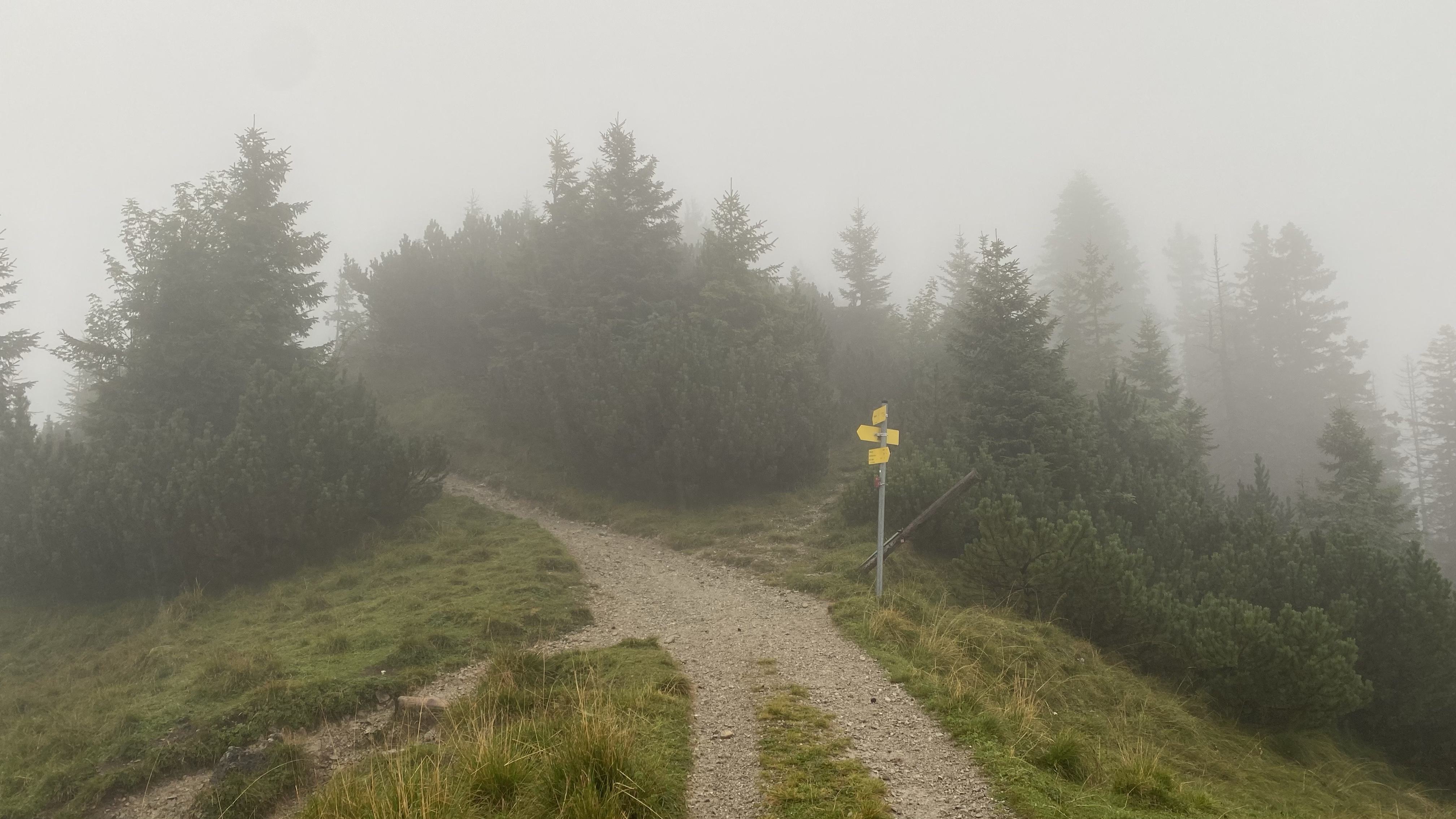 Um acht Uhr komme ich auf dem Gipfel des Heimgarten an und es liegt natürlich alles im Nebel, nichts zu sehen in keine Richtung.