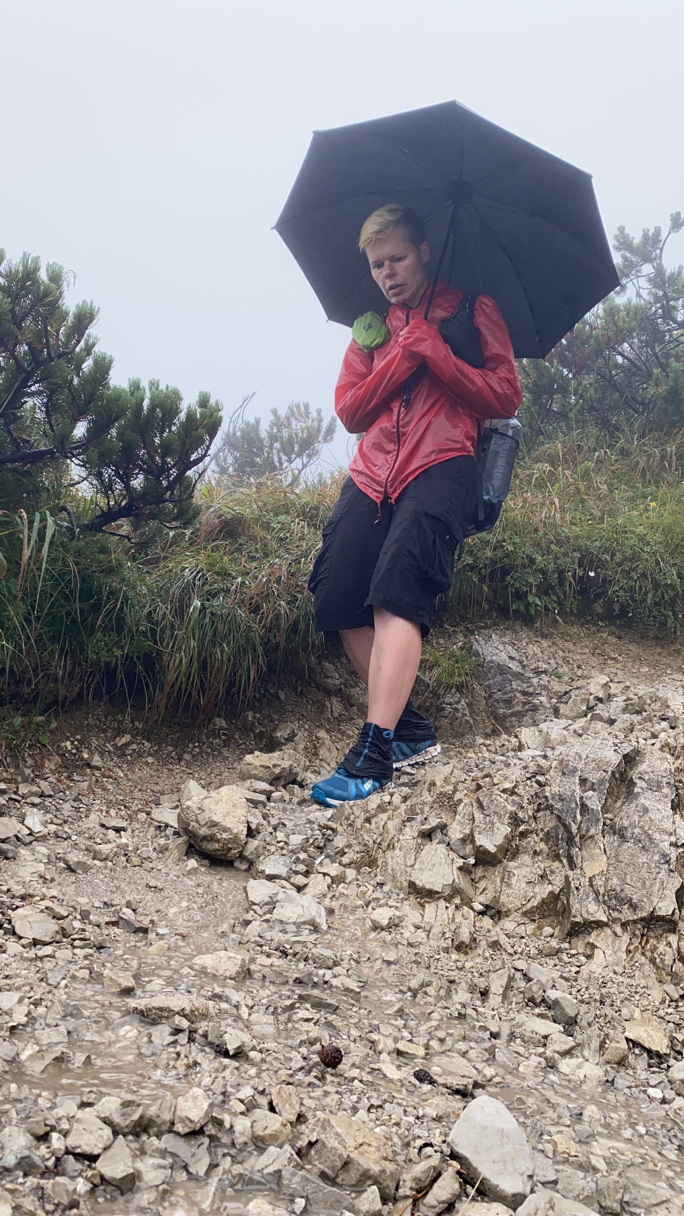 Es folgen diverse Seilpassagen, wobei ich überrascht feststelle, dass die bei Regen auch nicht schwieriger sind als bei trockenem Wetter und ich sogar sehr gut einhändig durchkomme, damit ich den Schirm noch halten kann.