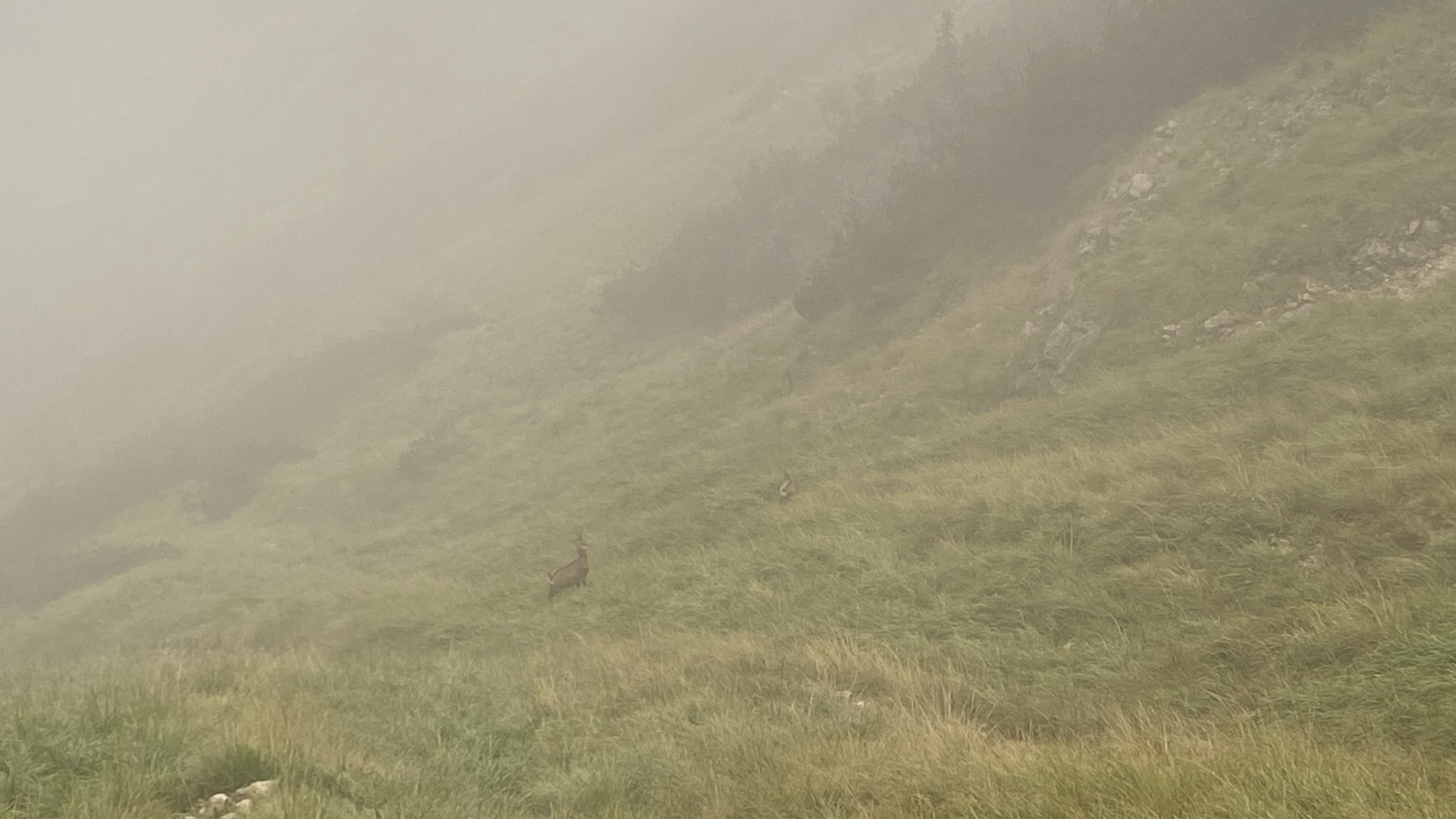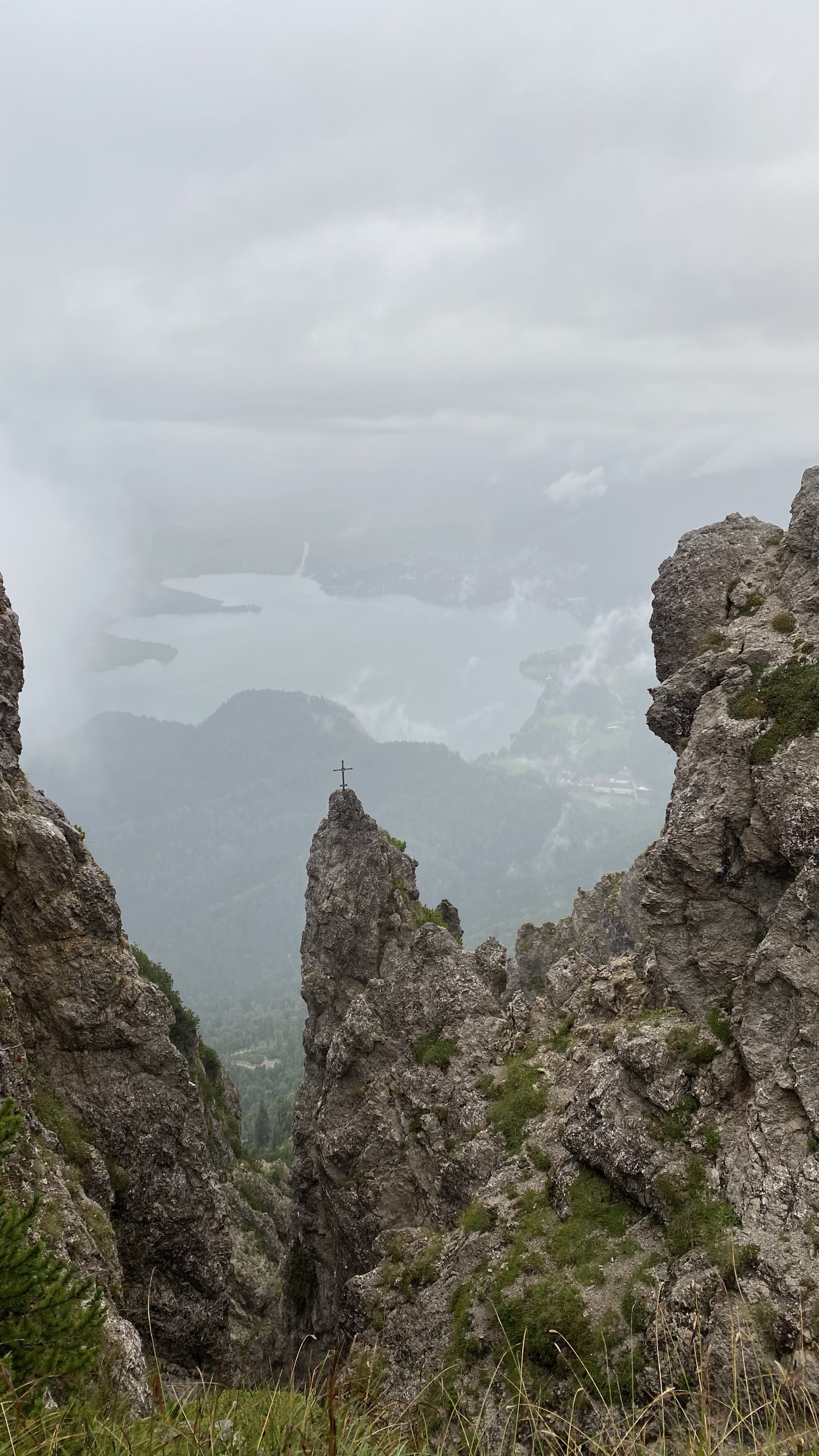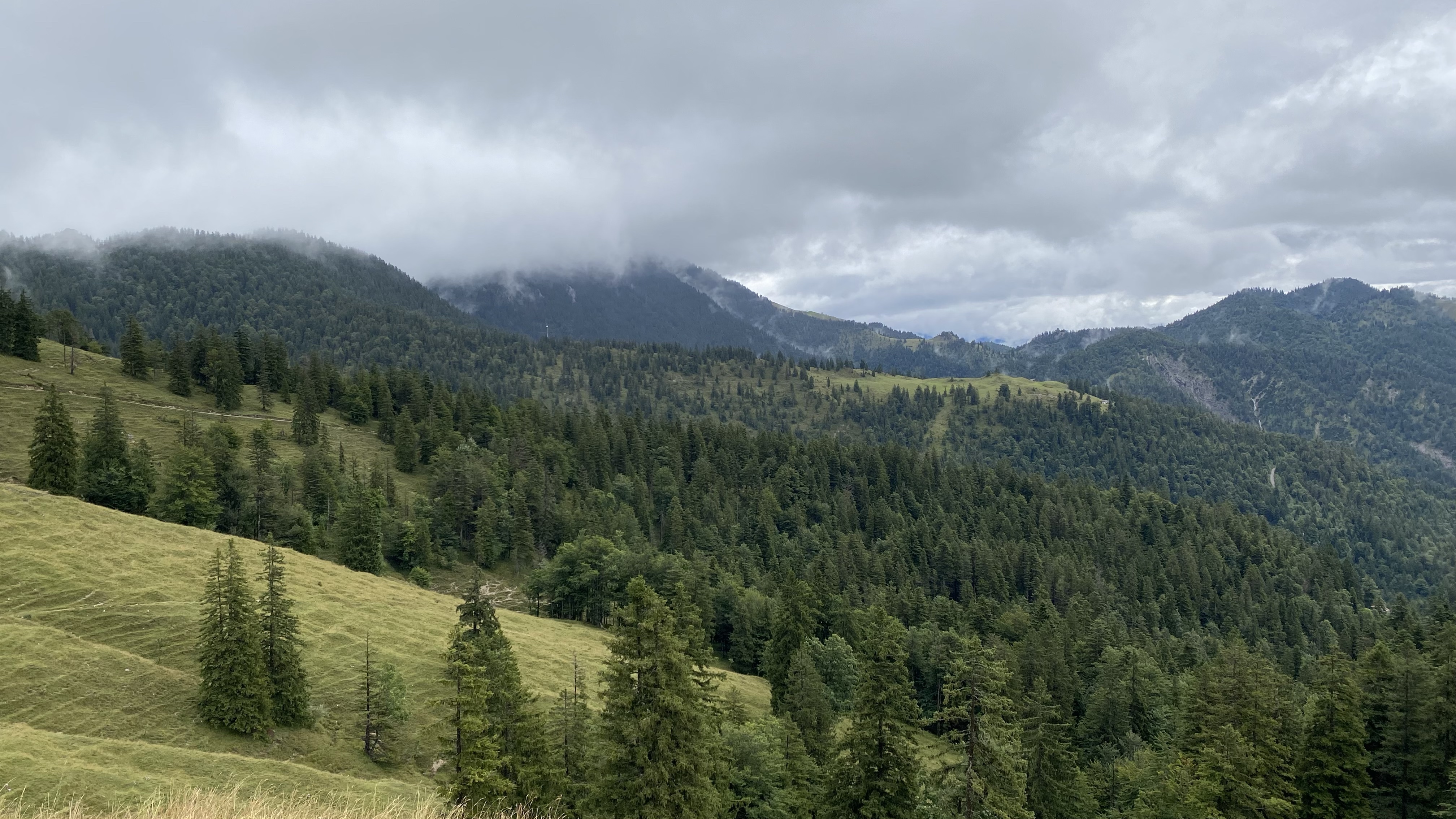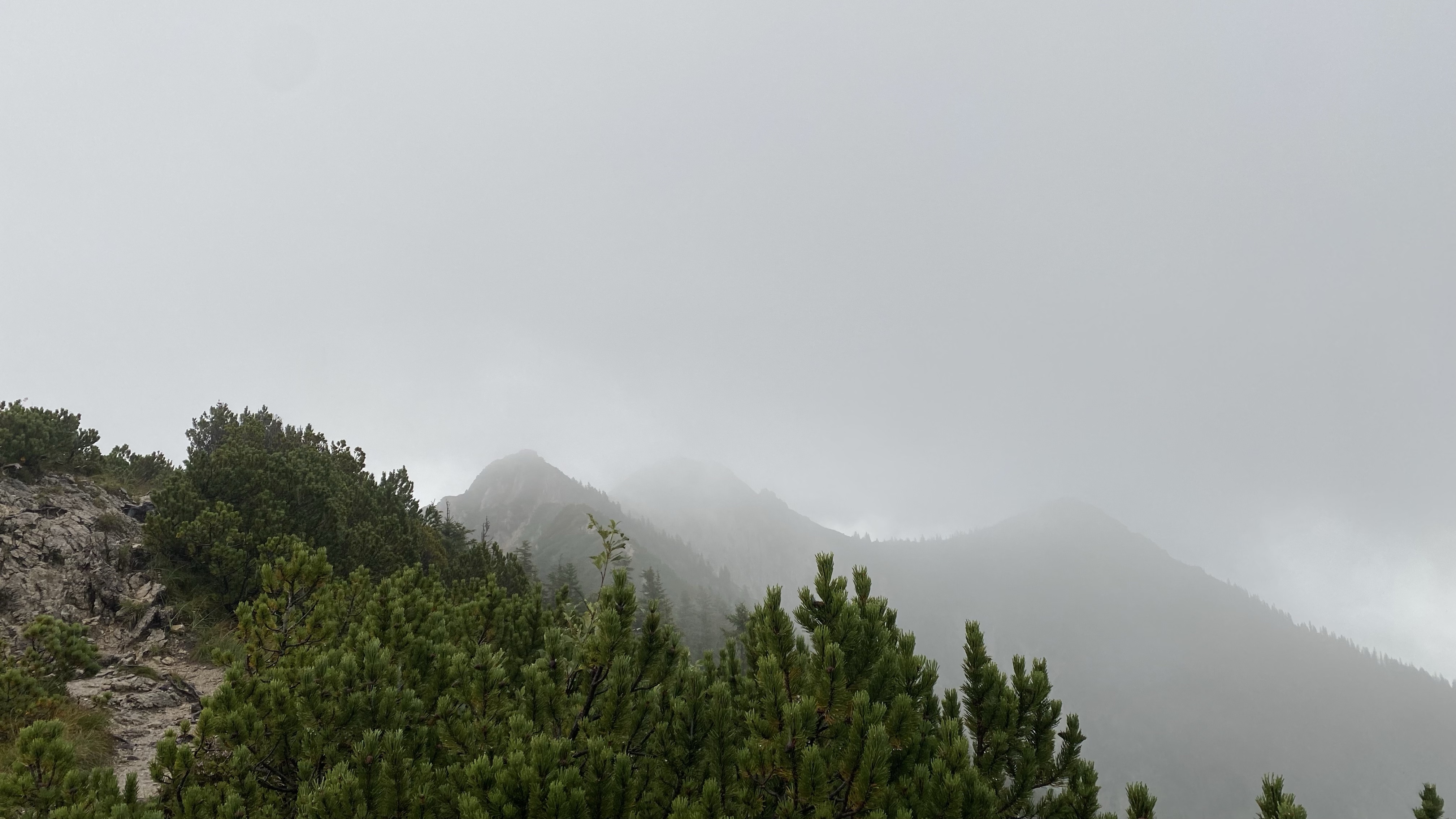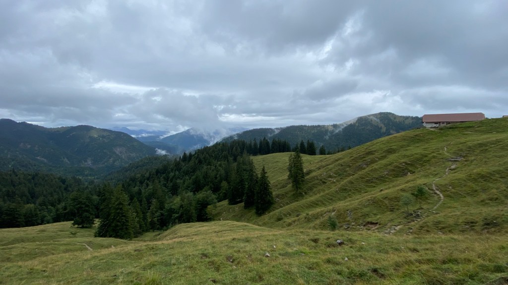 Irgendwann bin ich aber trotzdem von oben bis unten nass und komplett durchgefroren. Ich will einfach nur noch ankommen. Aber wo? Ich sehe manchmal für ein paar Sekunden, wenn die Wolken sich kurz aufteilen, ein Gipfelkreuz auf dem letzten Gipfel in der Reihe. Das muss der Herzogstand sein. Und auf dem Gipfel davor entdecke ich eine kleine Hütte. Da will ich hin! Ich muss mich unbedingt unterstellen und wieder etwas warm werden.