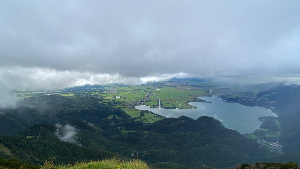 Der Rundumblick, der für ein paar Sekunden möglich ist, gibt die Sicht auf den Kochelsee und die umliegenden Ortschaften frei. Ich muss daran denken, dass es jetzt Samstag kurz vor zehn Uhr ist und viele noch in ihren warmen Bettchen liegen und ausschlafen werden. *seufz*
