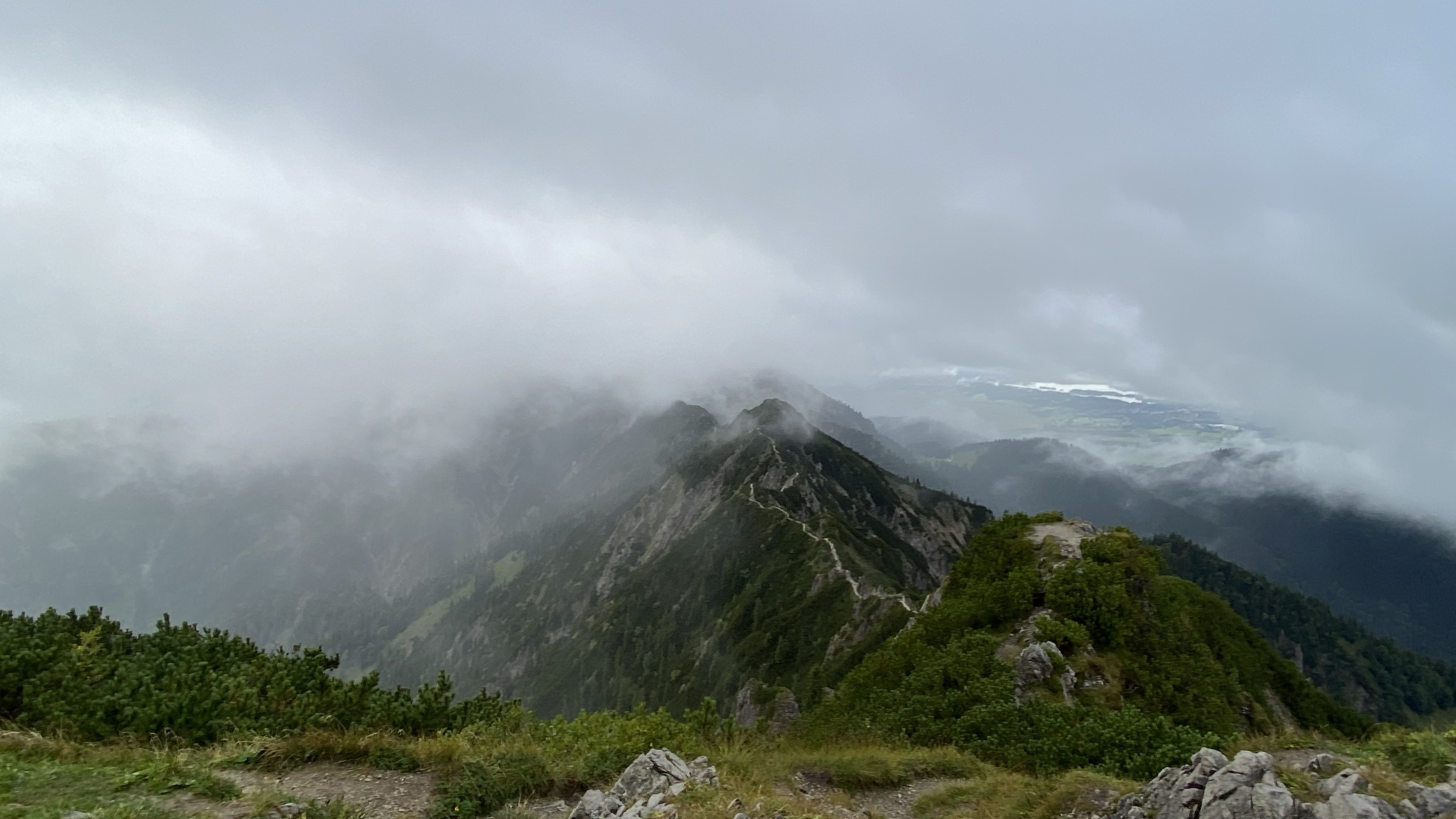 Es geht jetzt leider auf einem Kammweg bis zum Herzogstand (1.731 m). Das bedeutet, ausgesetzte Wegstücke ohne Windschutz und voll im Regen.