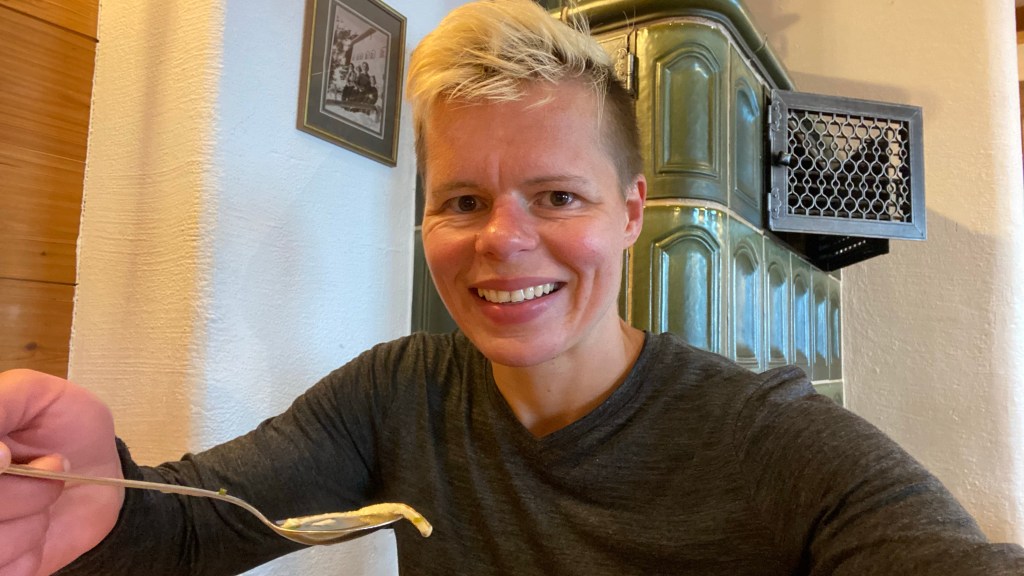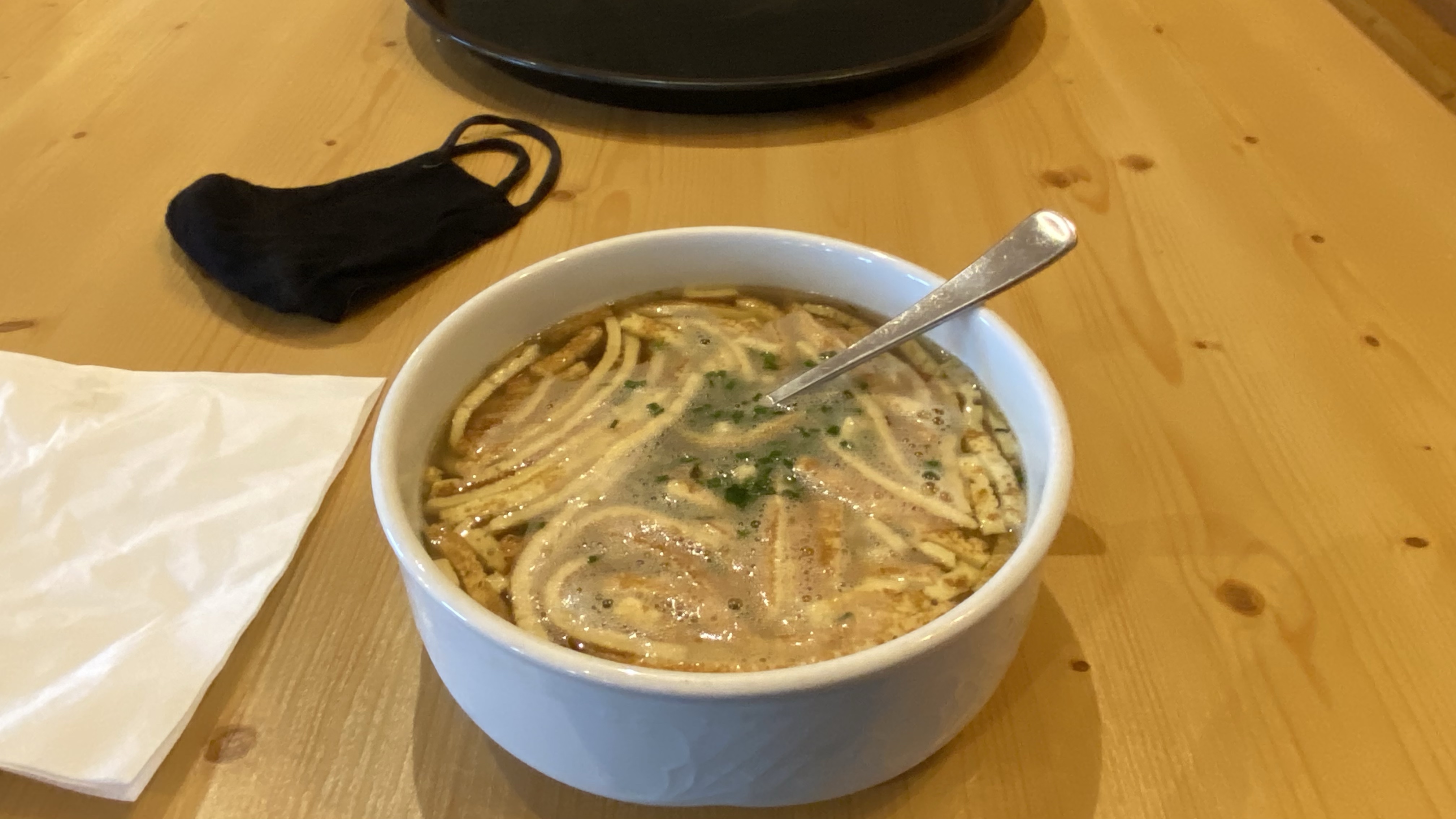 Ich bestelle eine Pfannkuchensuppe und platziere mich direkt am großen Kachelofen, der wohlig knistert und eine angenehme Wärme ausstrahlt. Glücklich und durchgefroren wie ich bin, schmiege ich mich direkt an den Ofen und würde am Liebsten reinkrabbeln.