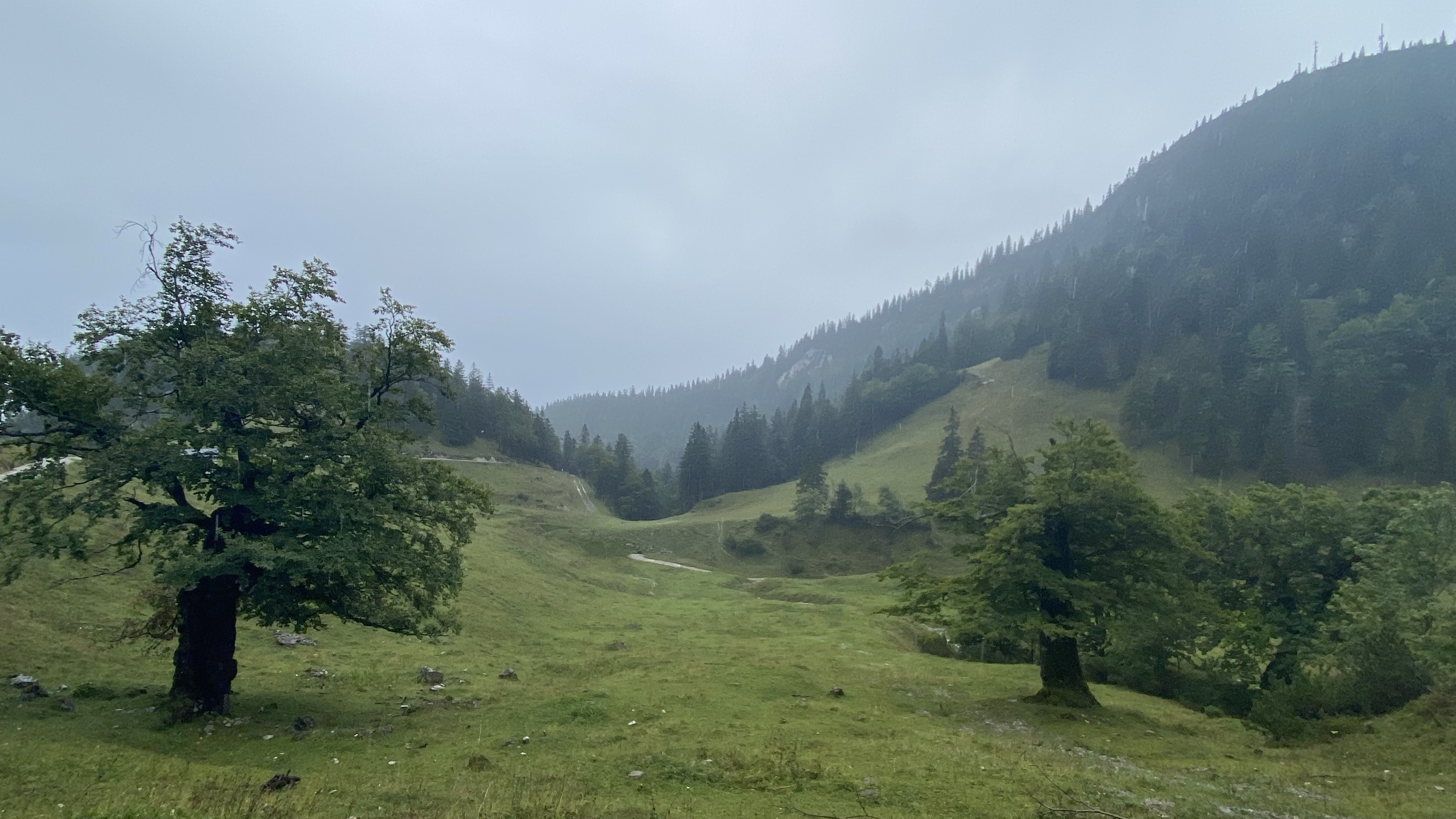 Zunächst in Richtung Jochberg, wobei dieser nicht erklommen, sondern vorher zur gleichnamigen Almhütte abgebogen wird. Diese hat wegen dem schlechten Wetter allerdings geschlossen, so dass ich mir im weiteren Verlauf Wasser an einer überlaufenden Tränke auffüllen muss. Bei den Wassermengen, die es in den letzten Tagen und Stunden geregnet hat, sollte das Wasser aber einigermaßen genießbar sein, denke ich mir.
