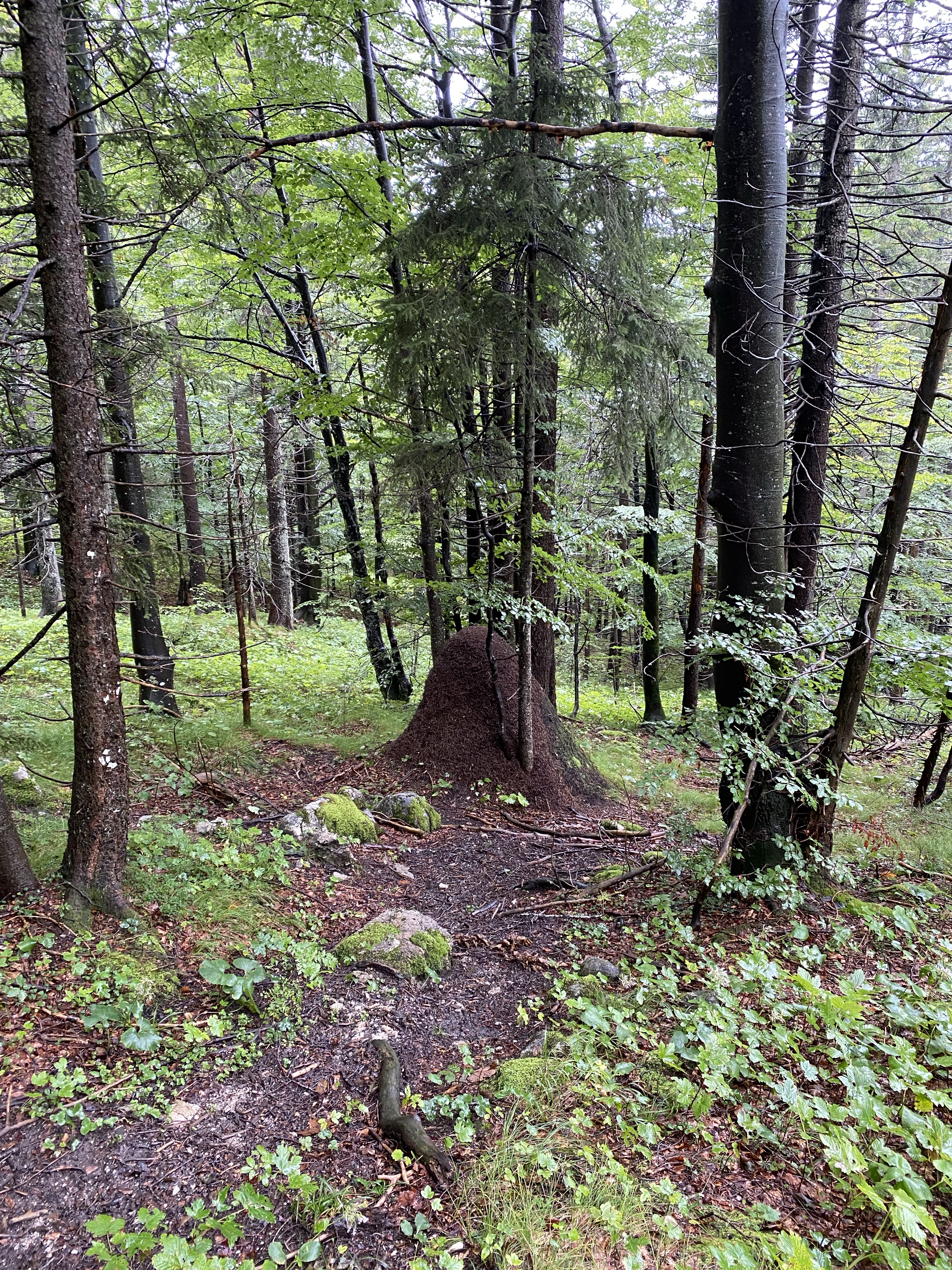 Der Weg ist ganz angenehm, entweder Schotter oder gut gepflegter Pfad durch den Wald. Was mir zwischenzeitlich allerdings auffällt, sind die Unterschiede in der Vegetation zwischen Weideflächen und naturbelassenem Wald. Wenn der Wald von Kühen oder Schafen beweidet wird, wächst nur noch Gras und vielleicht ein, zwei Blühpflanzensorten. Wenn es jedoch naturbelassene Flächen sind, explodieren die Farben der Blüten unterschiedlichster Arten und der Boden ist mit üppigem, abwechslungsreichem Bewuchs überdeckt.