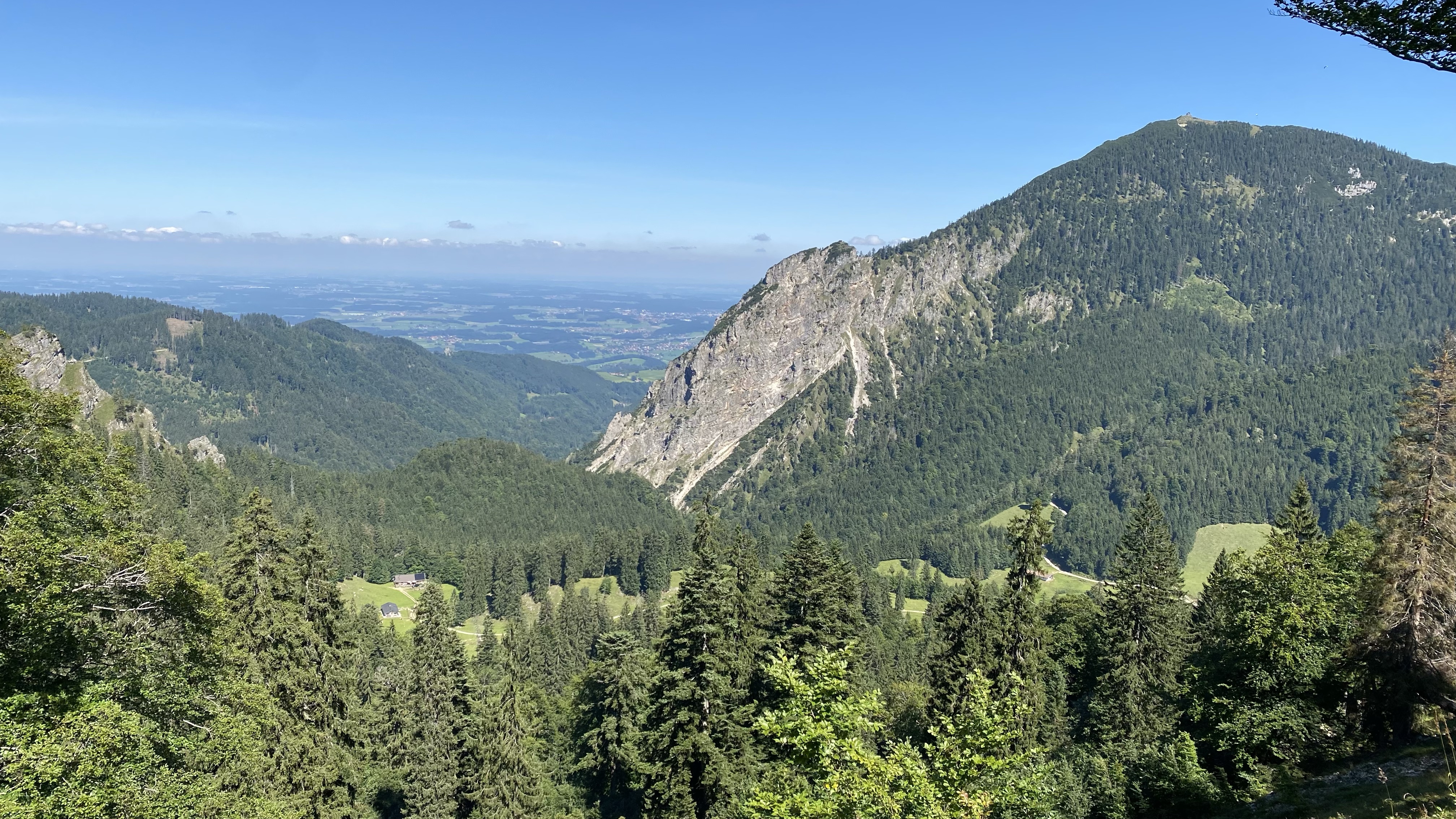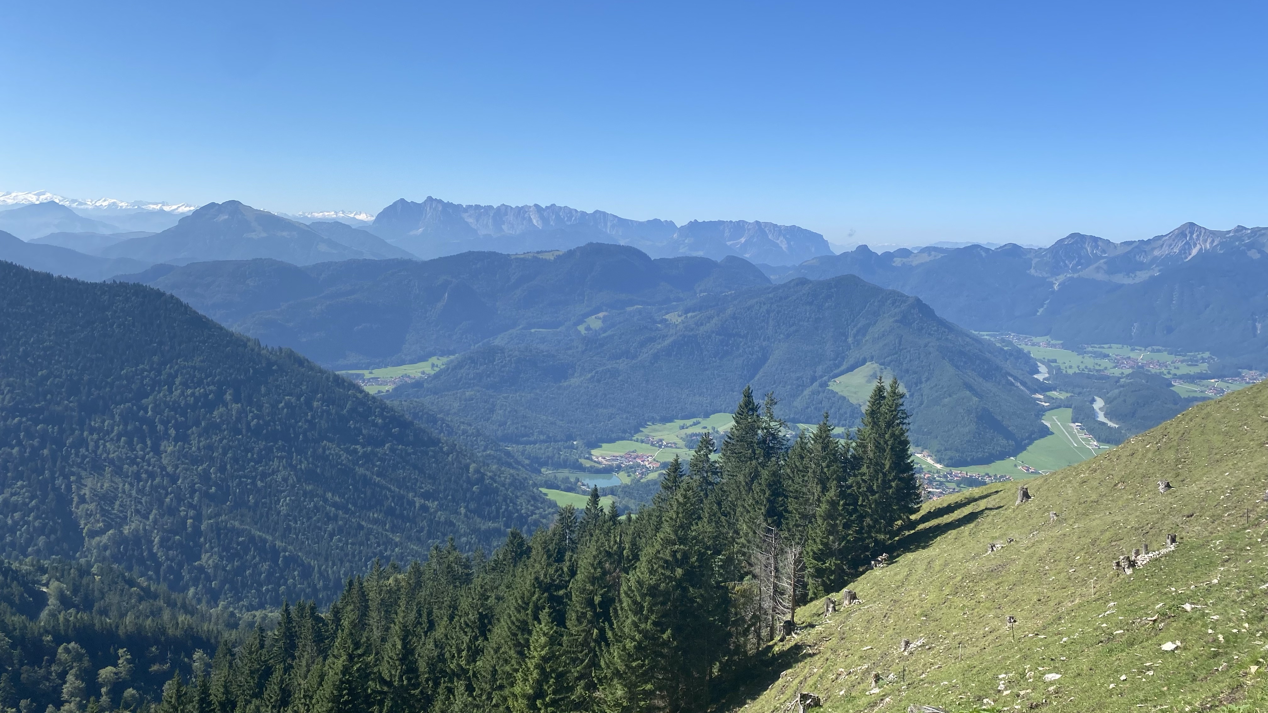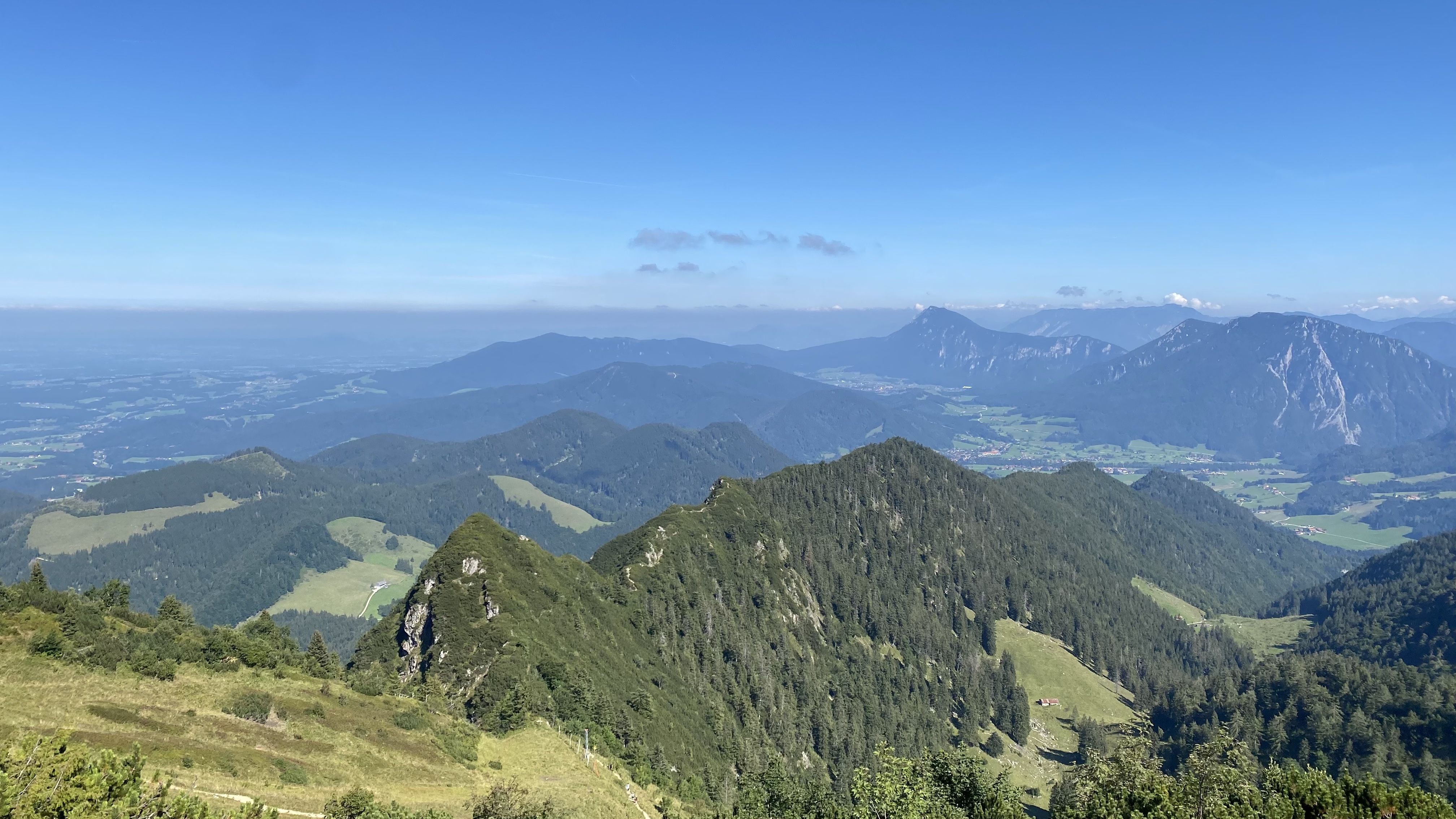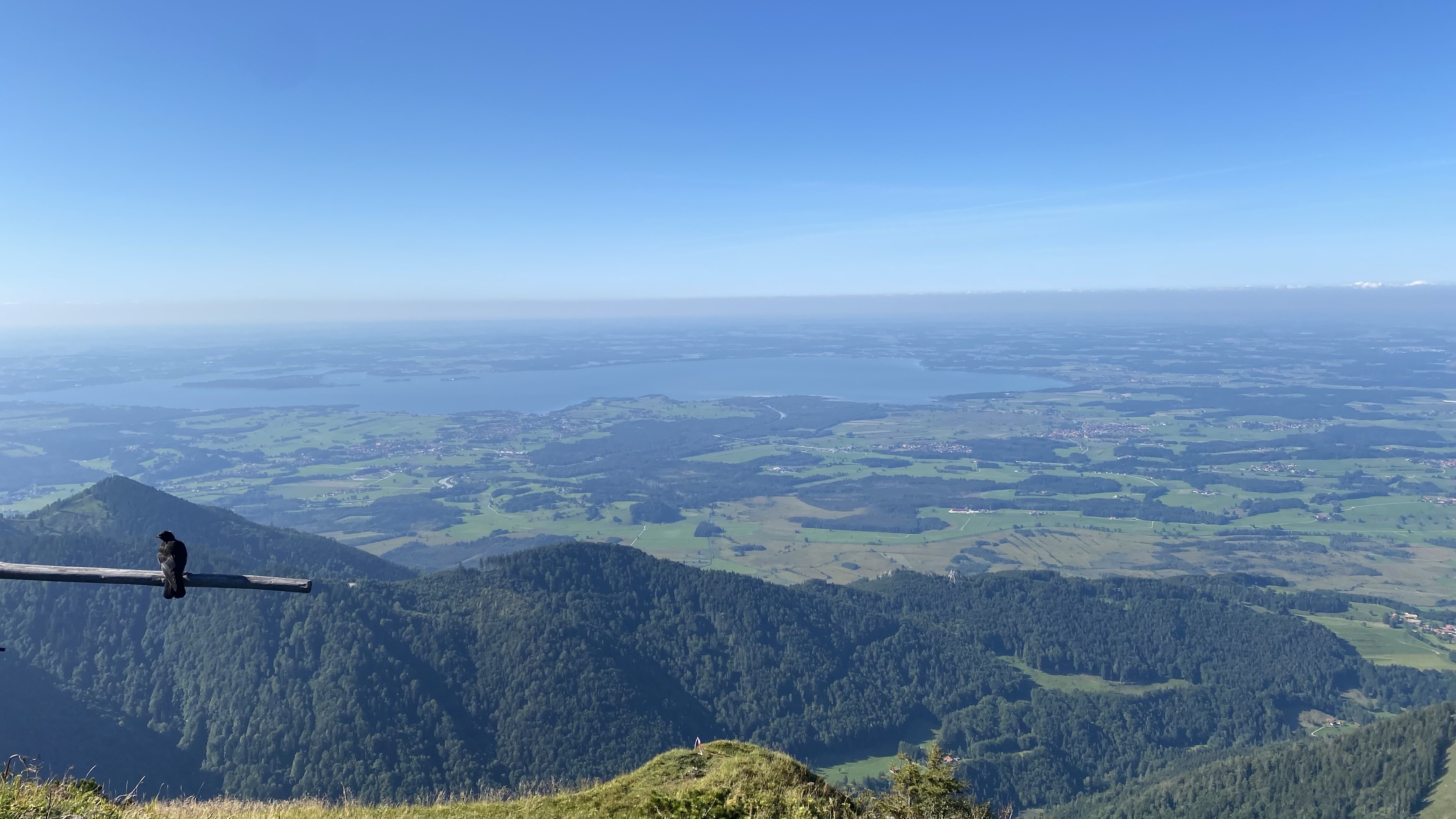 Auch von hier beste Fernsichten in alle Richtungen. Der Chiemsee liegt wie ein großer Spiegel im Tal und gegenüber die endlos scheinenden Bergketten der Alpen.