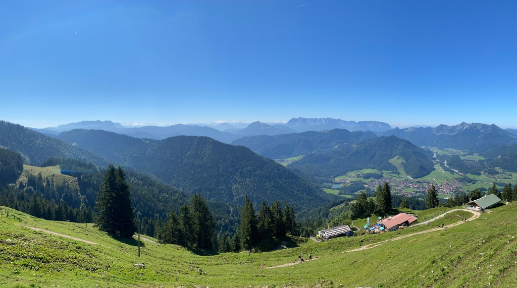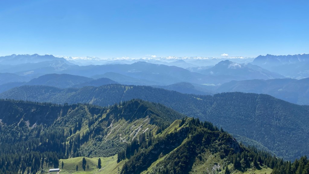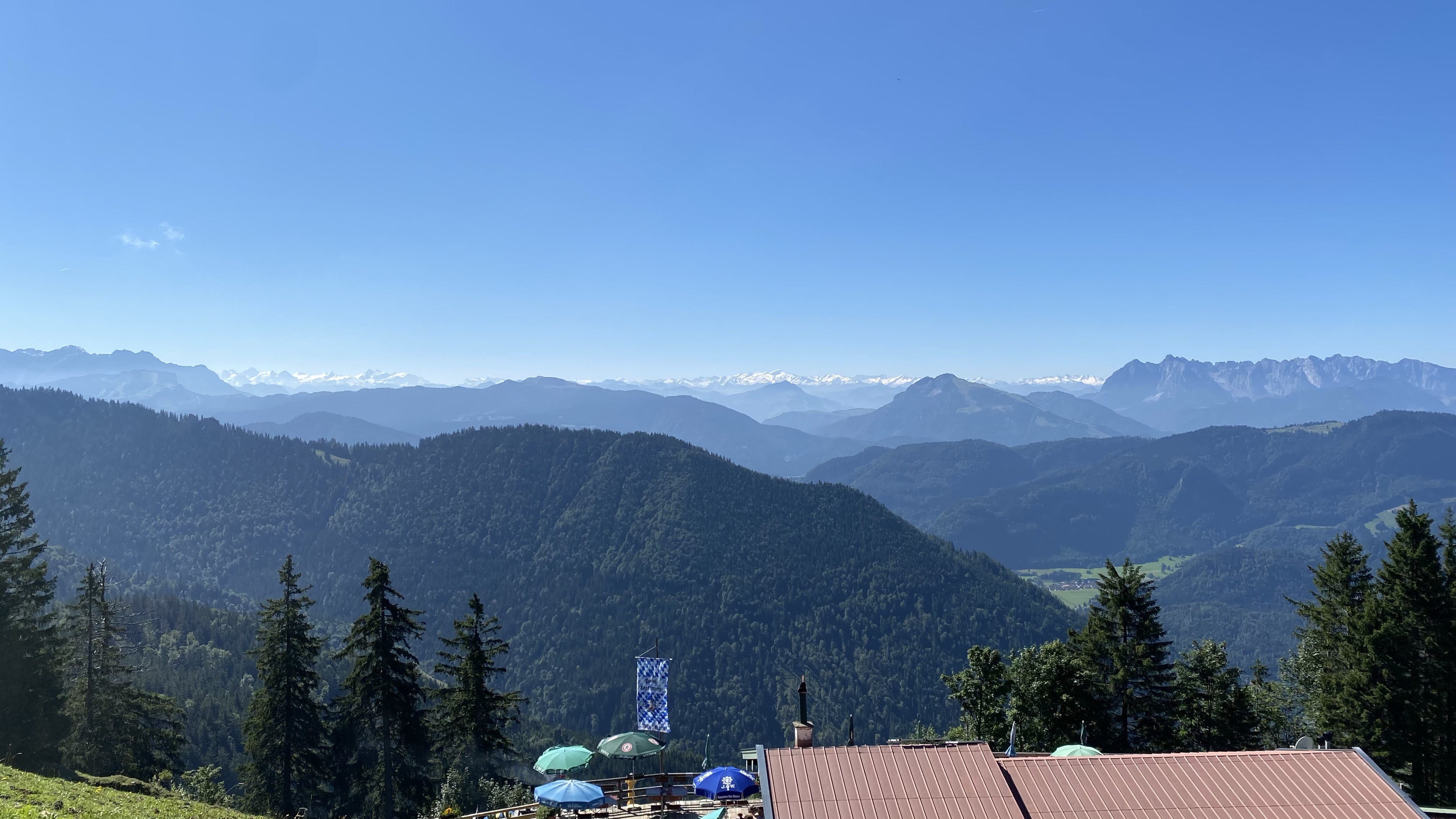 Der Schotterweg endet an der Enzian-Alm bzw. dem Hochgernhaus und schon von hier hat man eine wunderbare Fernsicht über die Alpen und laut Panoramatafeln soll man auch den Großglockner sehen können.