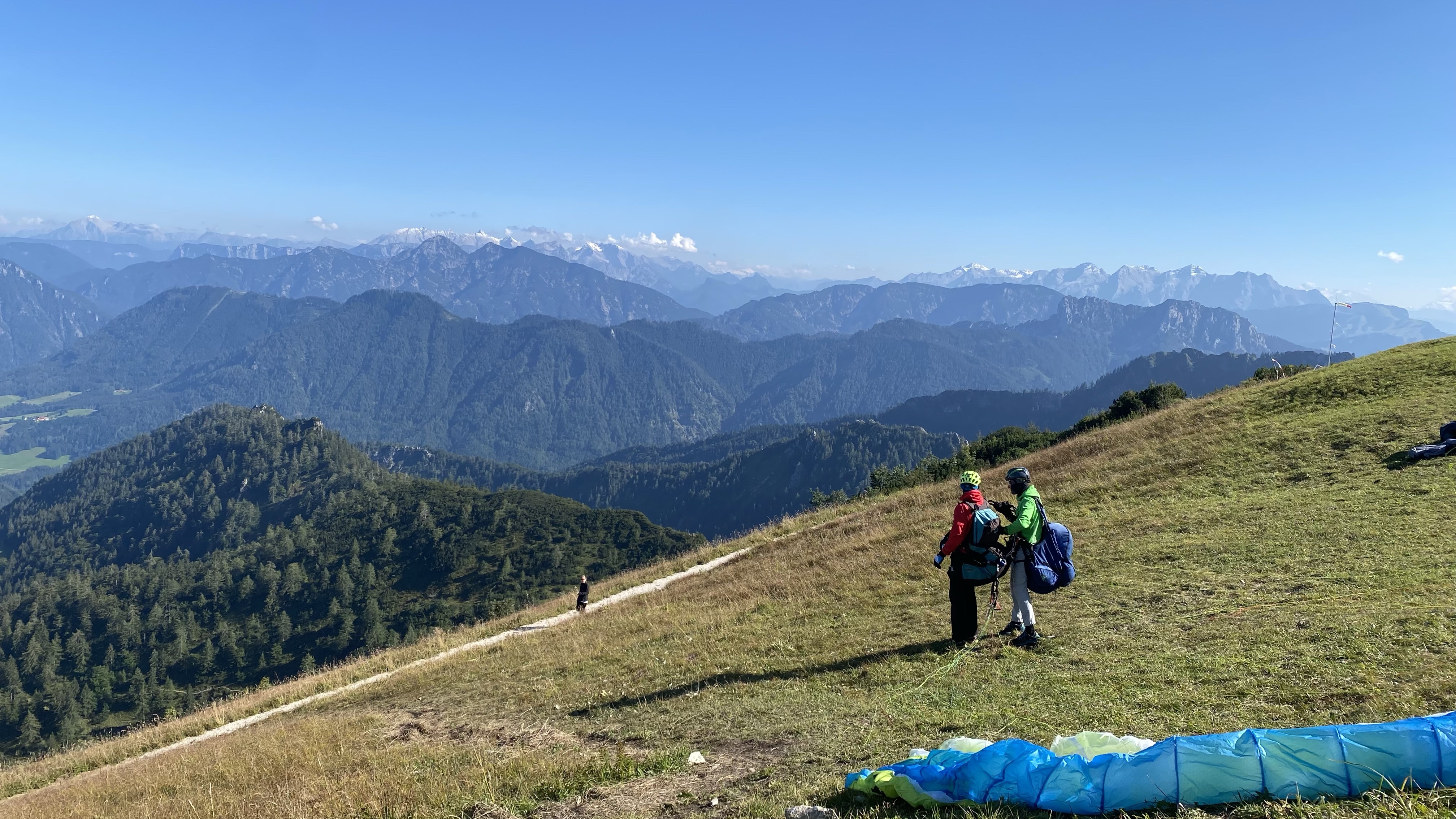 Die Anstrengung lohnt sich. Das Wetter heute ist perfekt, strahlend blauer Himmel und am Gipfel des Hochgern finde ich noch ein freies Plätzchen, um mal richtig Brotzeit machen zu können. Habe ja nicht umsonst knapp ein Kilo Weintrauben, ein halbes Pfund Tomaten und leckeres Brot mit nach oben geschleppt.