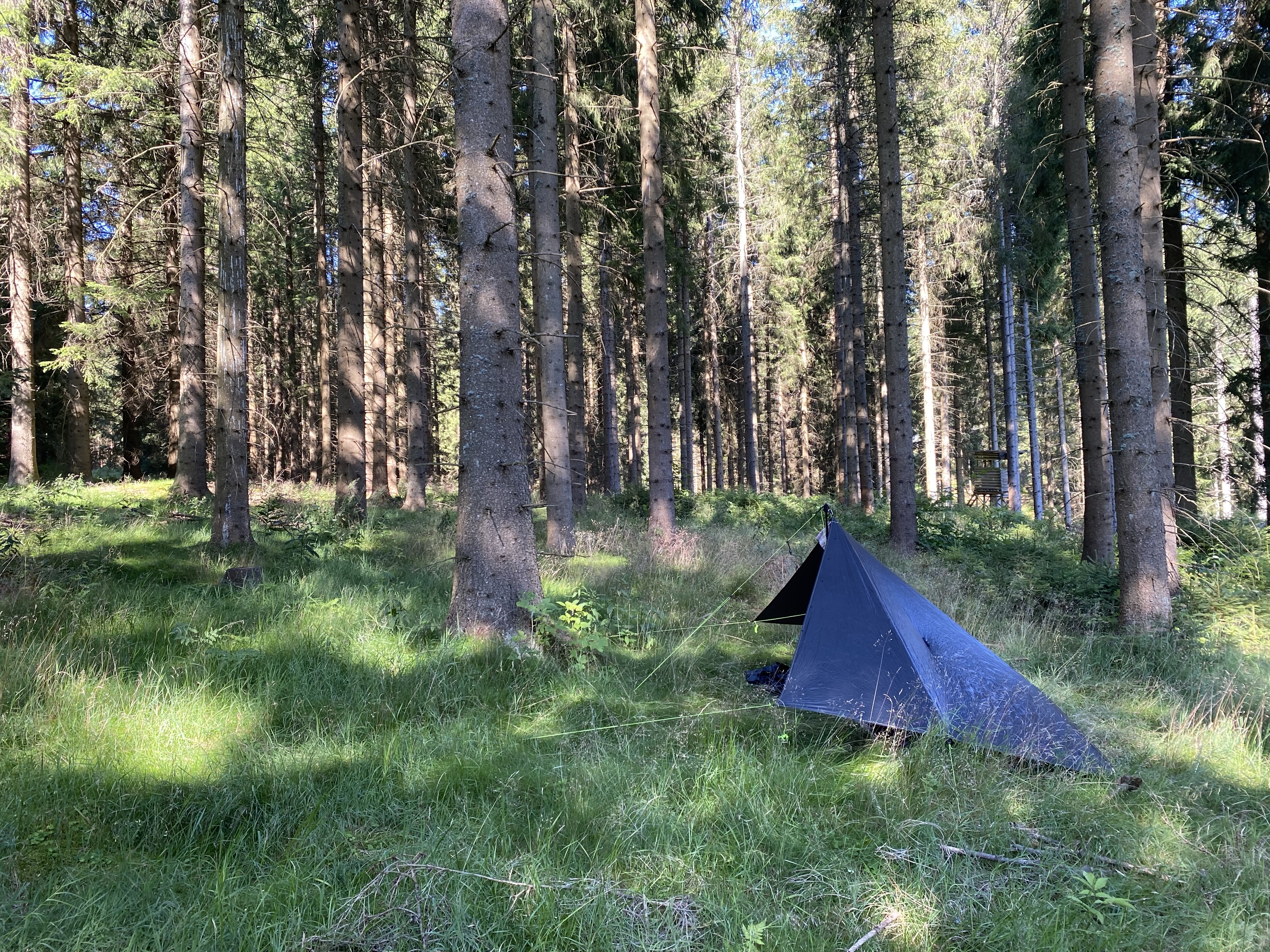 Als ich in einem Waldstück zu weit geradeaus gehe, weil der Weg an dieser Stelle ausnahmsweise mal nicht sehr gut ausgeschildert ist, bleibe ich gleich da und baue mein Tarp zwischen den hohen Nadelbäumen auf einem weichen Grasteppich auf. Es ist erst 16:00 Uhr und ich habe alle Zeit der Welt, um alles Sturm- und regenfest aufzubauen und es mir im Zelt gemütlich zu machen.
