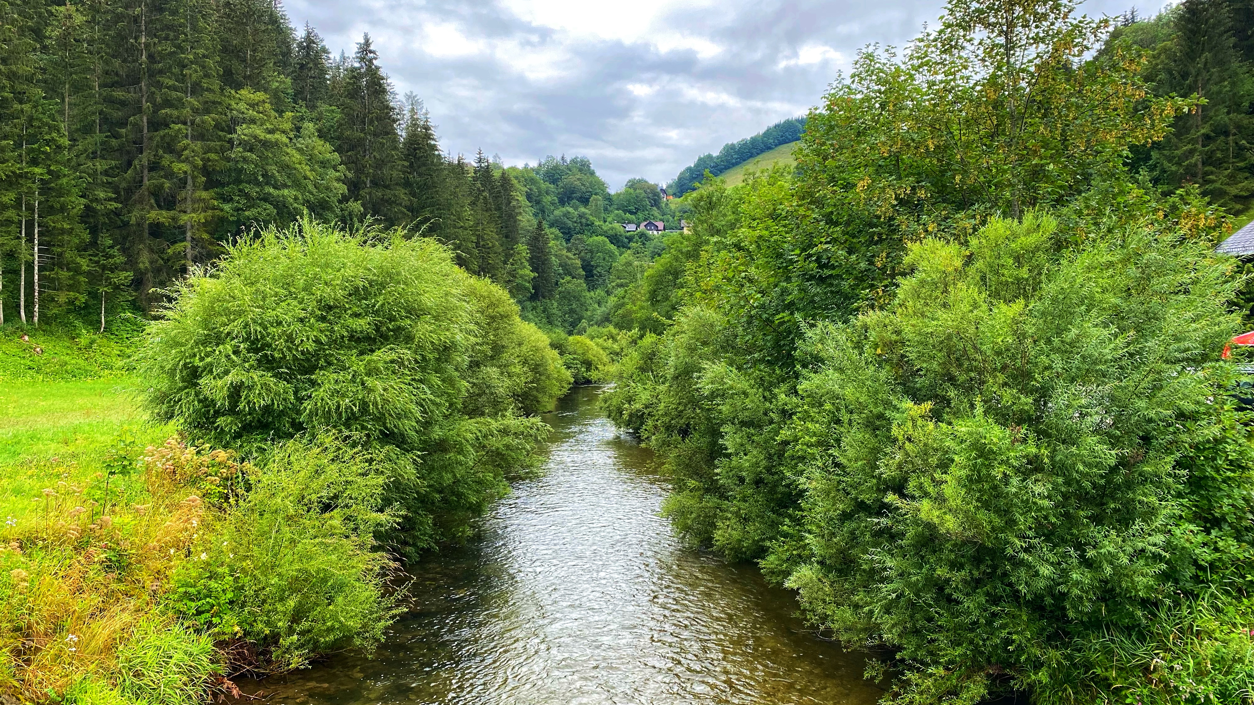 Der Weg führt relativ schnell an einem Bach entlang und trotz des Regens habe ich gute Laune und Freude an der Strecke.