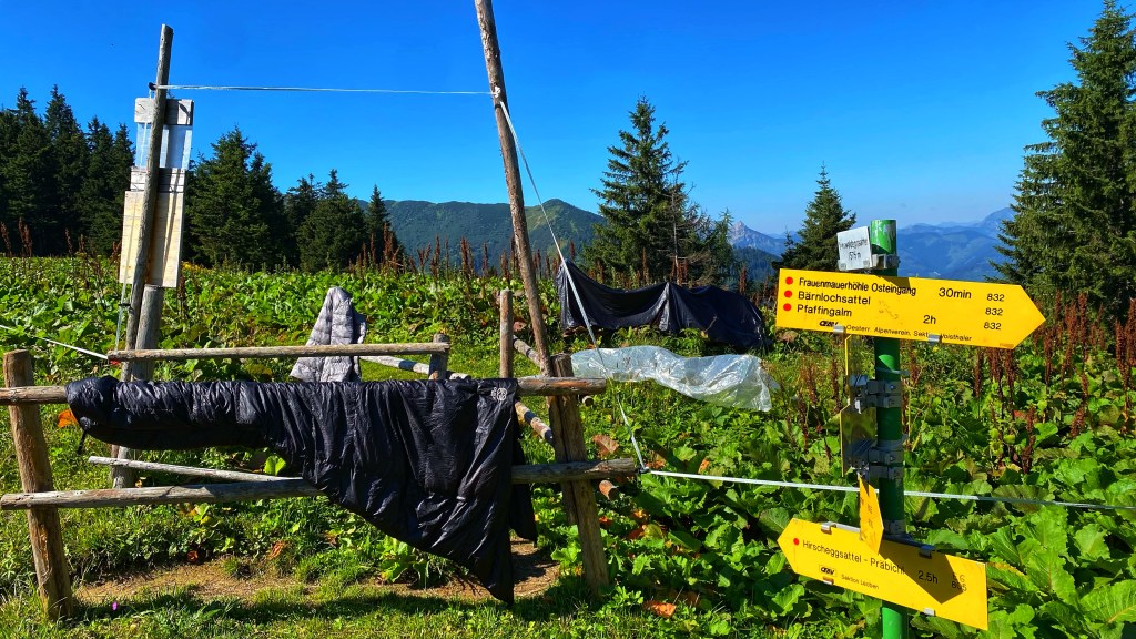 Über die Kulmalm geht es weiter zum Neuwaldeggsattel, dem ersten heutigen Anstieg. Ich schnaufe schon wieder ganz schön und muss Pausen machen, aber ich schaffe es und kann in der prallen Sonne immerhin meine Ausrüstung trocknen. Ich selbst mache im Schatten meines Schirms Pause, dafür ist er einfach unbezahlbar.