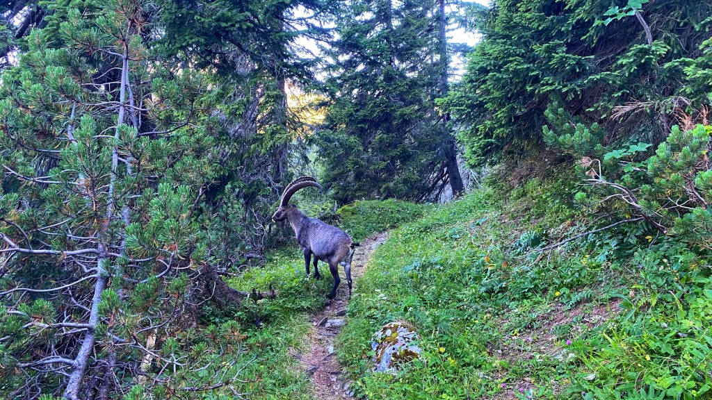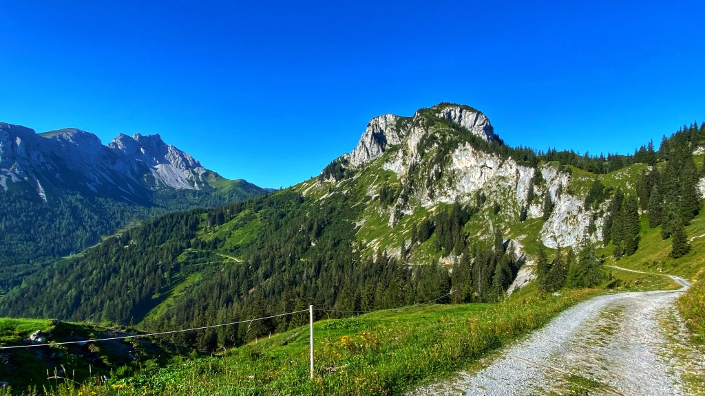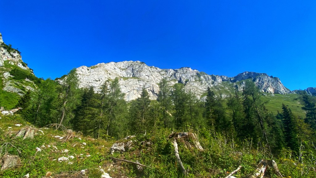 Es geht abwechslungsreich auf engen Pfaden über Almen und durch dicht bewachsene Waldstücke. Auf einem großen Teil des Weges bin ich von riesigen Felswänden beschützt. Die Hörndlmauer thront majestätisch rechts neben dem Weg und bietet Schatten und ein Gefühl der Demut.